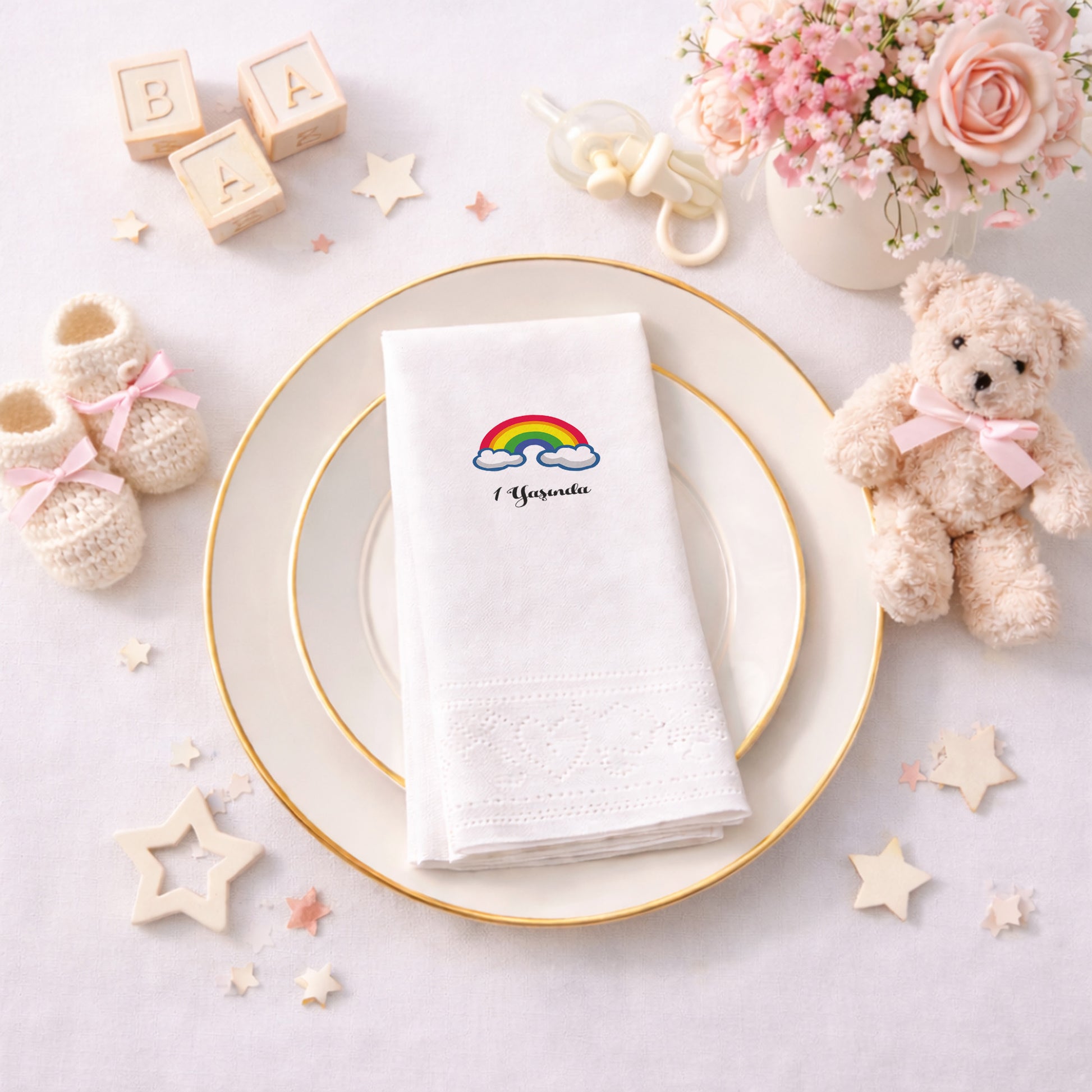 1 Yaşında Gökkuşağı Temalı İlk Yaş Kutlama Peçetesi