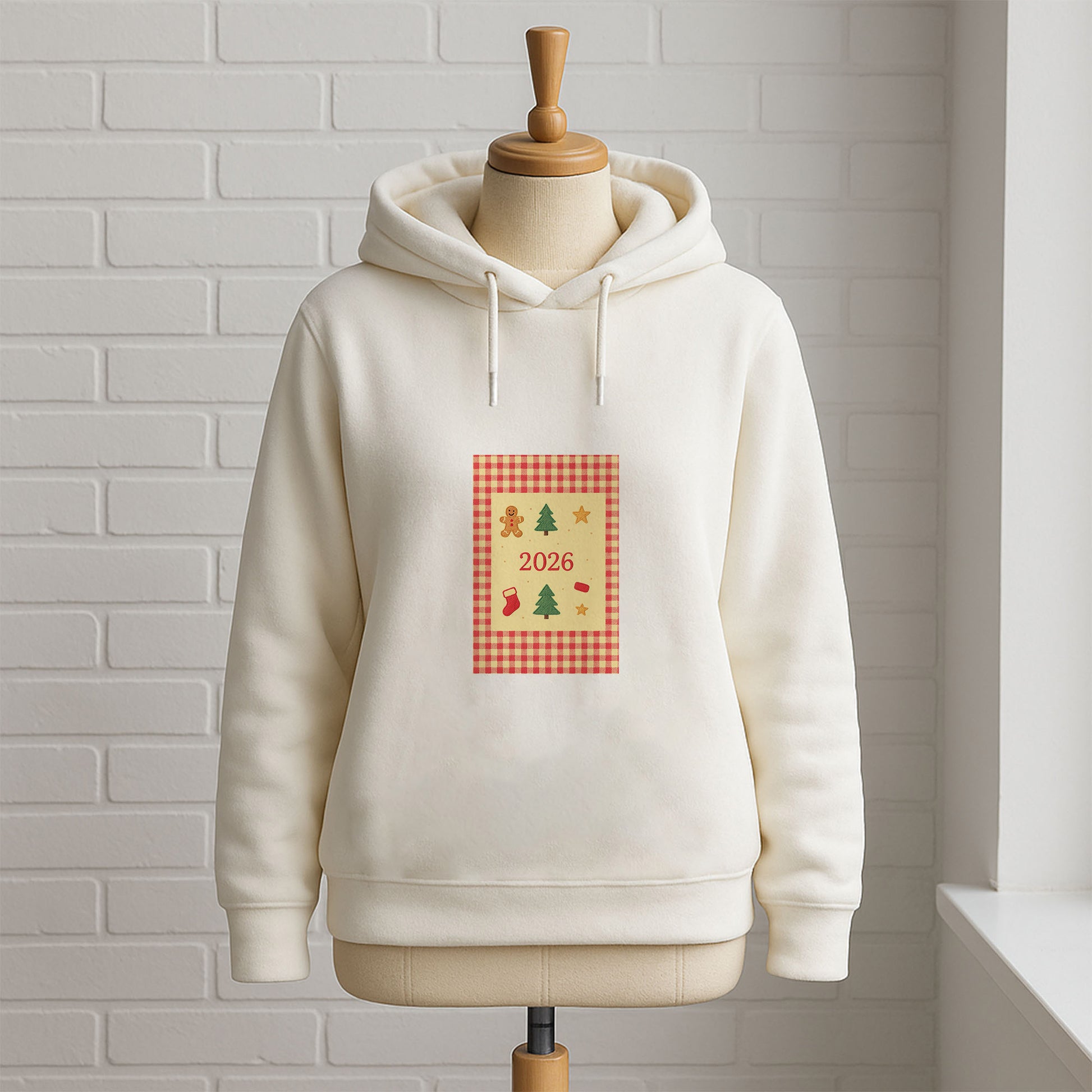 Bu yetişkin sweatshirt, klasik yılbaşı ruhunu modern bir tasarım anlayışıyla buluşturur. Pötikare (gingham) desenli çerçevesi ve kurabiye/keçe dokusu hissi veren figürleri; zencefilli adam, çam ağacı, çorap ve yıldız detaylarıyla sıcak, samimi bir atmosfer oluşturur. Merkezde yer alan “2026” yazısı, ürünü yeni yıla özel ve zamansız bir parça haline getirir.