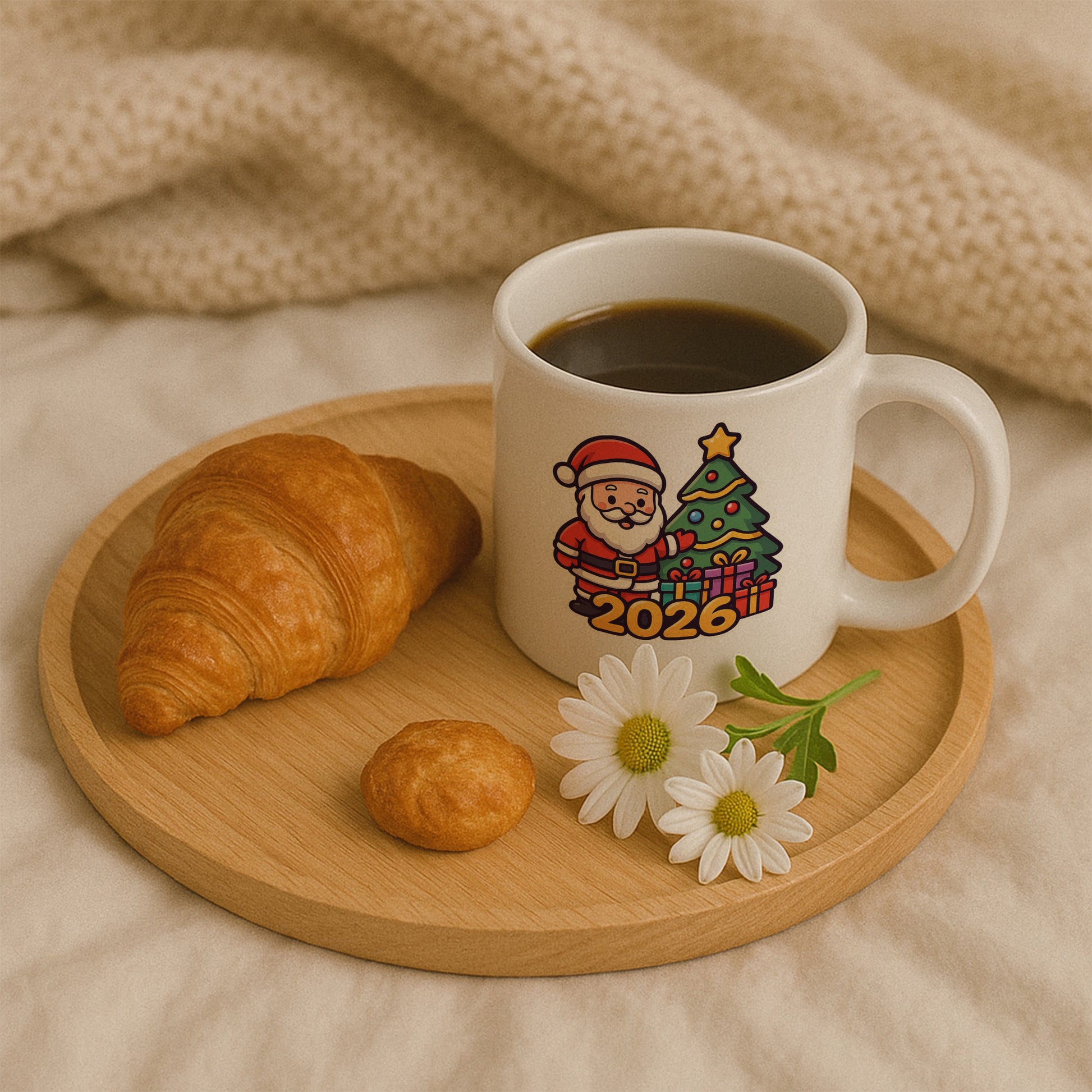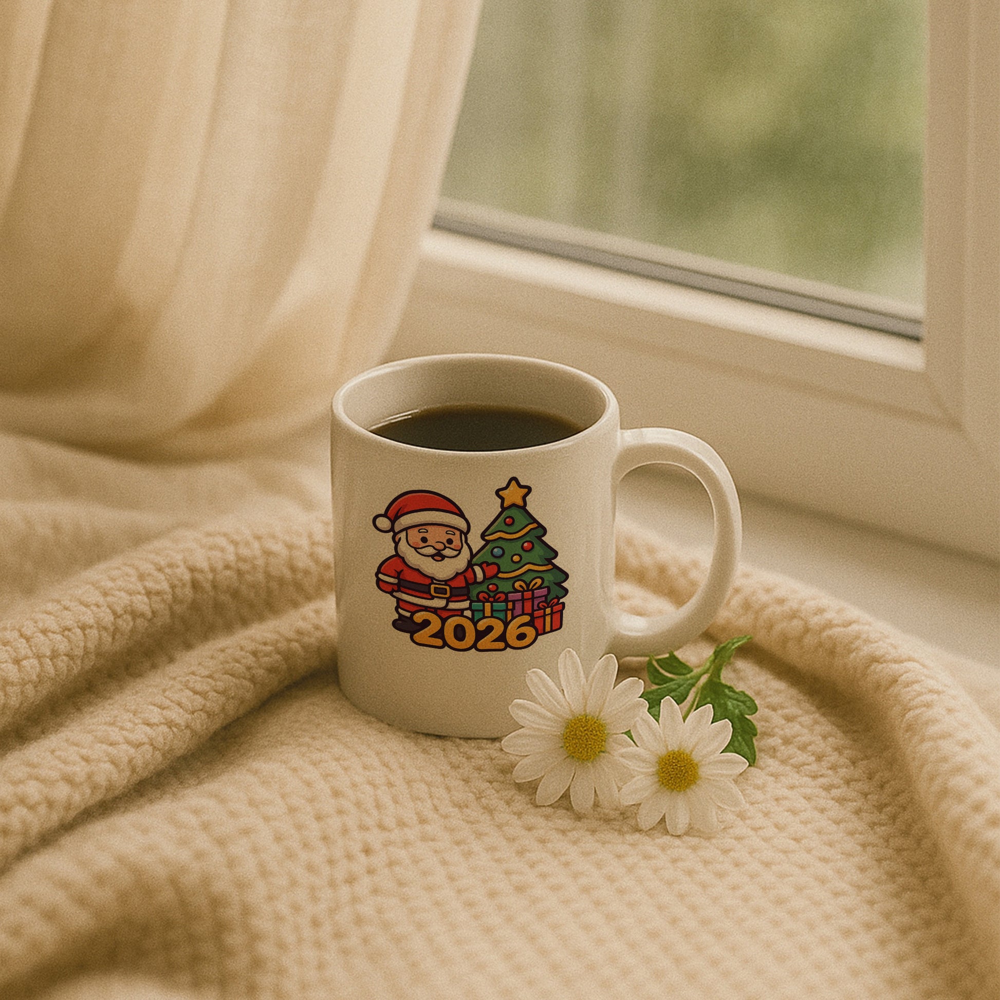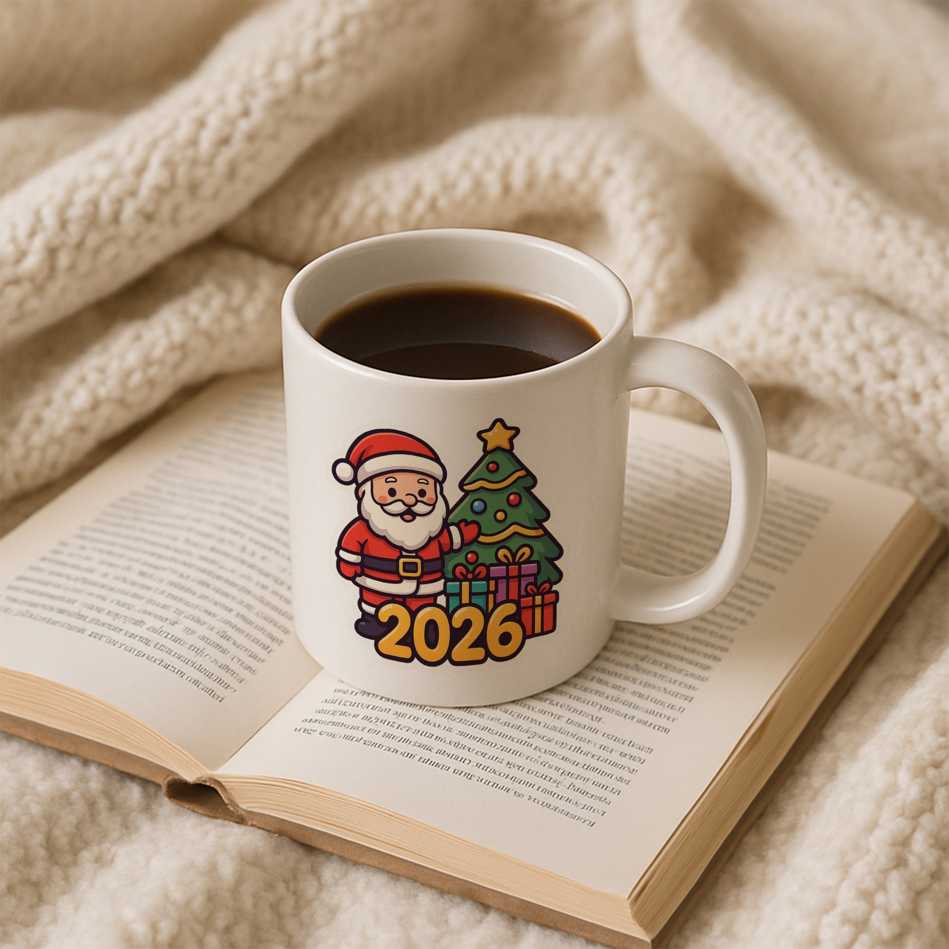 Bu özel tasarım kupa, yeni yılın sıcak ve neşeli atmosferini sofralara taşıyor. Gülümseyen Noel Baba, süslenmiş çam ağacı ve rengârenk hediyelerden oluşan desen, yılbaşı heyecanını keyifli bir görsellikle buluşturur. Üzerindeki 2026 detayı sayesinde yeni yıla özel bir hatıra niteliği taşır.