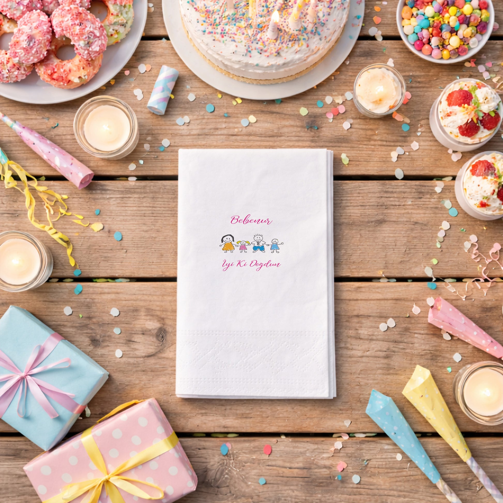 Çocuk çizimi stilinde hazırlanmış aile figürleriyle tasarlanan bu peçete, bebek doğum günü ve aile temalı kutlamalar için neşeli bir masa düzeni sunar. Canlı renkler ve sade çizgiler, samimi bir atmosfer oluşturur. Kişiye özel isim eklenebilmesi, organizasyonu tamamen özgün hale getirir. Çift katlı yapısı sayesinde dayanıklı ve yumuşak bir kullanım sağlar. Gıda temasına uygun baskı ile üretilmiştir. Evde yapılan doğum günü kutlamaları ve aile davetleri için sıcak bir tamamlayıcıdır.