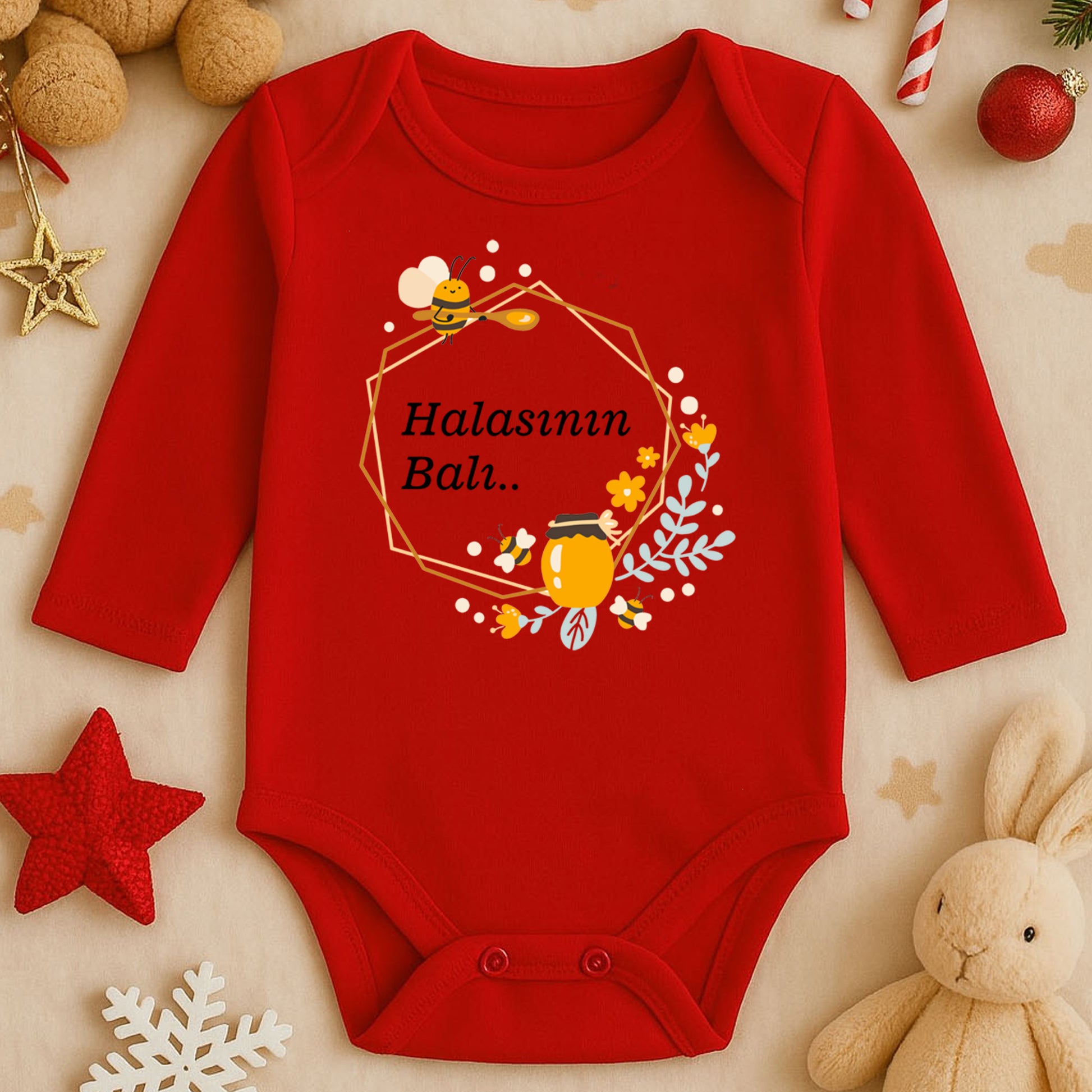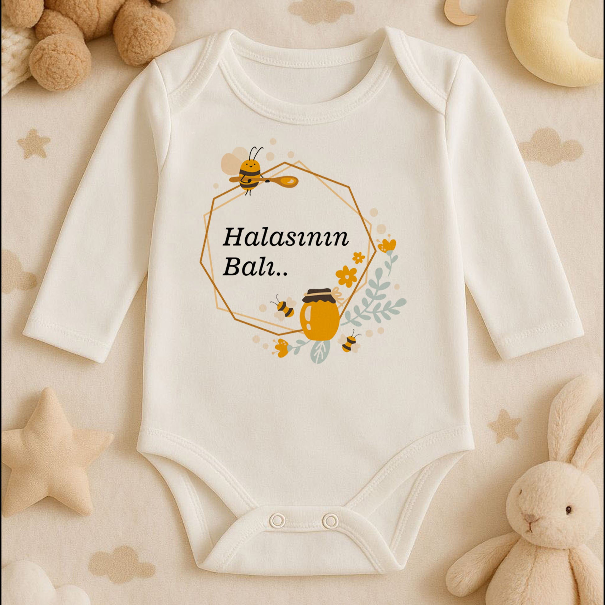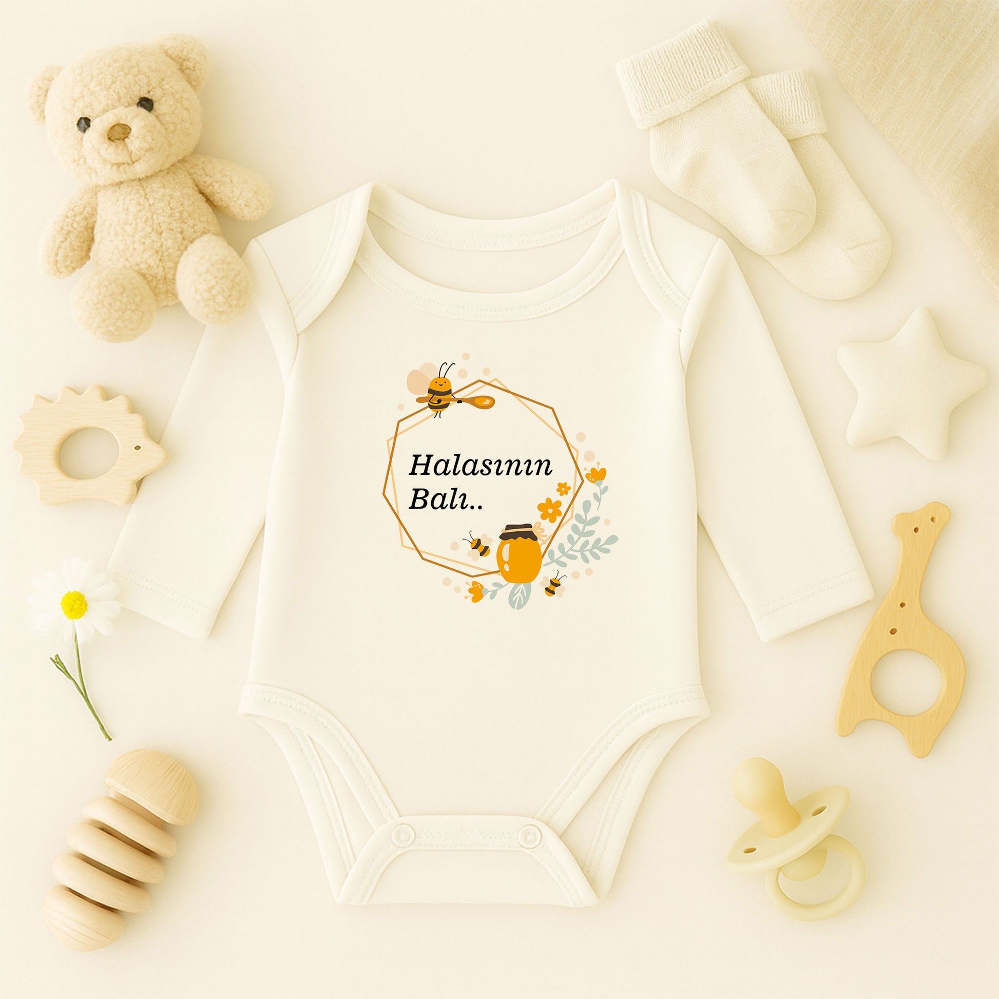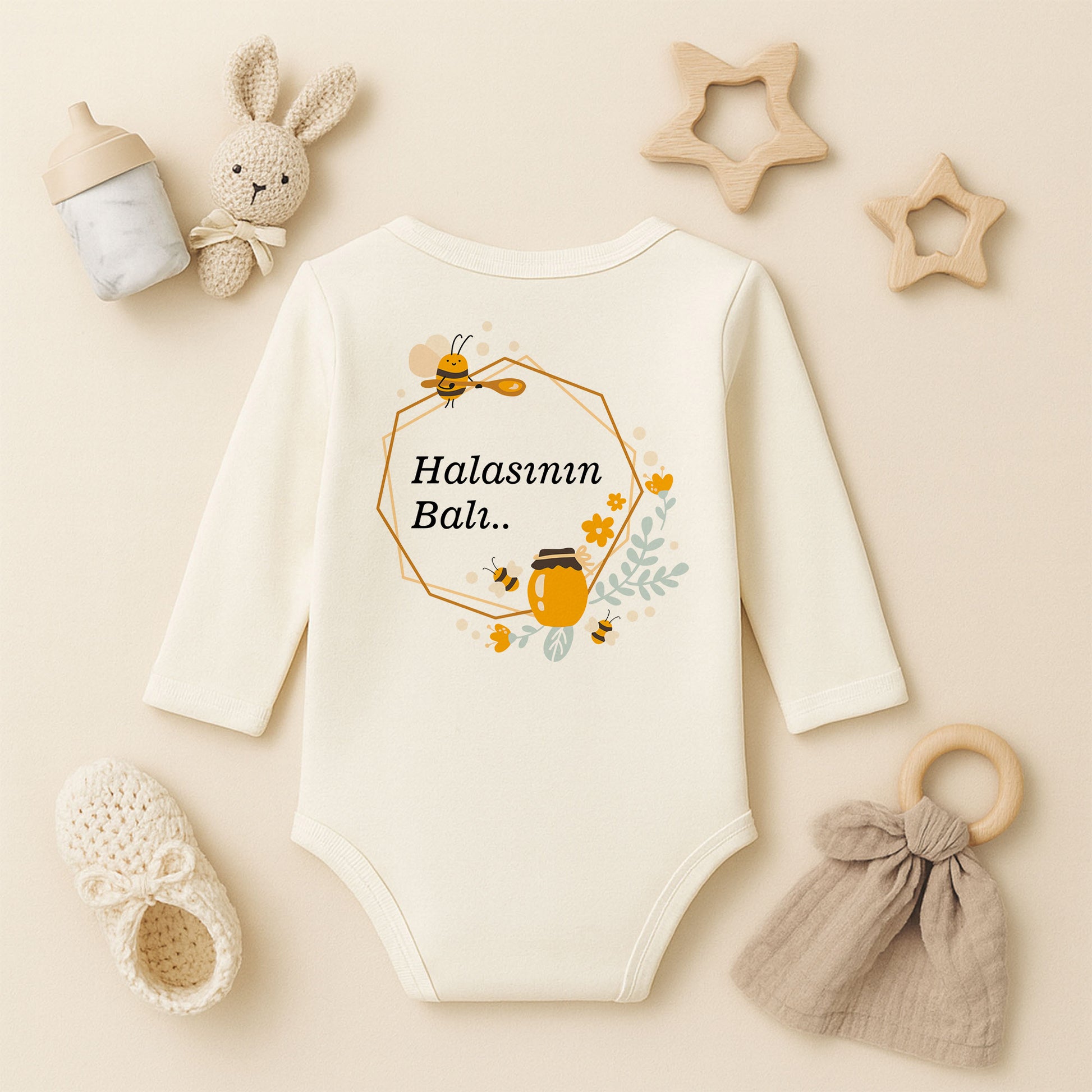 Arı figürleri, bal kavanozu ve çiçek detaylarıyla hazırlanan bu özel bebek zıbını; yumuşak renkleri ve sade çizgileriyle huzurlu bir görünüm sunar. Yazısız yapısı sayesinde zamansızdır ve her stile kolayca uyum sağlar.