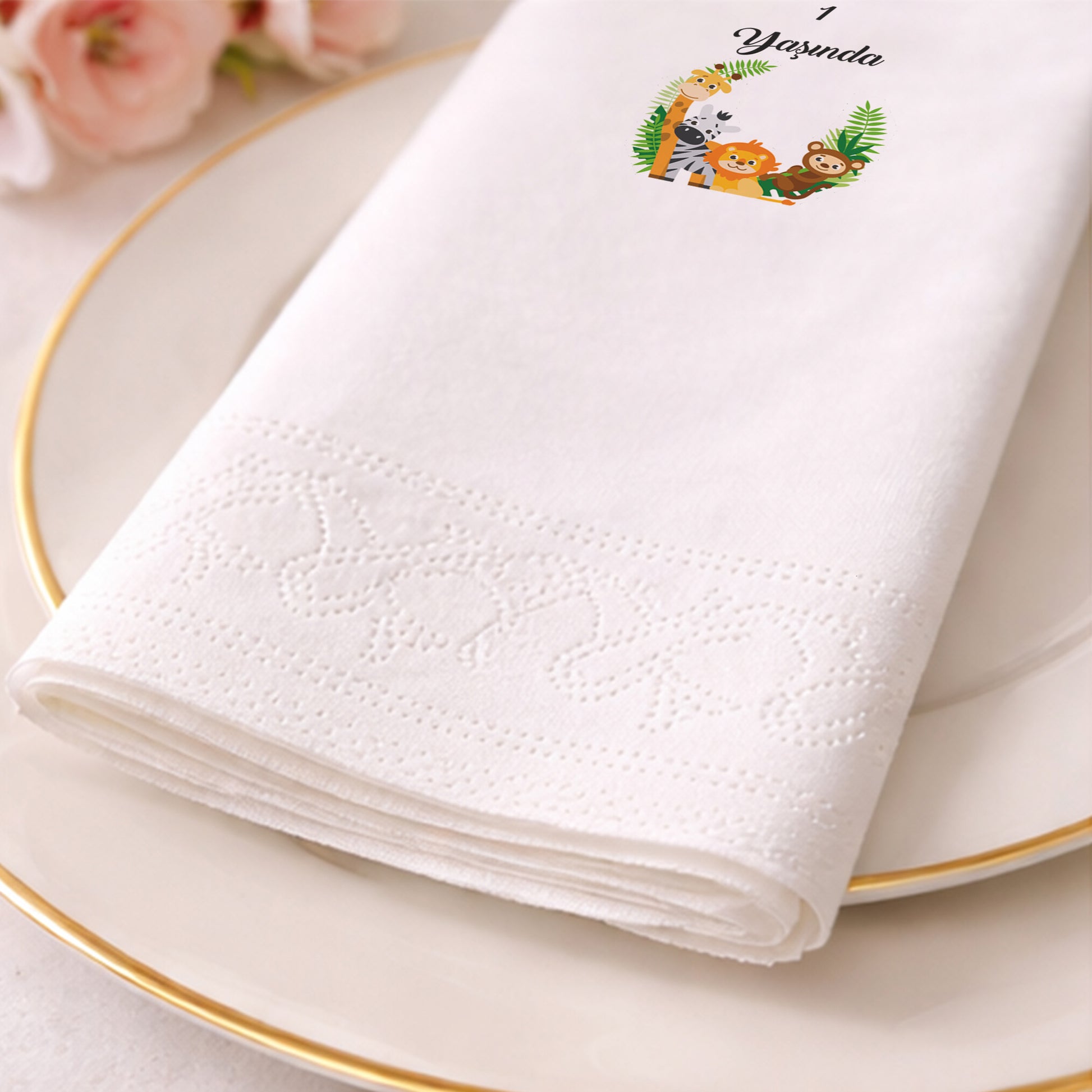 Tasarım, peçetenin ön yüzünde tam merkezde olacak şekilde yüksek çözünürlüklü baskı ile uygulanır. Dilersen özel konumlandırma taleplerini de iletebilirsin.