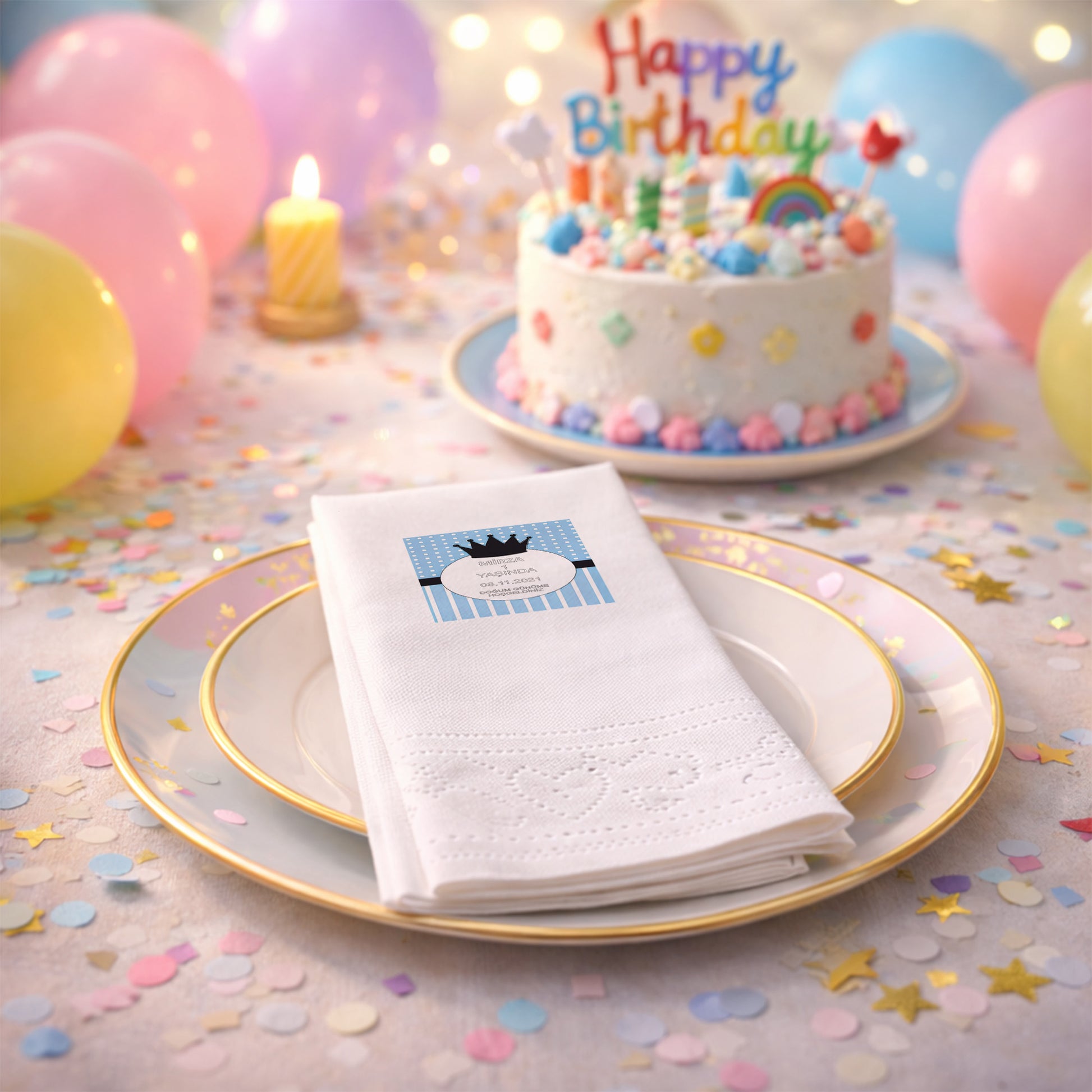 Ay üzerinde uyuyan ayıcık illüstrasyonu ile tasarlanan bu peçete, kız bebek için düzenlenen hoş geldin bebek ve mevlit organizasyonlarına masalsı bir hava katar. Kişiye özel isim eklenerek hazırlanan tasarım, misafirlerinize anlamlı bir sunum yapmanızı sağlar. Pastel sarı ve pembe tonları masa düzeninde sıcak bir atmosfer oluşturur. Çift katlı ve yumuşak dokulu yapısı ile kullanımı rahattır. Gıda temasına uygun baskı teknolojisi ile üretilmiştir. Zarif ve duygusal sunumlar için ideal bir tercihtir.