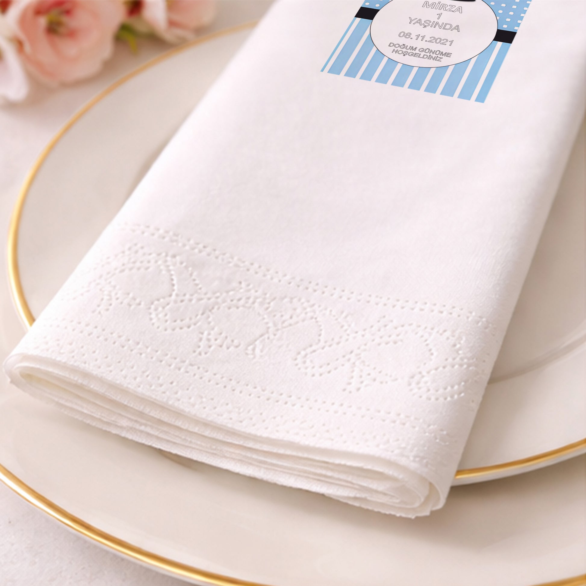 Tasarım, peçetenin ön yüzünde tam merkezde olacak şekilde yüksek çözünürlüklü baskı ile uygulanır. Dilersen özel konumlandırma taleplerini de iletebilirsin.