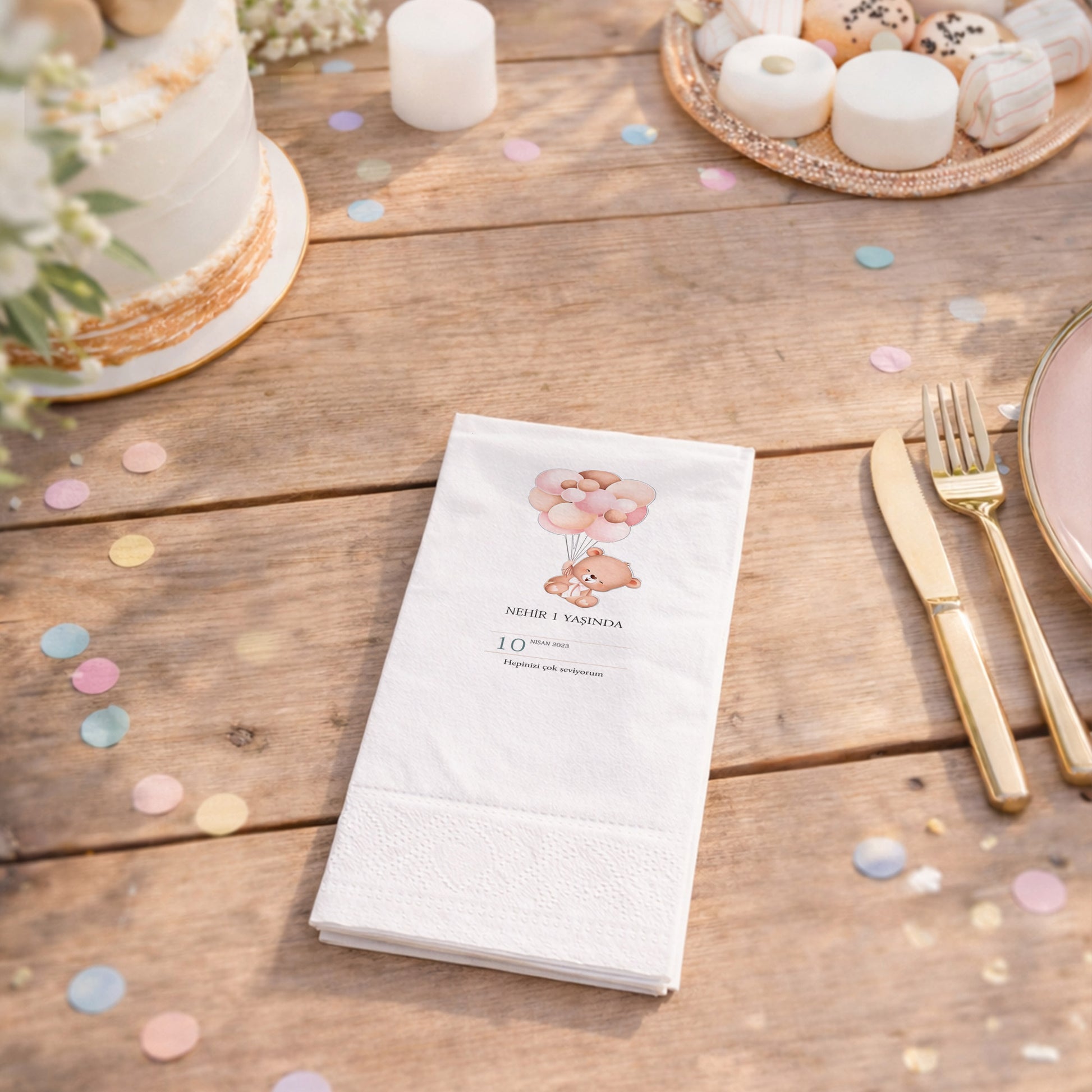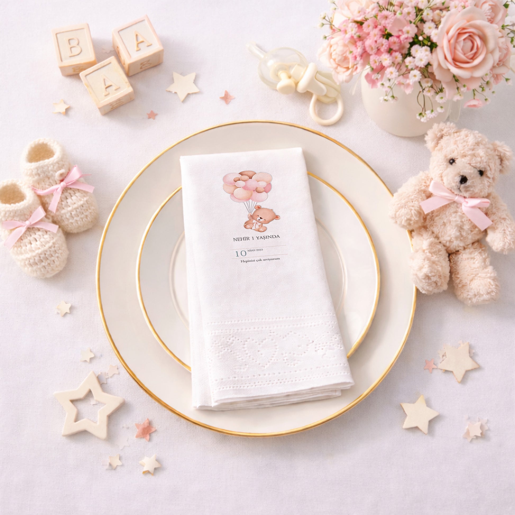 Balonlu Ayıcık Temalı Kız Bebek 1 Yaş Peçetesi