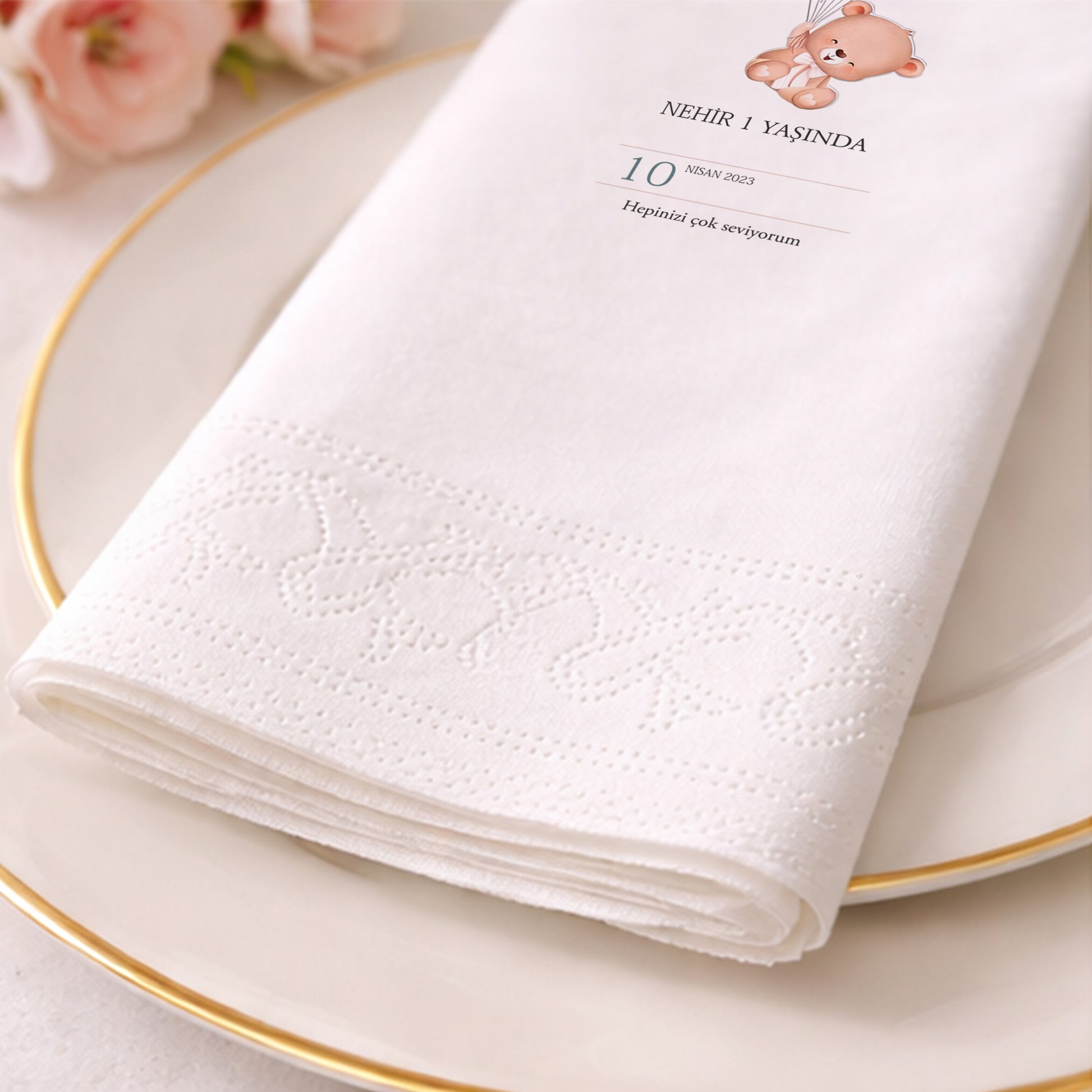 Balonlar eşliğinde tasarlanmış ayıcık figürü, bu peçeteyi kız bebek 1 yaş doğum günü organizasyonları için sevimli bir seçenek haline getirir. Kişiye özel isim ve yaş bilgisi eklenerek hazırlanan tasarım, masa sunumlarınızı tamamen özgün kılar. Pudra ve pastel tonları, zarif ve sıcak bir atmosfer oluşturur. Çift katlı ve yumuşak dokulu yapısı sayesinde hem estetik hem de pratiktir. Gıda temasına uygun baskı teknolojisi kullanılarak üretilmiştir. Doğum günü pastası ve ikram masalarında konsepti tamamlayan şık bir detaydır. Ev kutlamaları ve baby shower organizasyonları için idealdir.