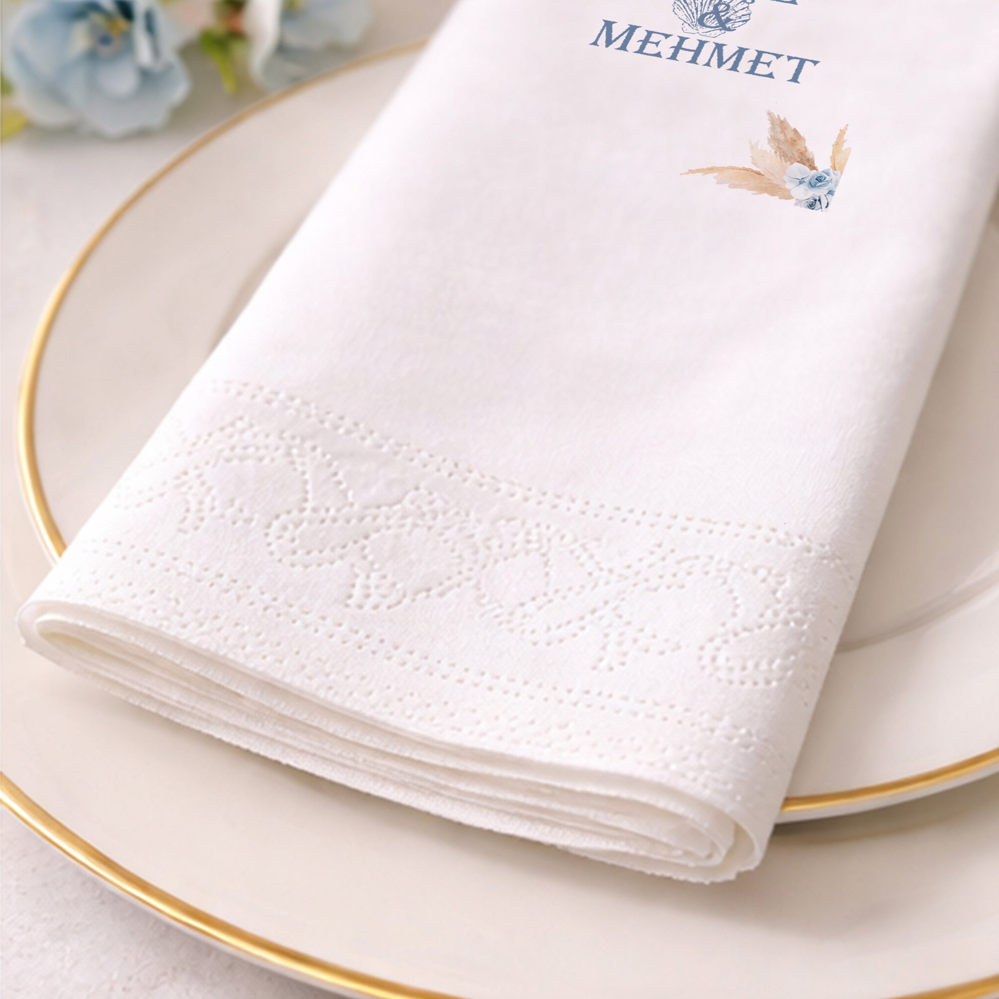 Masalarınızda zarafeti ve doğallığı bir araya getiren bu özel tasarım peçete, bohem detayları ve pastel tonlardaki çiçekleriyle nişan veya düğün organizasyonunuzun unutulmaz bir parçası olacak. Ayşe ve Mehmet çiftine özel olarak hazırlanan bu tasarım, yumuşak dokulu premium kağıt kalitesiyle misafirlerinize konfor sunarken, görsel şıklığıyla da dekorasyonunuzu tamamlar. Deniz kabuğu amblemi ve şık tipografisi ile sahil düğünleri veya bahçe konseptli davetler için ideal bir tercihtir. Kişiye özel baskılı peçete koleksiyonumuzun bu nadide parçası, en özel gününüzde her detayın kusursuz görünmesini sağlar. İster yemekli bir davet, ister şık bir kokteyl masası olsun, bu baskılı peçeteler sunumunuza profesyonel ve romantik bir dokunuş katar. Dayanıklı yapısı ve yüksek baskı kalitesiyle organizasyon peçetesi arayışınızda şıklığı ön plana çıkarır.