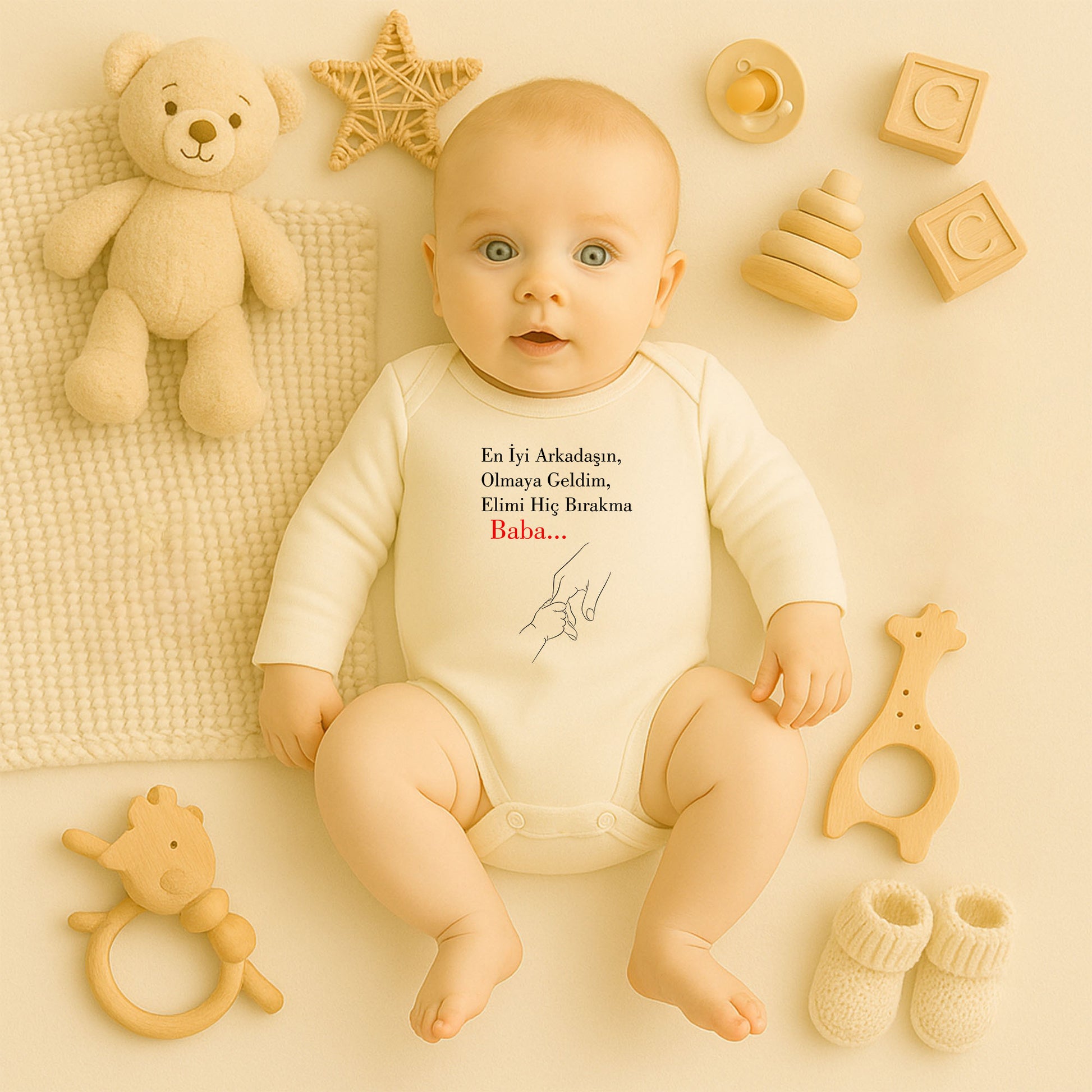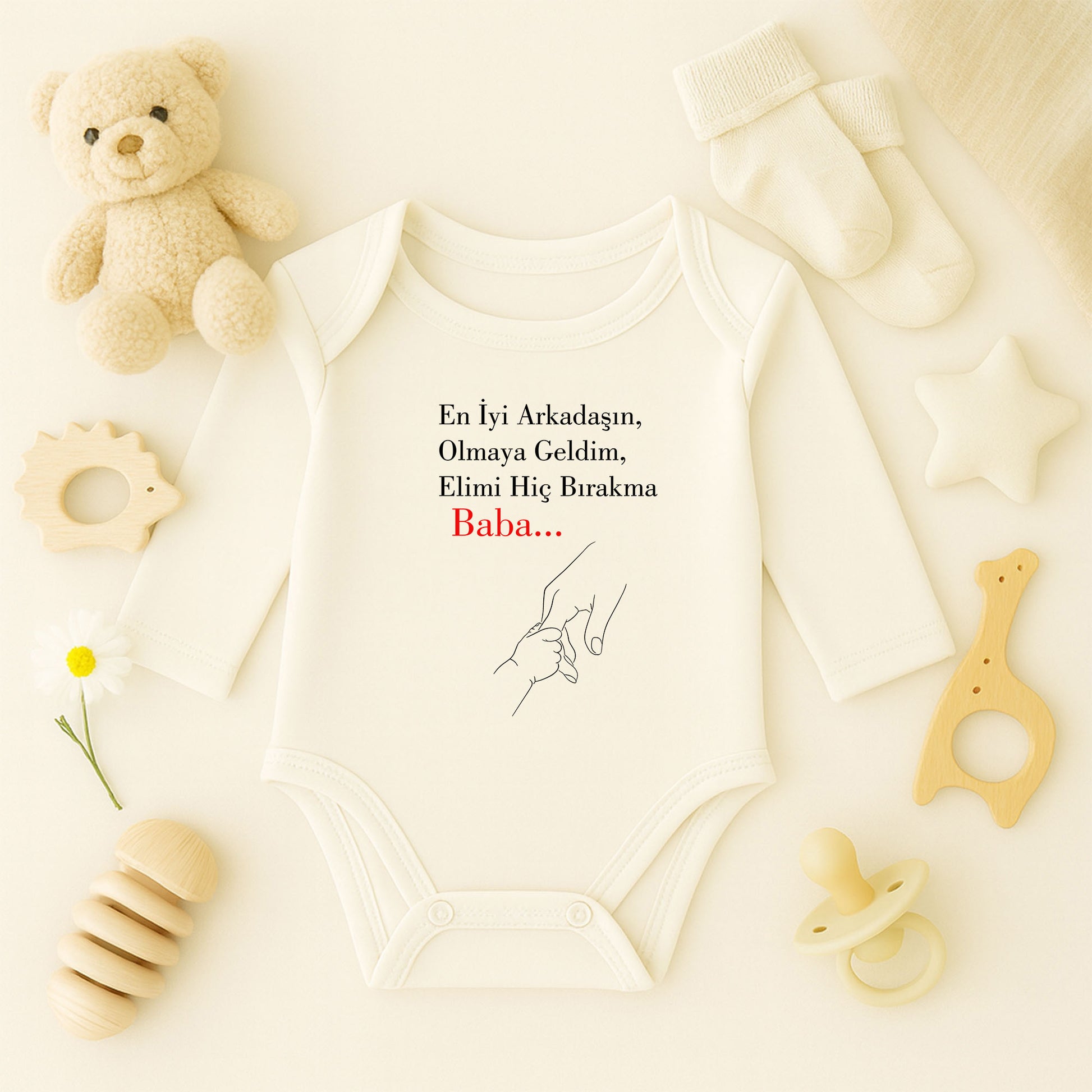 “Baba…” yazısı ve baba–bebek el ele minimal çizimiyle hazırlanan bu bebek zıbını, duyguyu tek kelimeyle anlatan özel bir tasarımdır. Siyah zemin üzerindeki sade çizgiler ve kırmızı yazı detayıyla güçlü bir anlam taşır. 1–36 ay beden seçenekleriyle uzun süreli kullanım sunar. DTF baskı teknolojisi sayesinde baskı netliğini ve dayanıklılığını uzun süre korur.