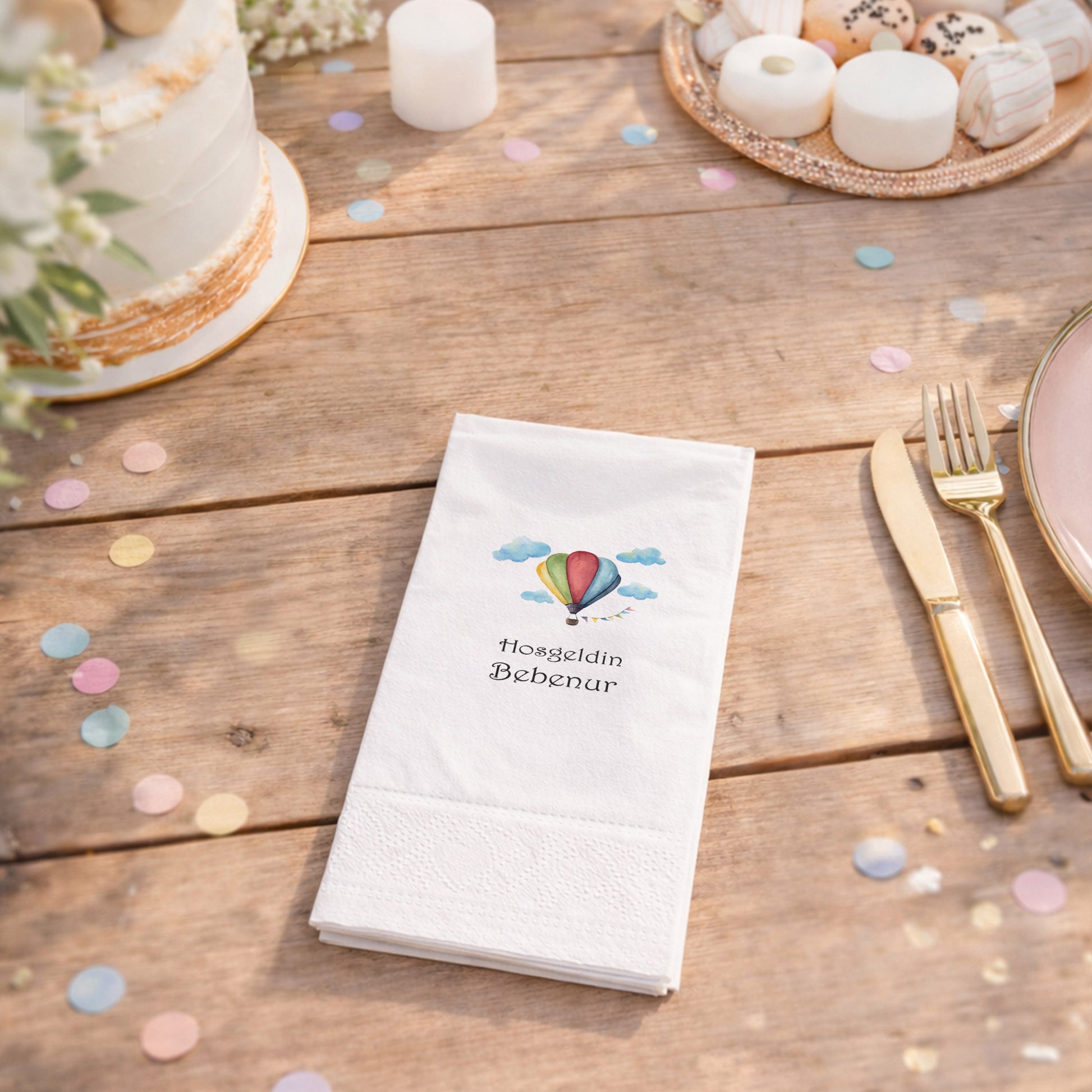 Balon tutan fil figürü ve yumuşak pastel renkleriyle tasarlanan bu peçete, kız bebek yenidoğan ziyareti ve baby shower organizasyonları için zarif ve sevimli bir masa düzeni sunar. Minimal tasarımı sayesinde masa üzerinde sade bir şıklık oluşturur. Kişiye özel isim bilgisi eklenerek hazırlanan ürün, organizasyonu tamamen özgün hale getirir. Çift katlı yapısı sayesinde dayanıklı ve yumuşak bir kullanım sağlar. Gıda temasına uygun baskı teknolojisi kullanılmıştır. Evde yapılan samimi kutlamalar ve özel davetler için ideal bir masa tamamlayıcısıdır.