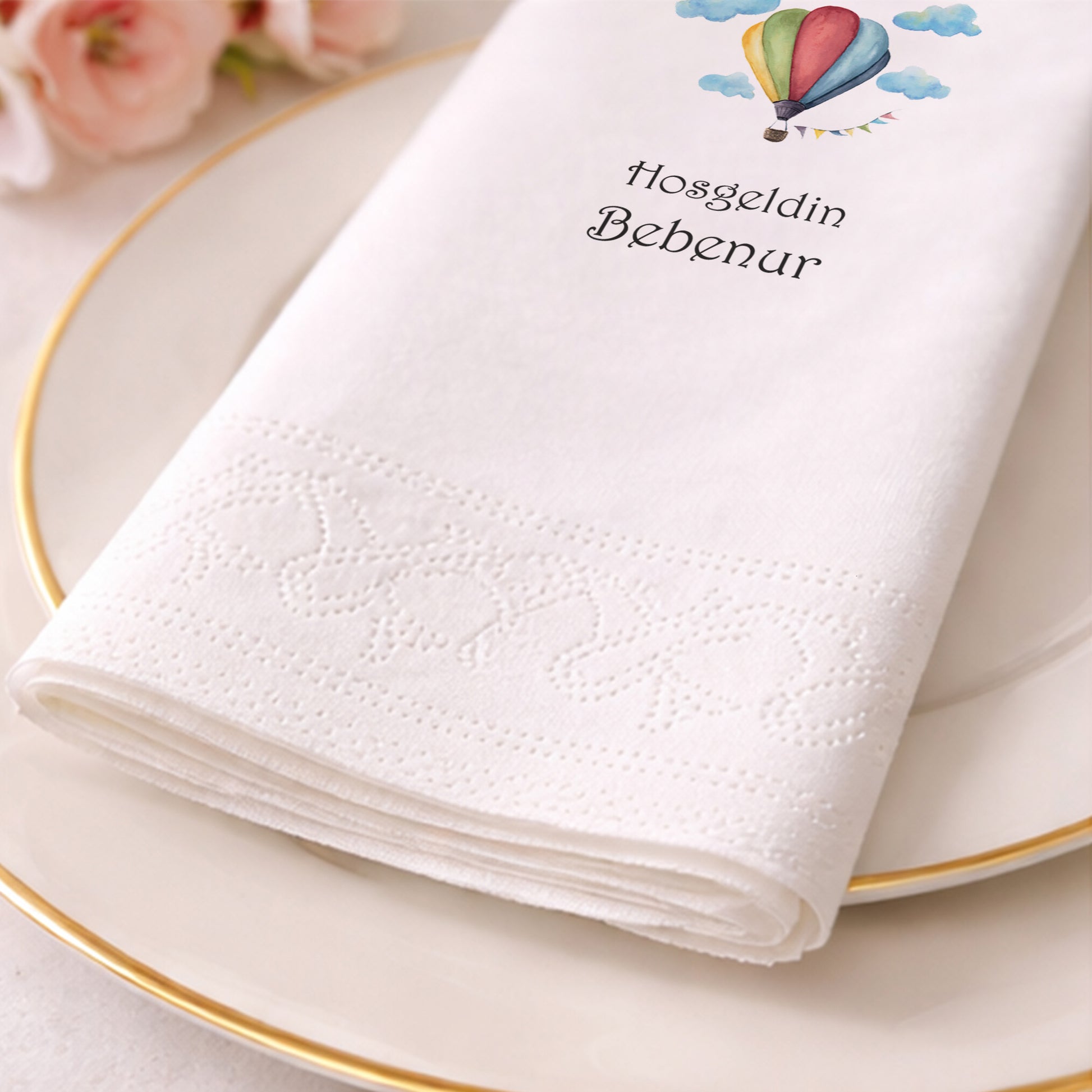 Tasarım, peçetenin ön yüzünde tam merkezde olacak şekilde yüksek çözünürlüklü baskı ile uygulanır. Dilersen özel konumlandırma taleplerini de iletebilirsin.