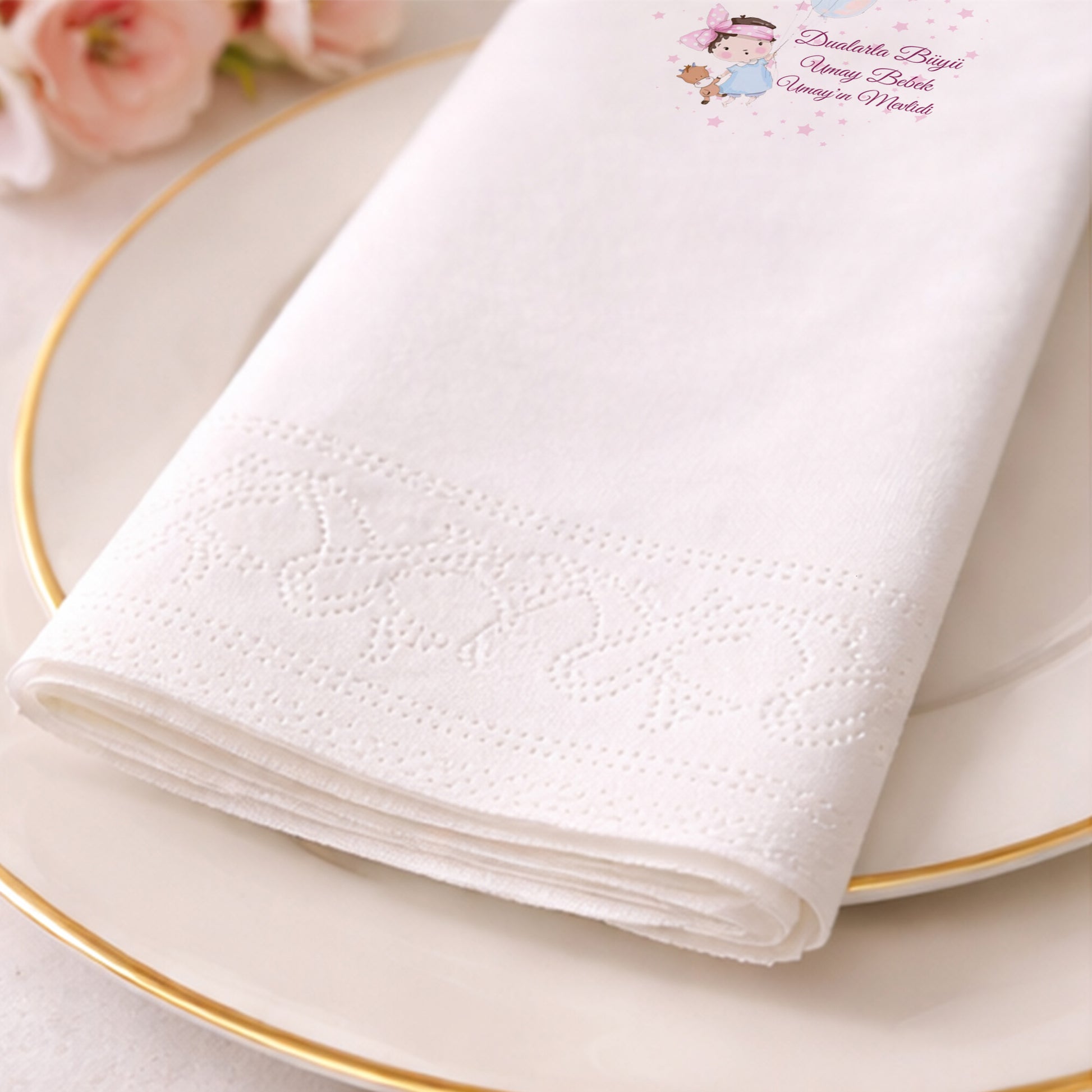 Balonlar eşliğinde tasarlanmış sevimli kız bebek illüstrasyonu, bu özel gün peçetesini baby shower ve bebek mevlidi organizasyonları için sıcak bir seçenek haline getirir. Kişiye özel isim bilgisi eklenerek hazırlanan tasarım, misafirlerinize anlamlı bir hatıra sunar. Yumuşak renk geçişleri ve zarif detayları sayesinde masa düzeninde huzurlu bir atmosfer oluşturur. Çift katlı yapısı hem dayanıklılık hem de konforlu kullanım sağlar. Gıda ile temasa uygun baskı tekniği kullanılarak üretilmiştir. Evde yapılan bebek mevlitlerinden profesyonel organizasyonlara kadar her ortamda rahatlıkla kullanılabilir. Sunumlarınızı tamamlayan şık ve özenli bir masa aksesuarıdır.