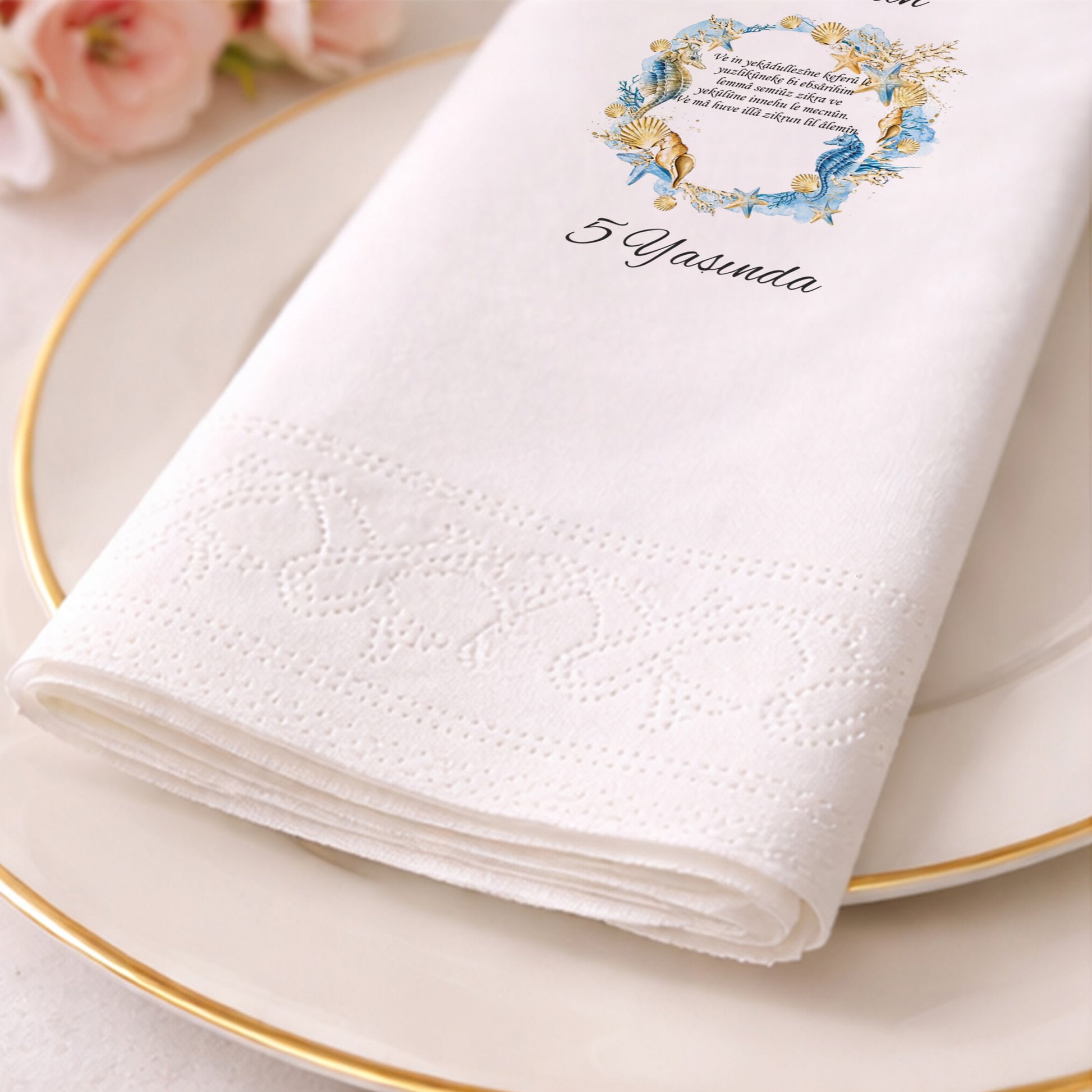 Deniz altının büyüleyici dünyasını yansıtan bu tasarım, Bebecan’ın 5. yaş günü için marin konseptinde hazırlanmıştır. Çelenk formundaki denizatı, yıldız ve deniz kabuğu illüstrasyonları, sofralara ferah bir yaz esintisi getirir. Ortasında yer alan Nazar Duası, tasarımı hem dekoratif hem de manevi açıdan zenginleştirir. Pastel mavi ve altın tonlarındaki suluboya detaylar, her türlü deniz temalı partiyle kusursuz uyum sağlar. Kaliteli dokusu sayesinde lüks bir sunum imkanı sunarken, canlı baskısı tüm detayları ön plana çıkarır. Doğum günü masalarınızı bir su altı krallığına çevirecek bu peçeteler, küçük deniz severler ve aileleri için özenle üretilmiştir.