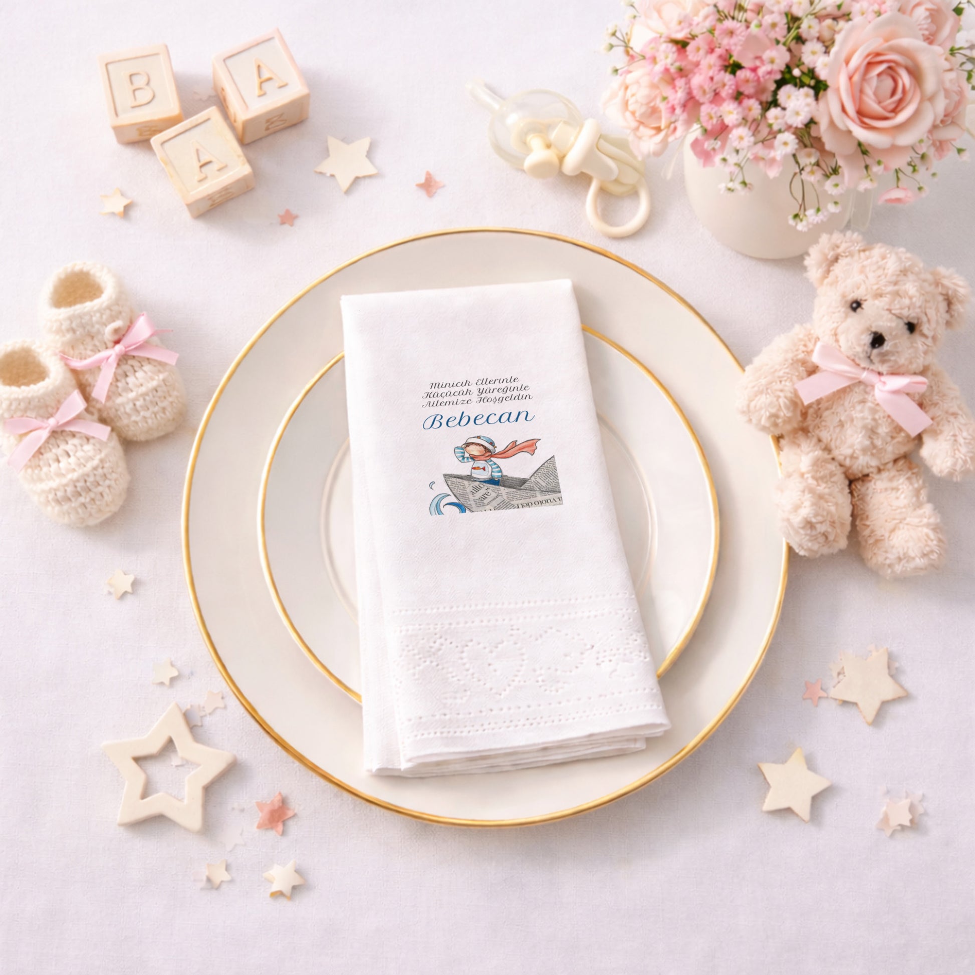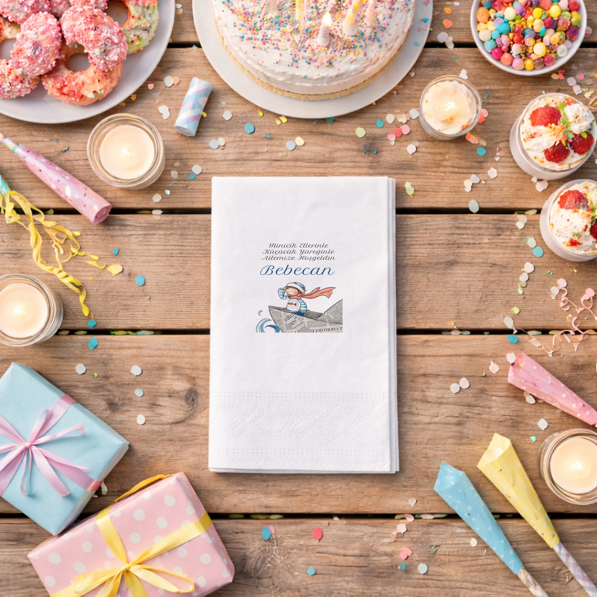 Küçük kaptanlar için hazırlanan bu özgün tasarımda, gazete kağıdından yapılmış bir kayıkta yol alan sevimli denizci figürü yer alıyor. Bebecan ismine özel hazırlanan bu ürün, "Minicik Ellerinle Ailemize Hoşgeldin" mesajıyla bebeklerin ilk günlerini kutluyor. Mavi tonlarının ve sanatsal illüstrasyonların hakim olduğu bu peçeteler, özellikle erkek bebek baby shower ve mevlüt organizasyonları için eşsiz bir tercih. Modern ve nostaljik ögelerin birleştiği tasarım, standart parti malzemelerinden sıkılanlar için yaratıcı bir alternatif sunuyor. Yüksek emiciliği ve yumuşak yapısıyla pratiklik sağlarken, özgün çizimiyle masanızın odak noktası haline gelir. Bebecan'ın bu macera dolu yolculuğuna şık bir başlangıç yapmak ve misafirlerinize farklı bir sunum hazırlamak için bu özel tasarım peçeteleri hemen sepetinize ekleyin.