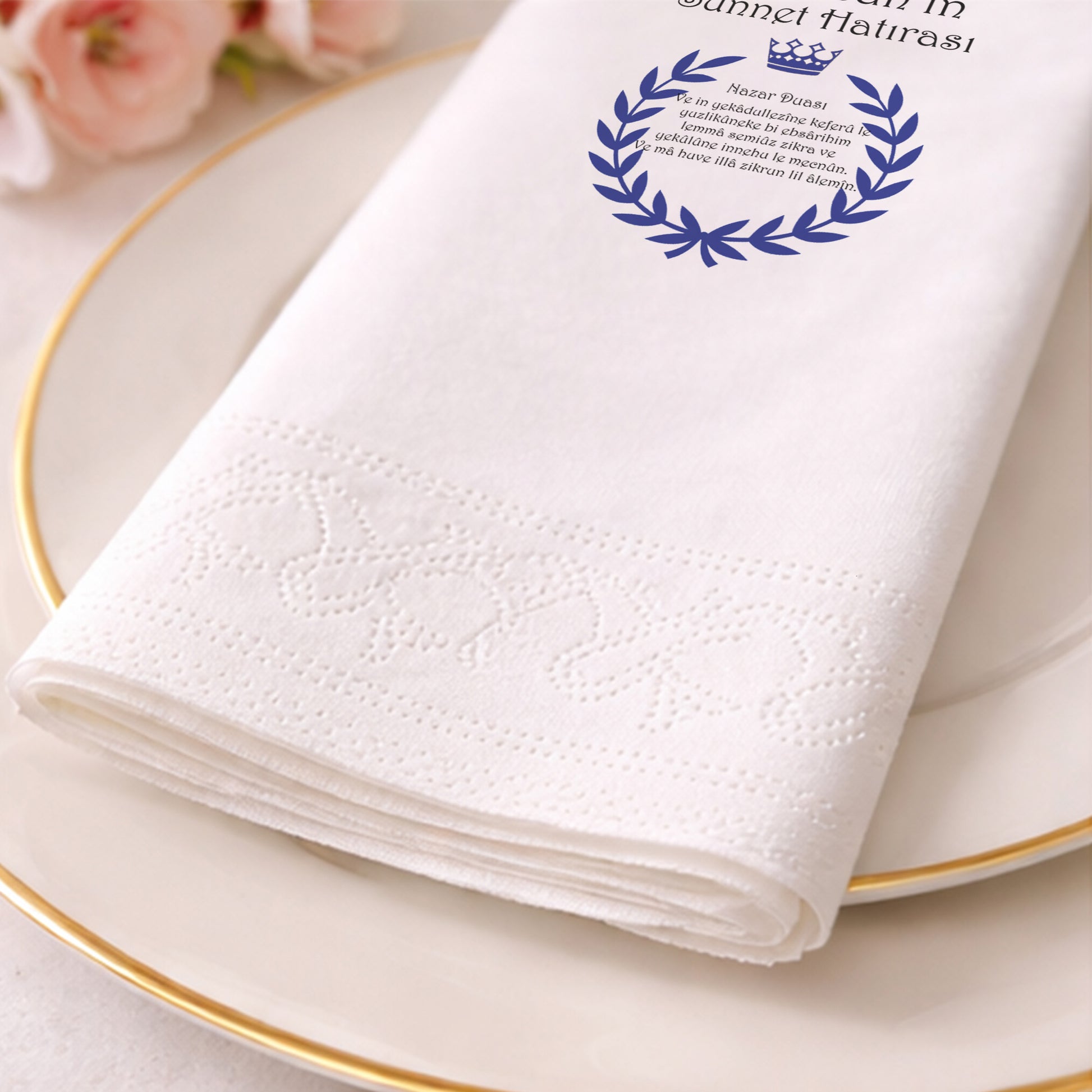 Erkek çocuklarının en önemli mürüvvetlerinden biri olan sünnet düğünleri için hazırlanan bu peçete, üzerinde yer alan Nazar Duası ile manevi bir değer taşır. Lacivert kral tacı ve zeytin dalı çelengi motifi, asil ve geleneksel bir görünüm sağlar. Bebecan’ın bu özel günü için tasarlanan ürün, siyah zemin üzerindeki ağırbaşlı duruşuyla mevlid ve yemek sofralarına çok yakışır. Konuklarınıza hem şık bir sunum yapmanızı hem de bu anlamlı günü bir hatıra ile taçlandırmanızı sağlar. Kaliteli baskısı okunabilirliği artırırken, kağıt kalitesi konforlu bir kullanım sunar. Geleneksel detayları modern çizgilerle birleştiren bu tasarım, sünnet töreninizin unutulmaz parçalarından biri olacak.