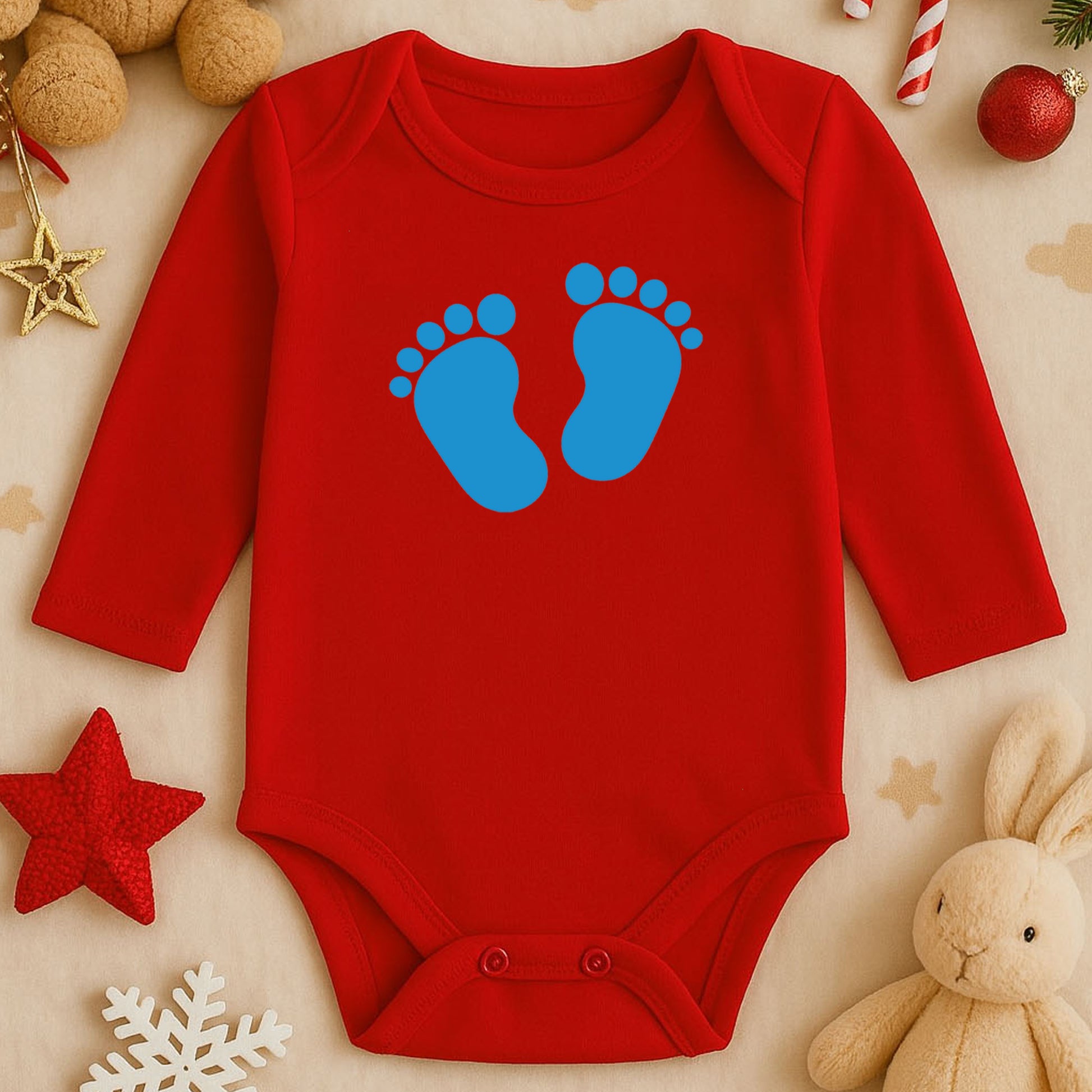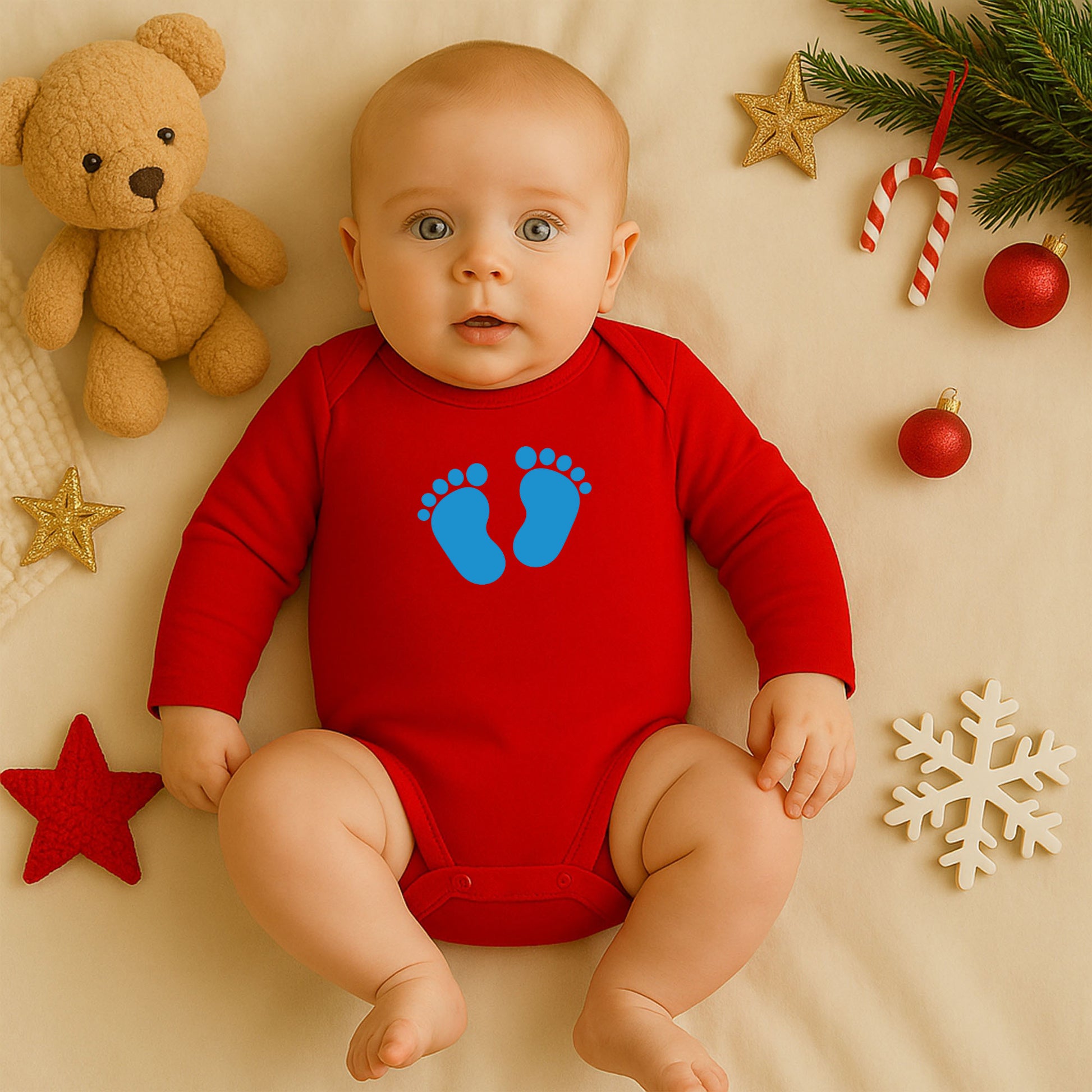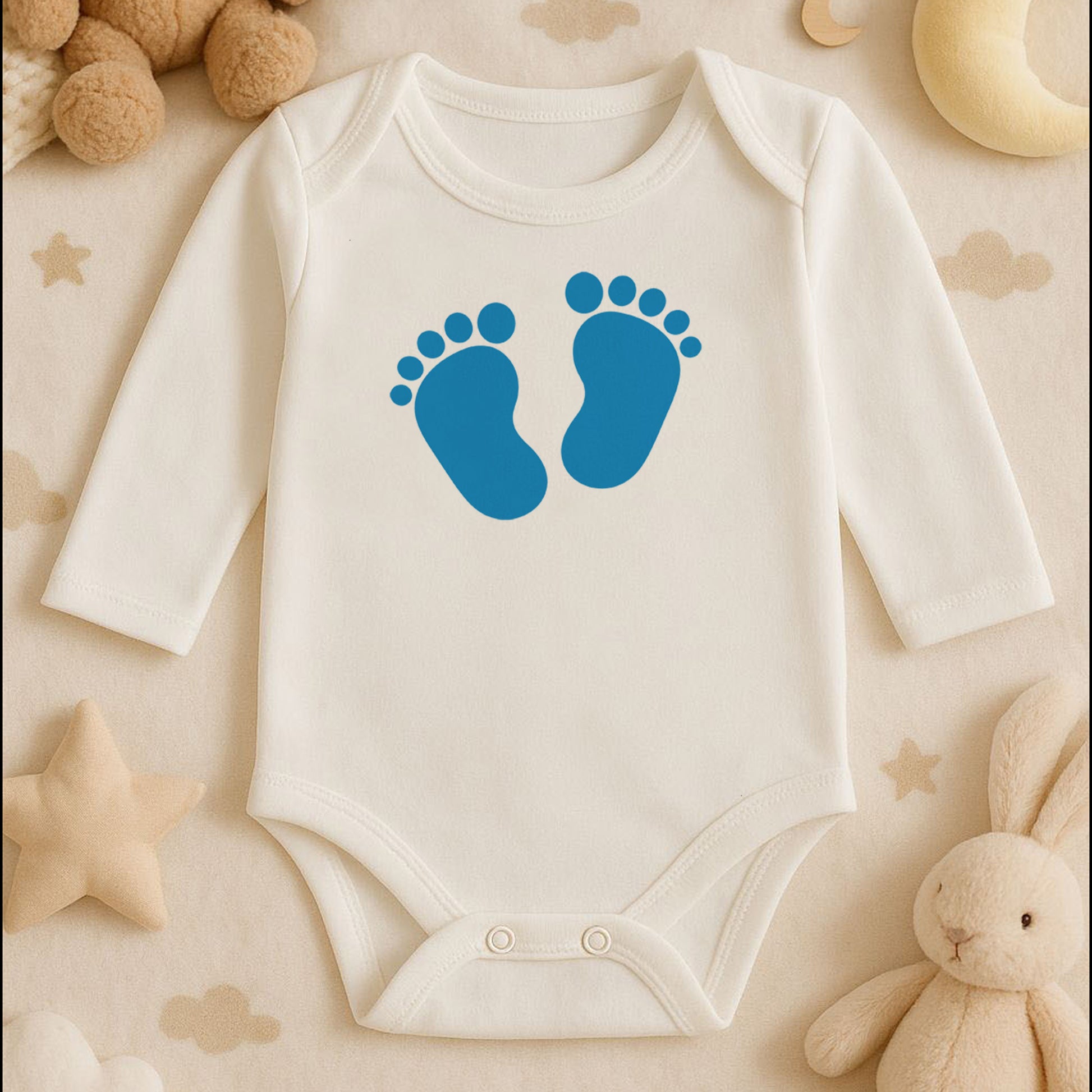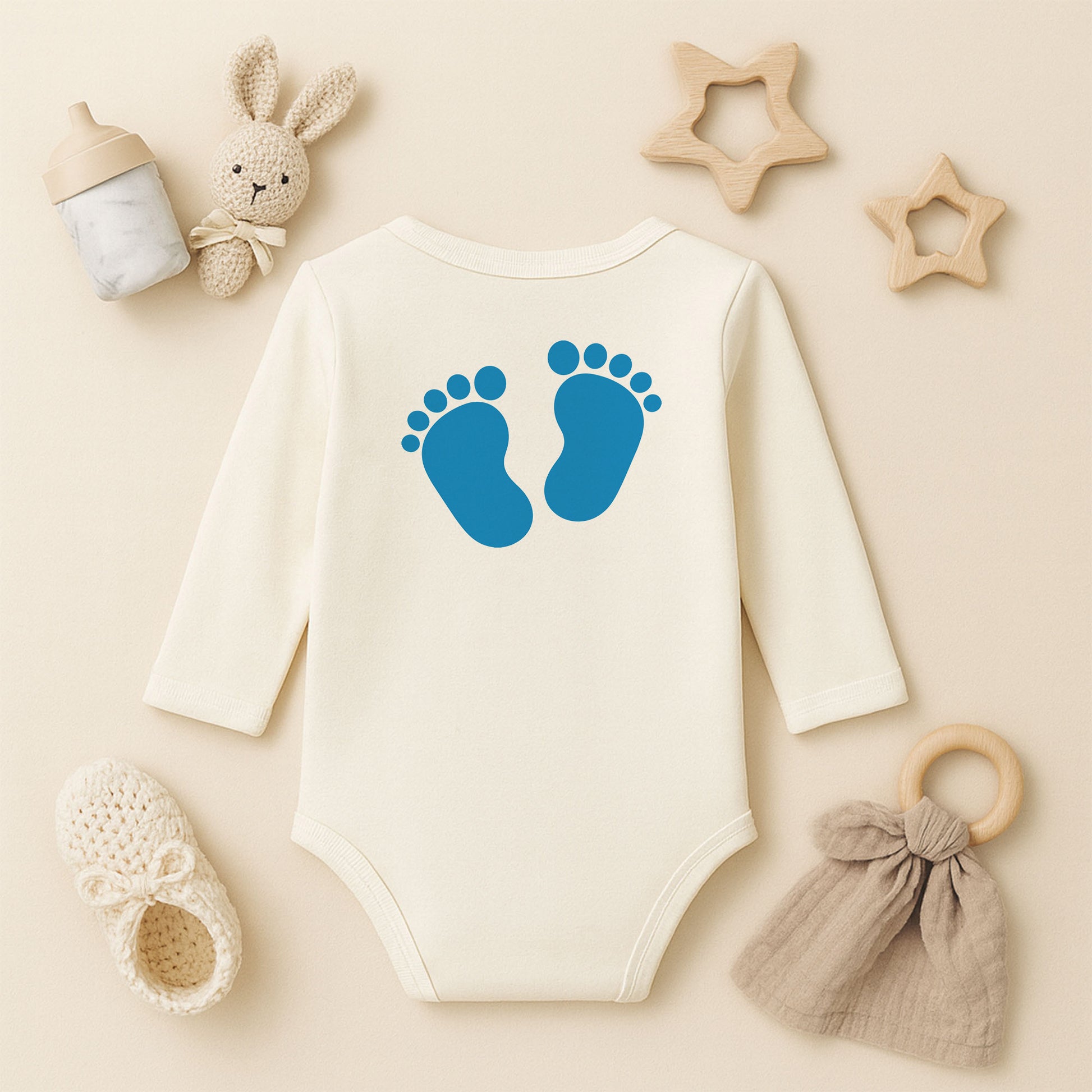 Sevimli mavi bebek ayak izi tasarımıyla yeni doğanlara özel, sade ve anlamlı bebek zıbını.
