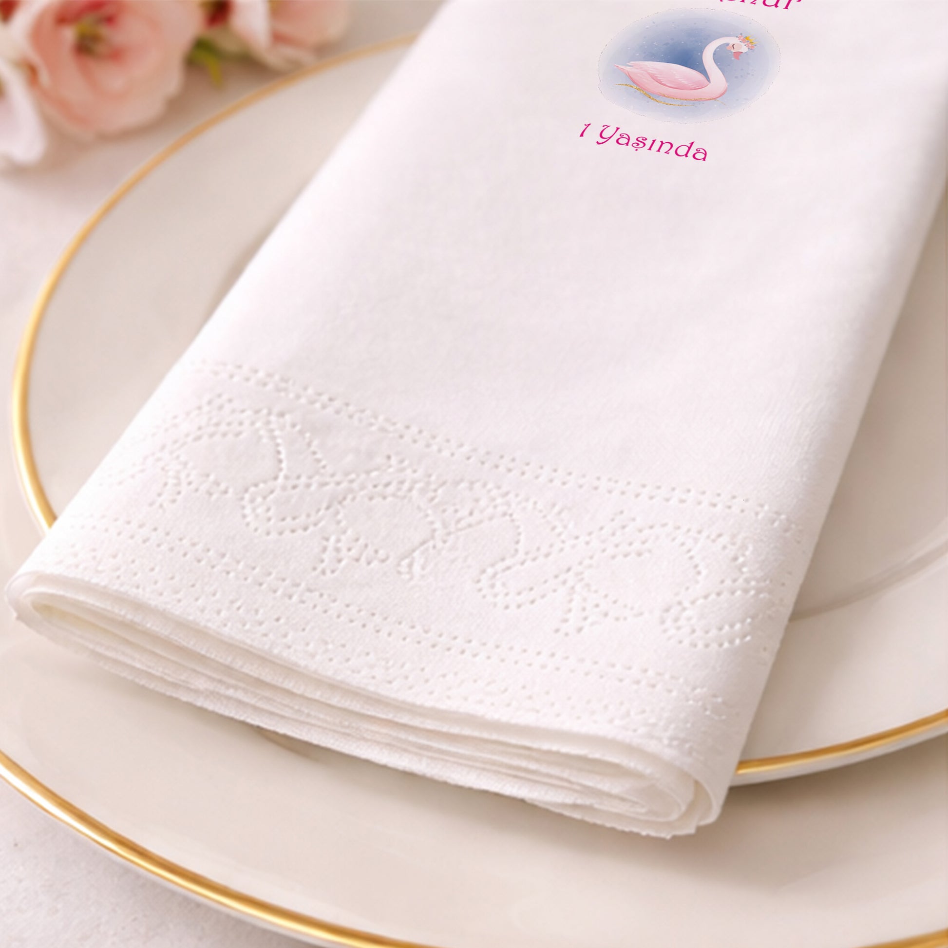 Bebenur Pembe Kuğu Temalı 1 Yaş Doğum Günü Sunum Peçetesi