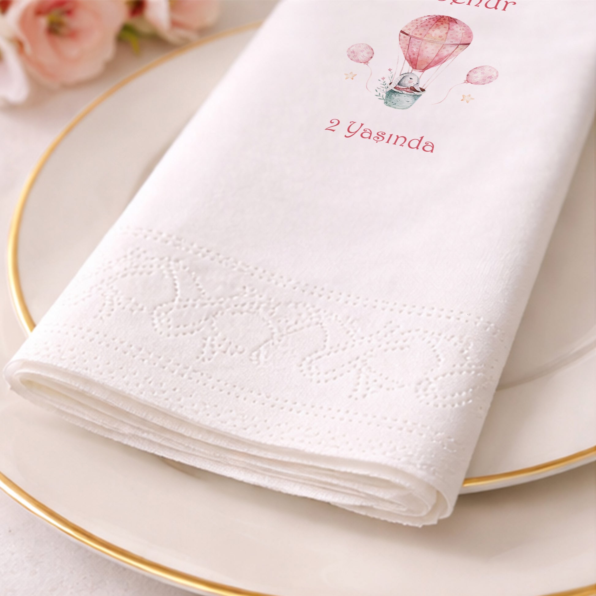 Gökyüzünde pembe bir balonla süzülen sevimli tavşan figürü, Bebenur’un 2. yaş günü için tatlı ve masum bir kutlama teması oluşturuyor. Siyah zemin üzerine kondurulan pembe balonlar ve küçük yıldızlar, gece gökyüzünde bir rüya hissi uyandırıyor. Bu yaş grubuna özel olarak tasarlanan illüstrasyon, çocukların ilgisini çekerken ebeveynlerin estetik beklentilerini de karşılıyor. Yüksek kaliteli baskı teknikleriyle hazırlanan peçete, sofranızın merkezine zarafeti taşır. Sunumlarınızda kullanacağınız bu özel parça, bebeğinizin büyümesini kutladığınız bu özel günde her ayrıntının ne kadar değerli olduğunu misafirlerinize hissettirecek ve dekorasyonunuzu tamamlayacaktır.
