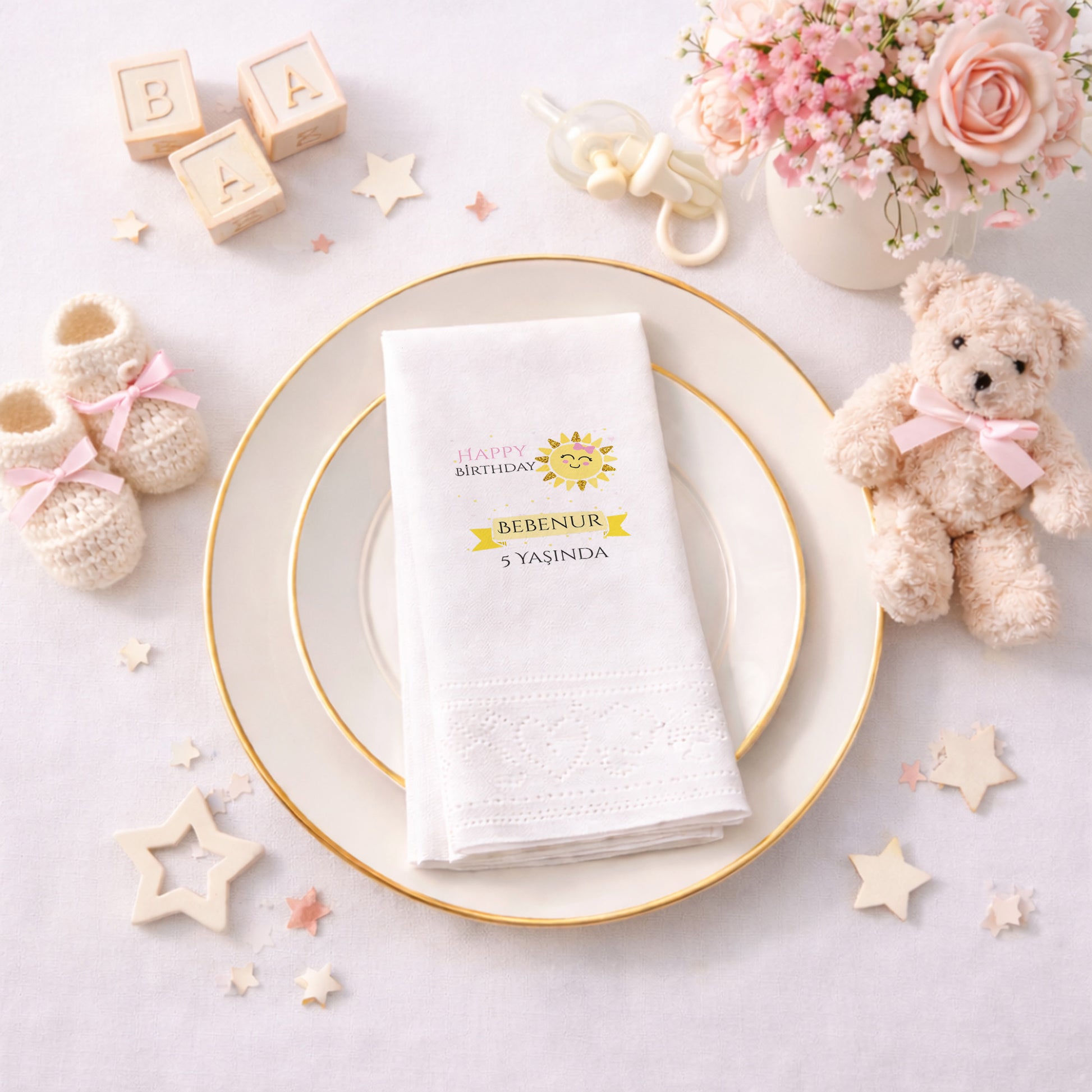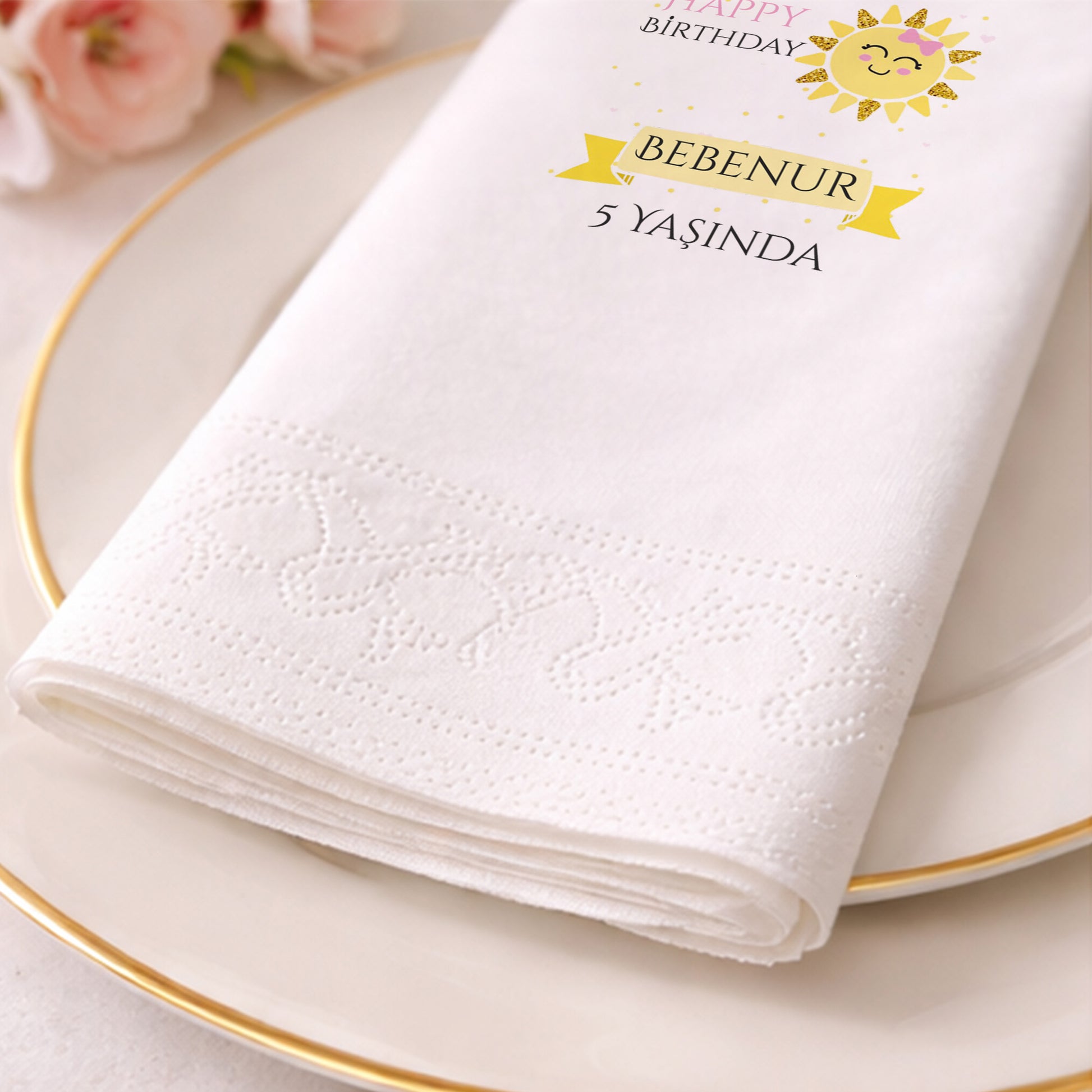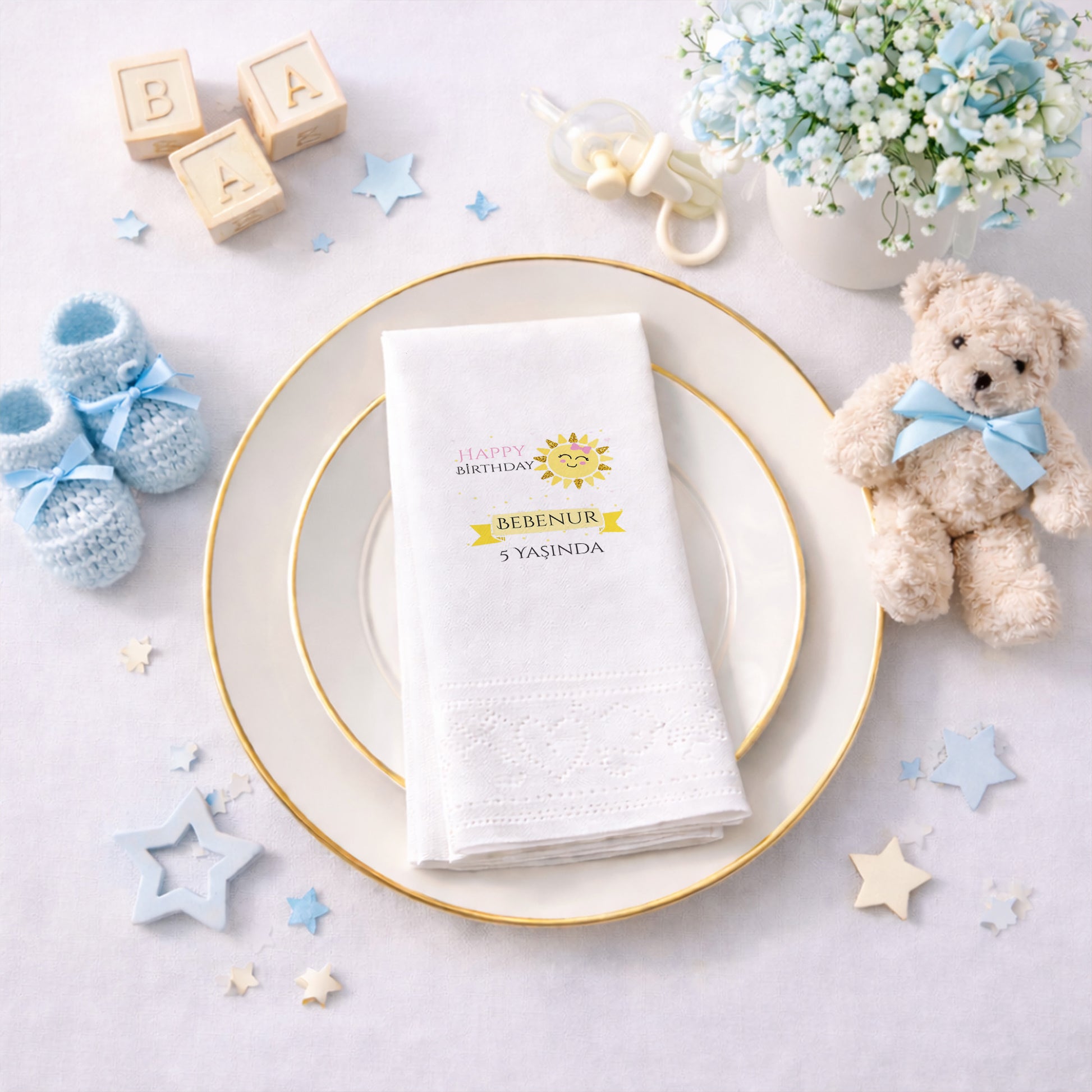 Enerji dolu ve neşeli bir kutlama için tasarlanan bu peçete, parıltılı gülen güneş figürüyle sofralara ışık saçar. Bebenur’un 5. yaş günü için hazırlanan bu sarı ve siyah kontrastlı tasarım, modern ve canlı bir görünüm sunar. Yıldızlarla süslenmiş arka planı ve şık isim bandıyla partinizin temasını güçlendirir. Çocukların enerjisini yansıtan bu tasarım, her yaş grubundan davetlinin ilgisini çekecek estetik detaylara sahiptir. Yumuşak dokusu ve sağlam yapısı sayesinde pratik bir kullanım sunarken, görsel olarak masalarınızı zenginleştirir. Özel baskı tekniği ile renkler canlılığını korur ve kutlamanız boyunca şıklığından ödün vermez.