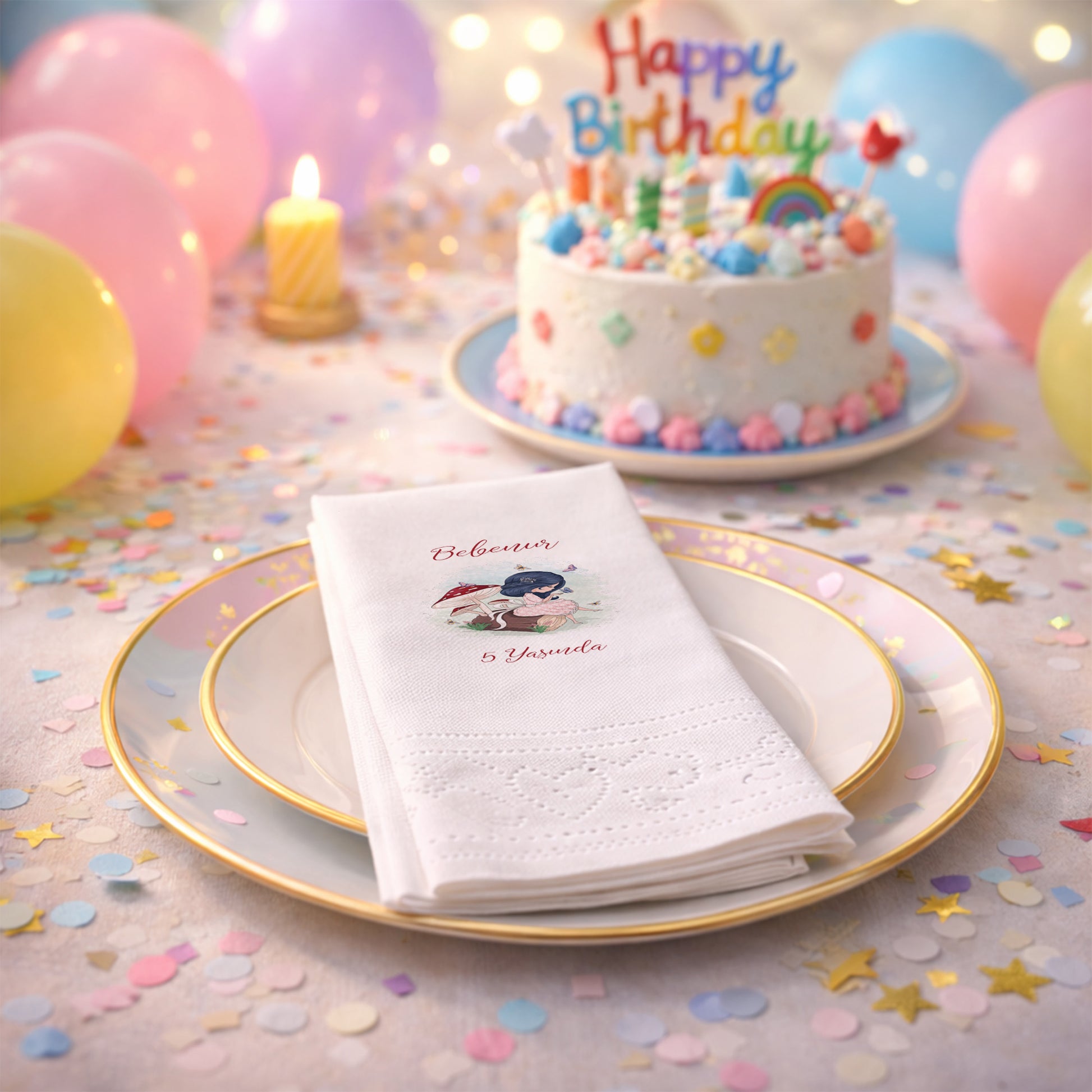 Peri masallarını anımsatan bu peçete tasarımı, Bebenur’un 5. yaş kutlaması için büyüleyici bir seçenek sunuyor. Mantar üzerinde oturan küçük kız ve etrafındaki uçuşan kelebekler, doğum günü sofralarınıza masalsı bir dokunuş getirir. Soft renk paleti ve zarif detayları ile her türlü parti konseptine uyum sağlar. Kaliteli kağıt yapısı ve canlı baskı kalitesiyle sunumlarınızda fark yaratır. Çocukların hayal dünyasına hitap eden bu özel tasarım, konuklarınıza kendilerini özel hissettirecek şık bir detaydır. Hem dekoratif hem de fonksiyonel olan bu peçeteler, kutlamanızın tematik bütünlüğünü tamamlamak için özenle hazırlanmıştır.