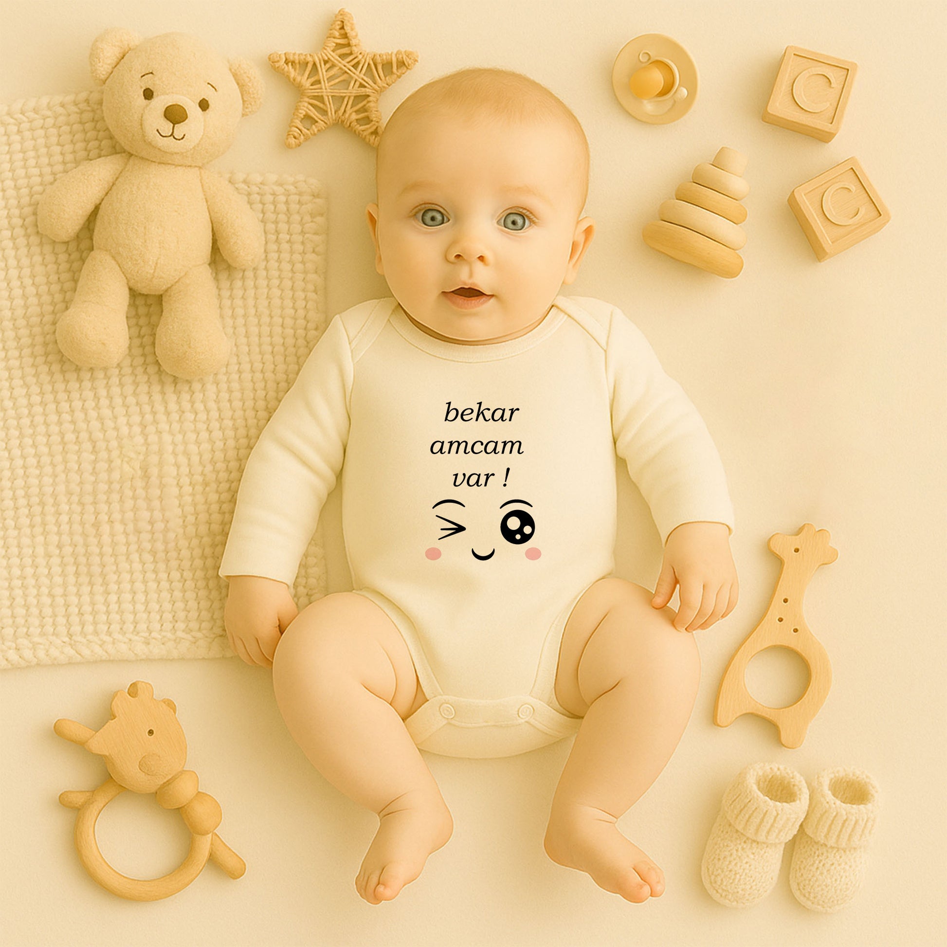 “Bekar amcam var” yazılı bu eğlenceli bebek zıbını, espirili tarzı seven aileler için harika bir seçim. 1–36 ay arası beden seçenekleri, hassas ciltlere uygun yumuşak kumaşı ve dayanıklı DTF baskısı ile hem rahat hem de gülümseten bir tasarım sunar. Hediye etmek için çok iddialı!
