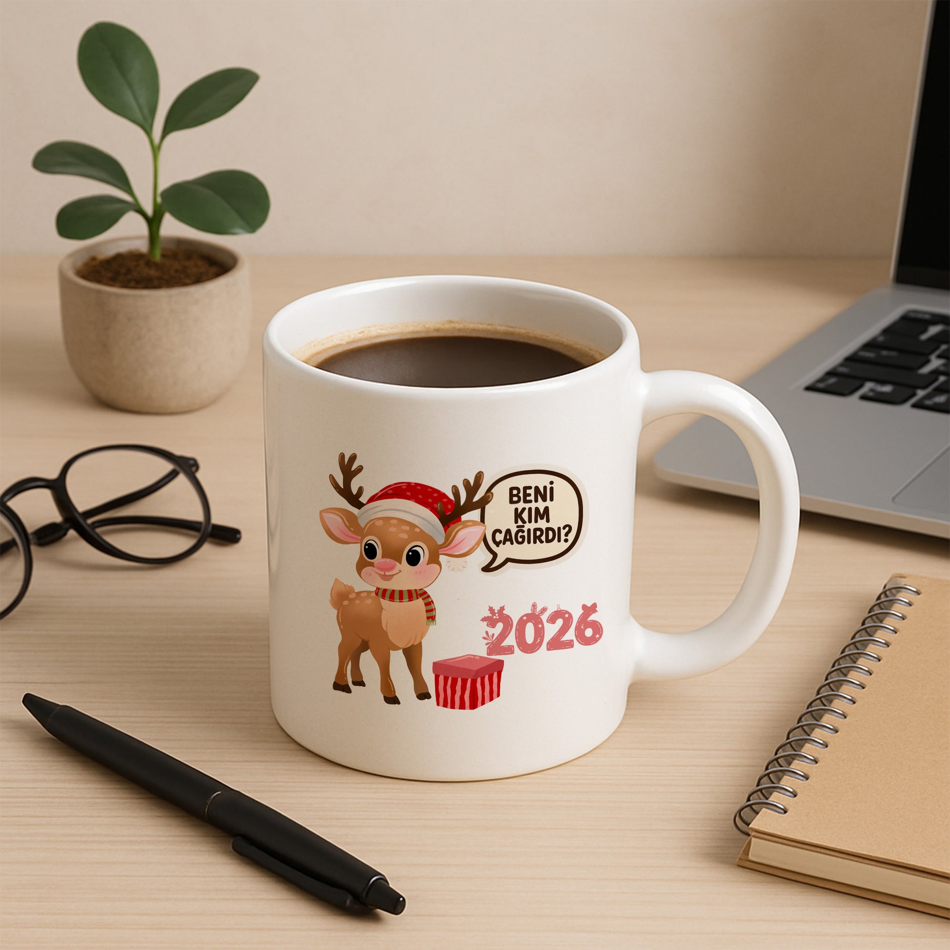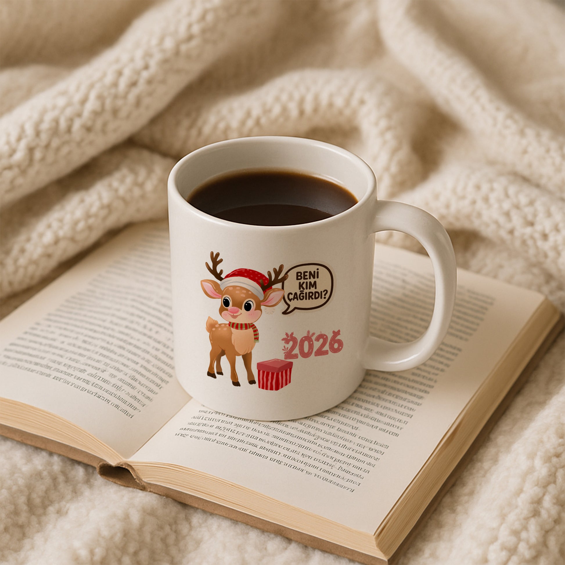 “Beni kim çağırdı?” mesajı, yılbaşı sürprizlerini ve tatlı heyecanı eğlenceli bir dille anlatır. Sevimli geyik figürü, 2026 vurgusu ve hediye detayıyla kupa; yeni yılın neşesini sıcak ve samimi bir şekilde yansıtır.