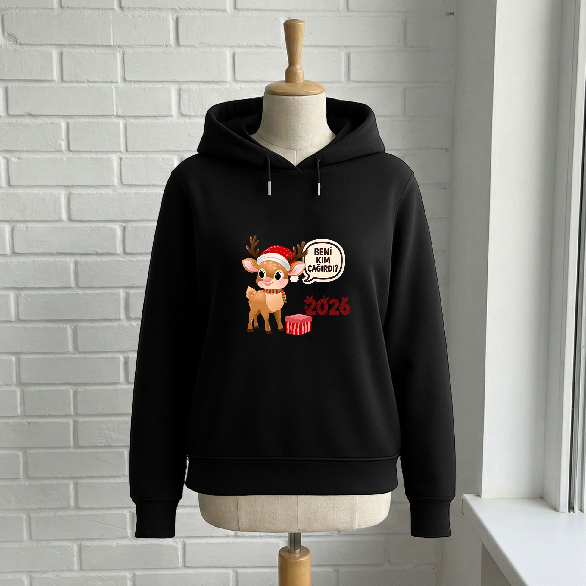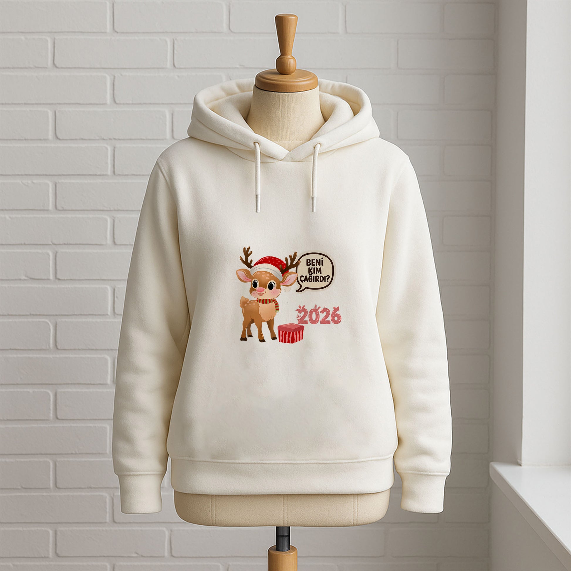 “Beni Kim Çağırdı?” yazılı, sevimli geyik figürlü, 2026 yılbaşı temalı eğlenceli sweatshirt.
