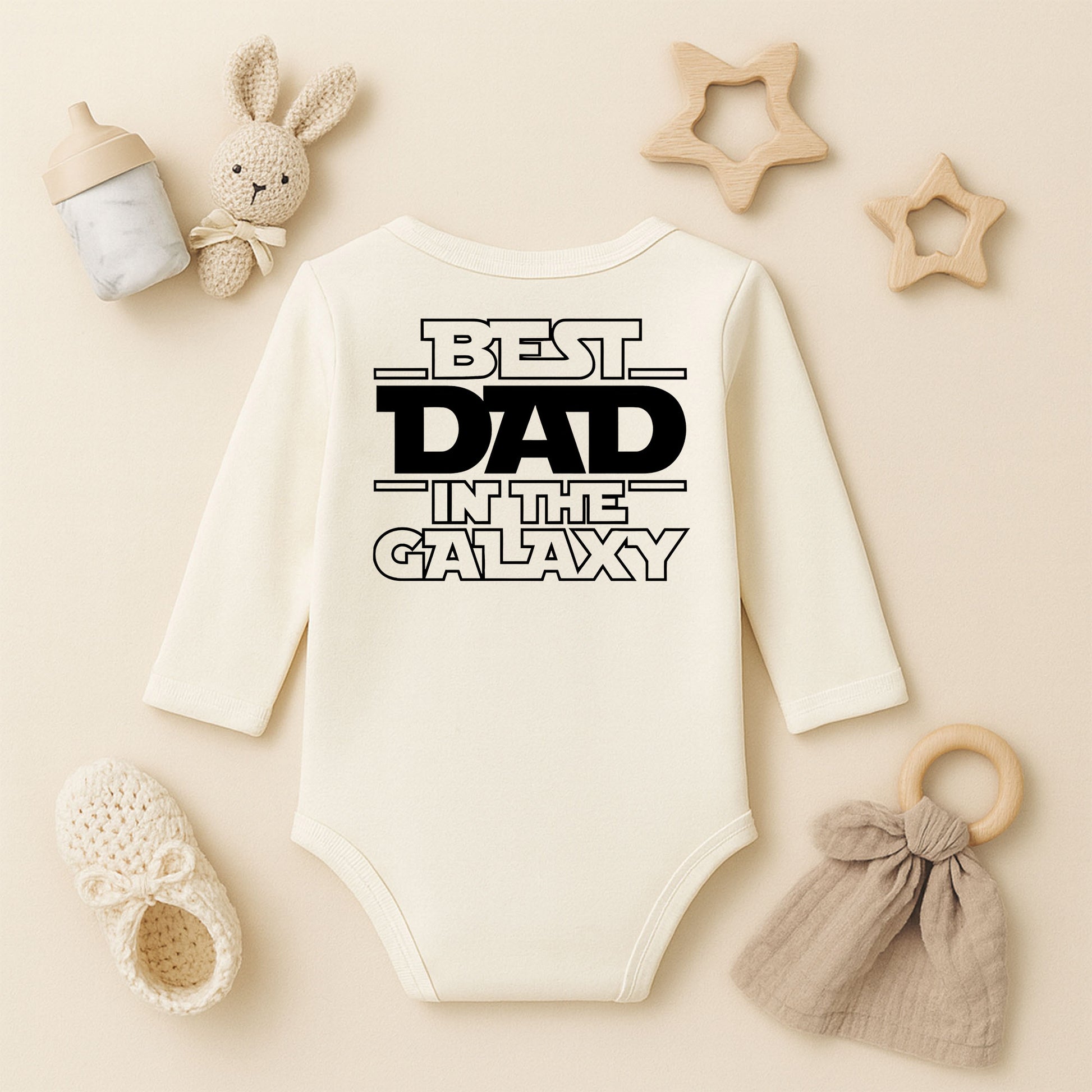 “Best Dad in the Galaxy” Yazılı Bebek Zıbını – 1–36 Ay | Baba Temalı DTF Baskı