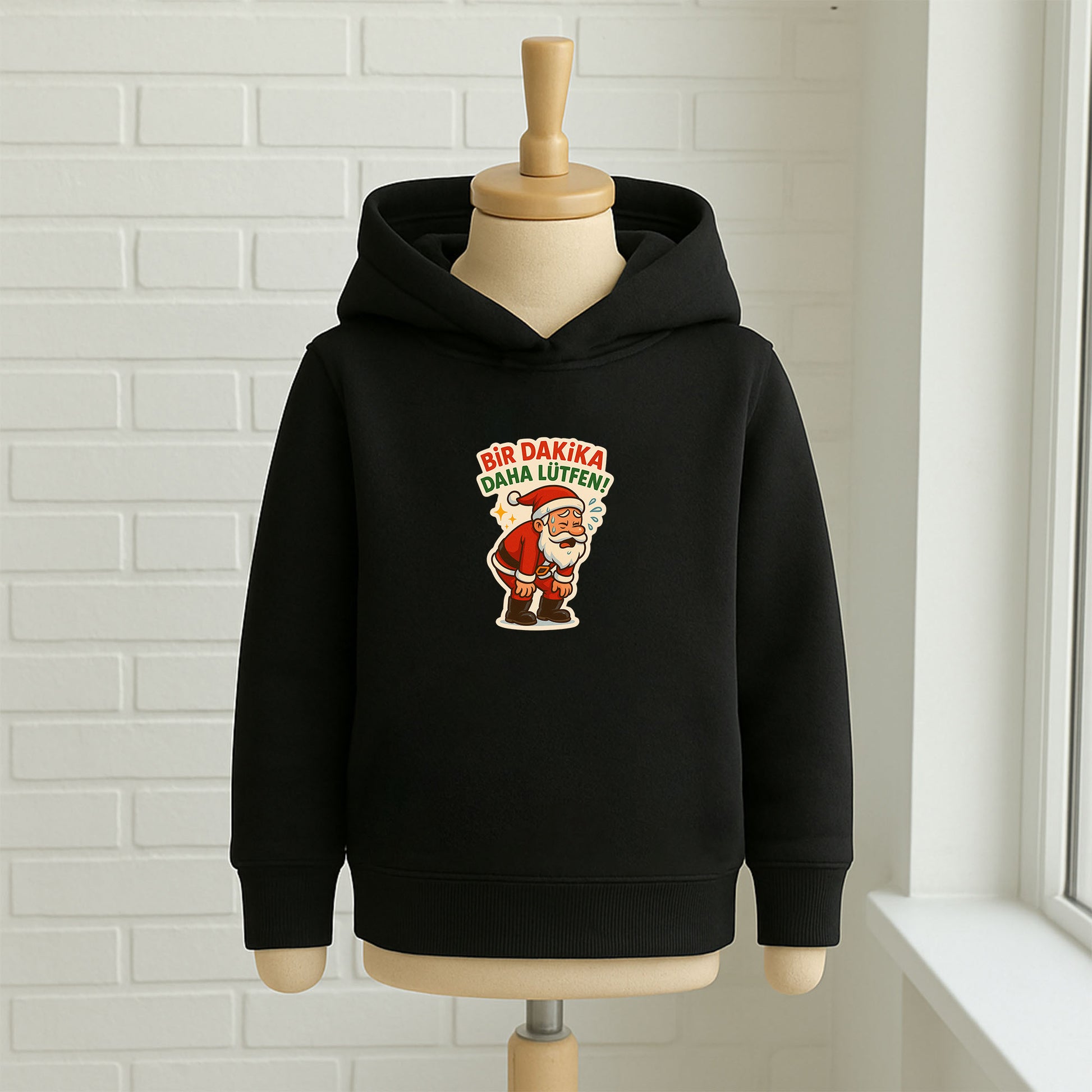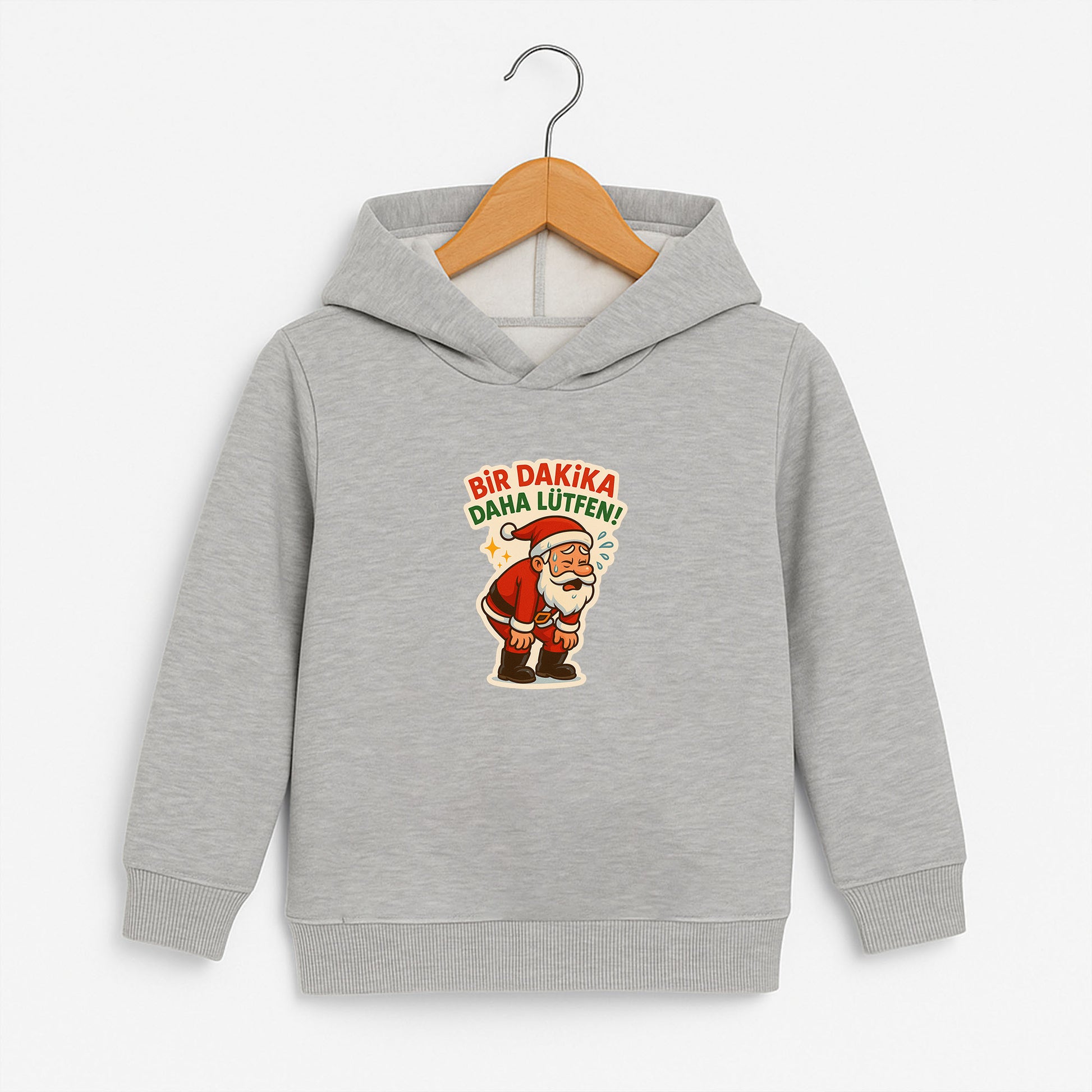 Yılbaşı hazırlıklarının tatlı telaşını yansıtan Bir Dakika Daha Lütfen Noel Baba desenli çocuk sweatshirt, yorulmuş ama sevimli Noel Baba figürü ve eğlenceli mesajıyla çocukların ilgisini çeker. %80 pamuk ve %20 polyester kumaş karışımı sayesinde yumuşak dokulu, dayanıklı ve günlük kullanıma uygundur.