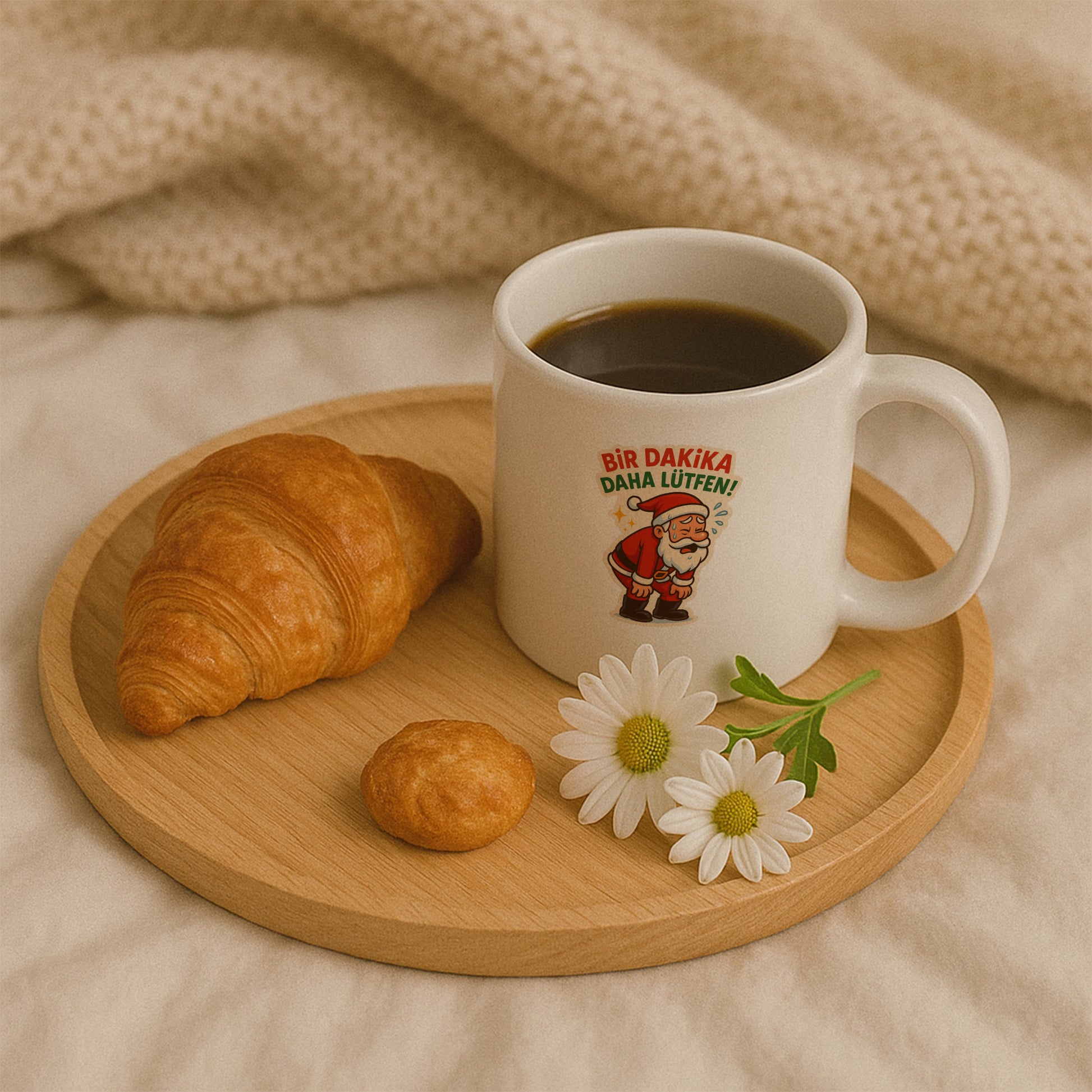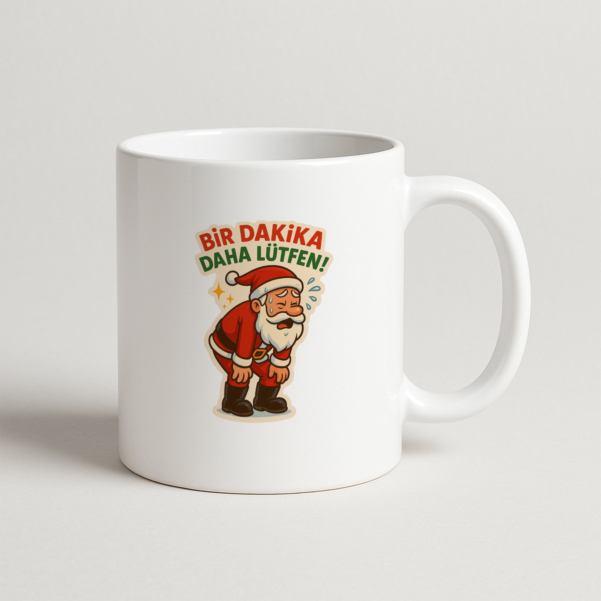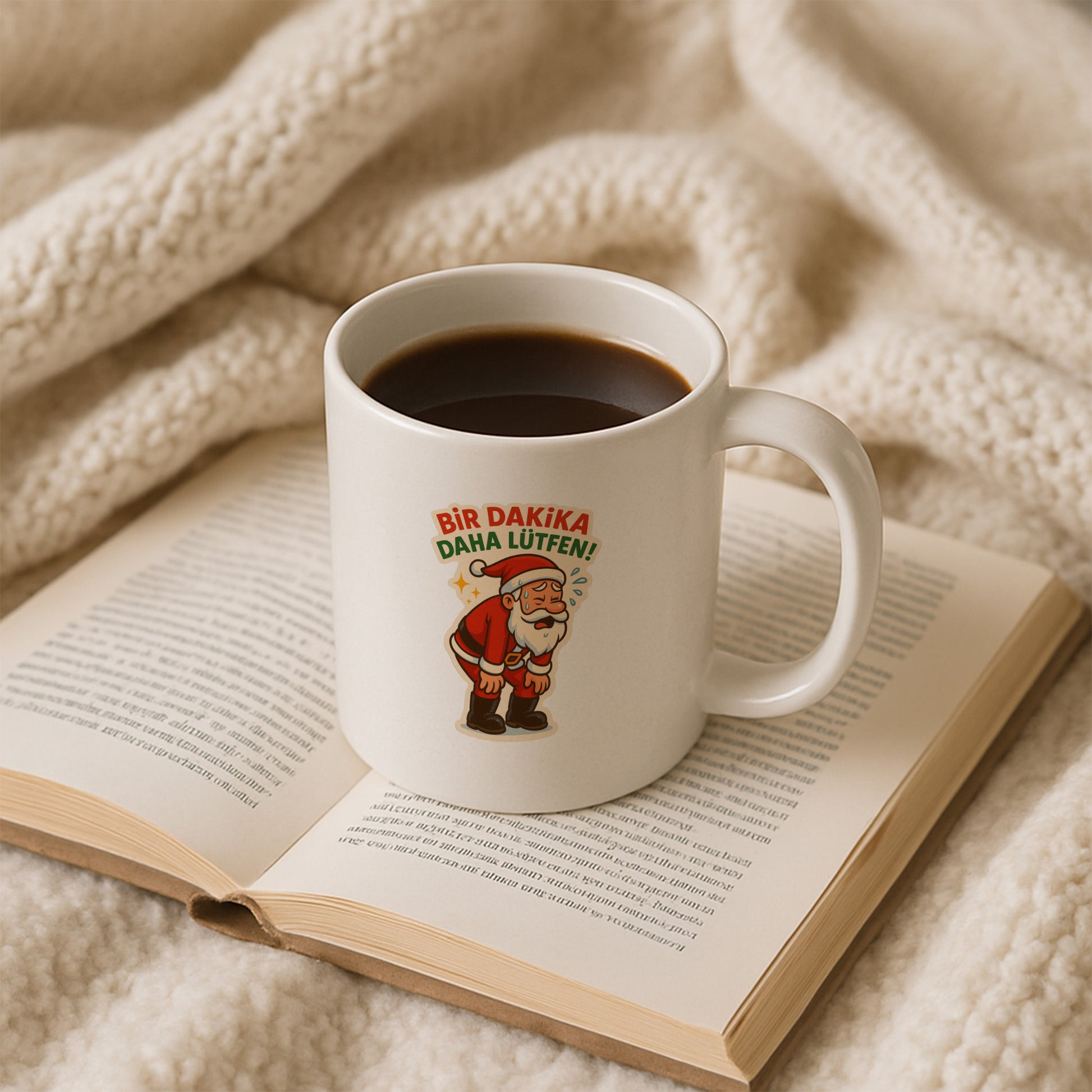 Bir dakika daha lütfen!” mesajı, yılbaşı koşturmacasını mizahi bir dille yansıtır. Yorulmuş ama sevimli Noel Baba figürü, yoğun günlerin arasında kısa bir mola isteğini sıcak ve eğlenceli bir anlatımla kupaya taşır.