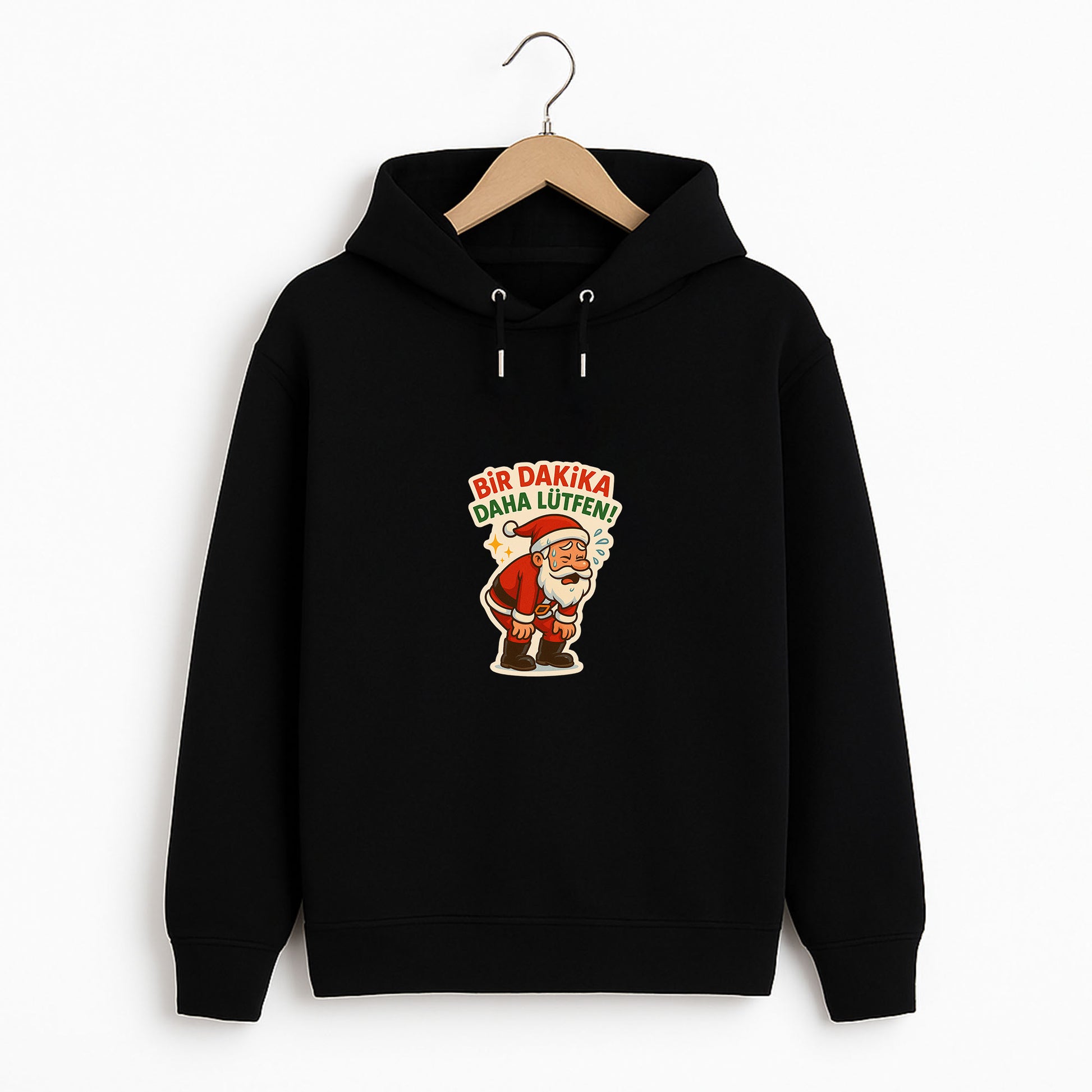 “Bir Dakika Daha Lütfen!” yazılı, yorgun ve terlemiş Noel Baba tasarımıyla yılbaşına mizah katan eğlenceli sweatshirt.