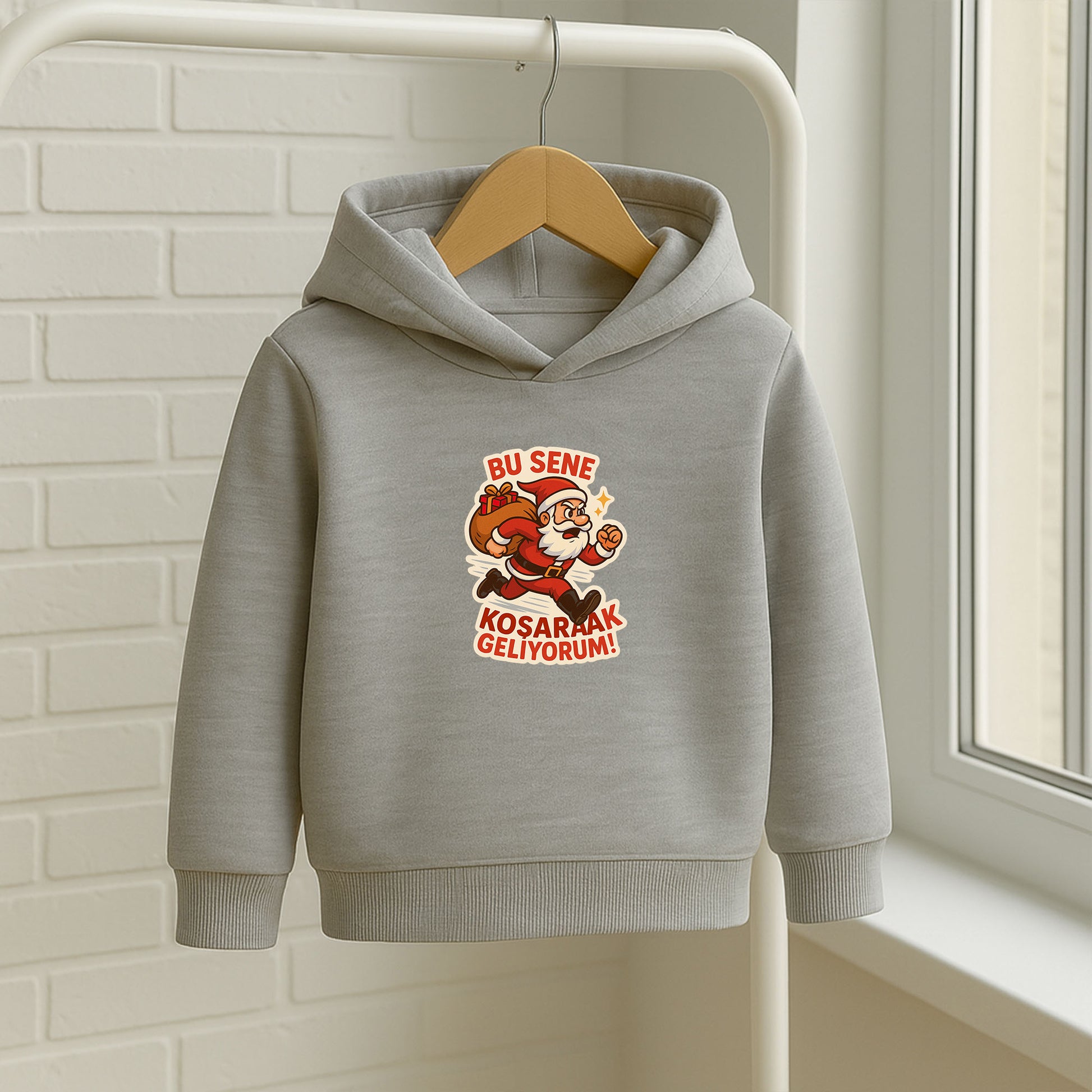 Yılbaşı heyecanını hareketli ve eğlenceli bir şekilde anlatan Bu Sene Koşarak Geliyorum Noel Baba desenli çocuk sweatshirt, hediyelerle koşan sevimli Noel Baba illüstrasyonu ve esprili mesajıyla çocukların favorisi olmaya adaydır. %80 pamuk ve %20 polyester kumaş karışımı sayesinde hem yumuşak hem de dayanıklıdır. Günlük kullanım için idealdir.