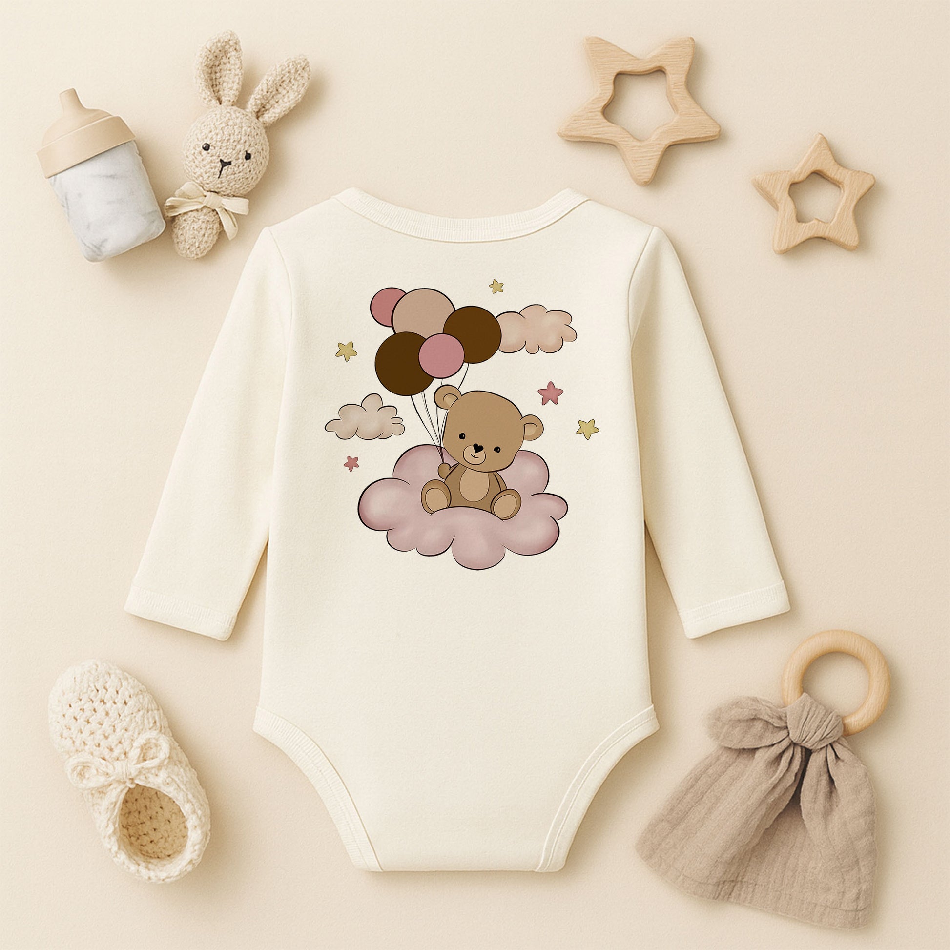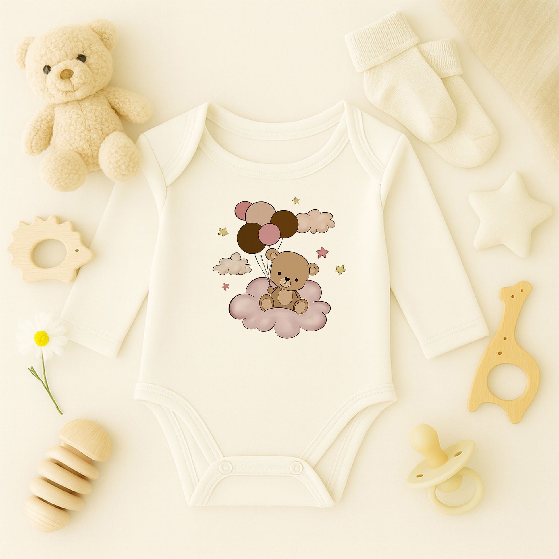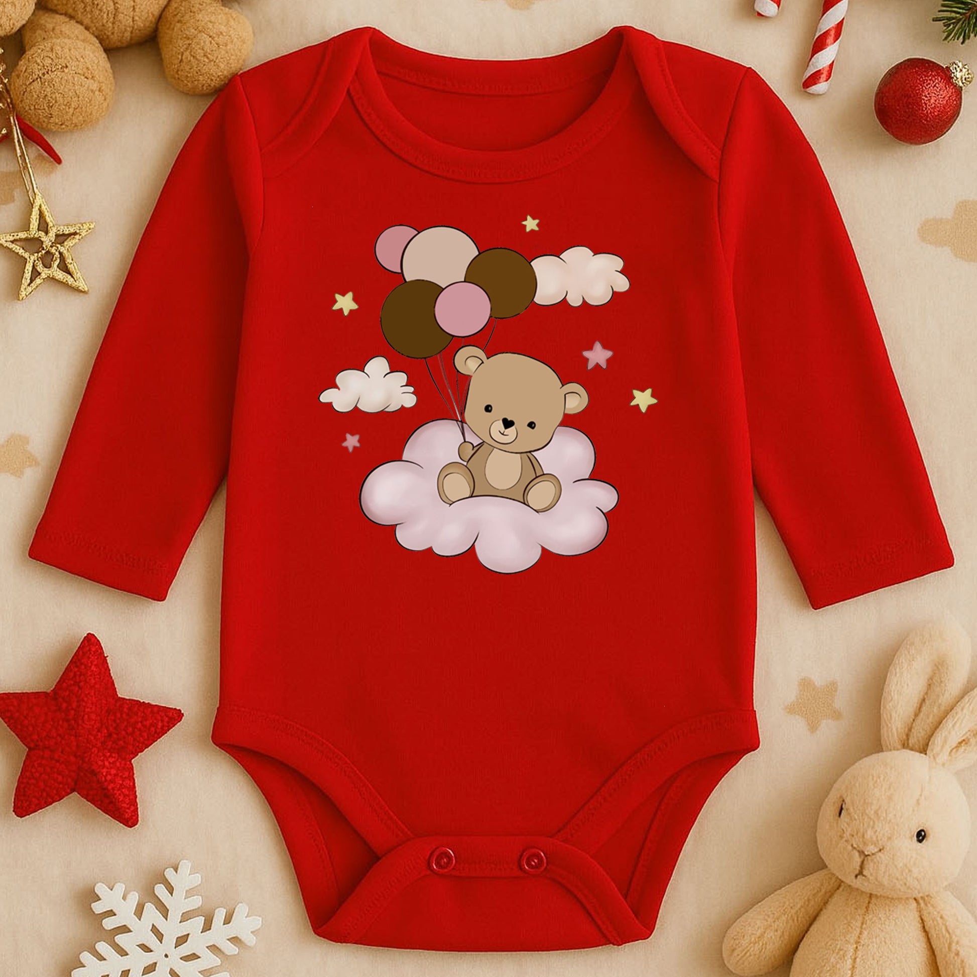 Bulut Üzerinde Balonlu Ayıcık Baskılı Bebek Zıbını | 1–36 Ay, DTF Baskı, Sevimli Tasarım