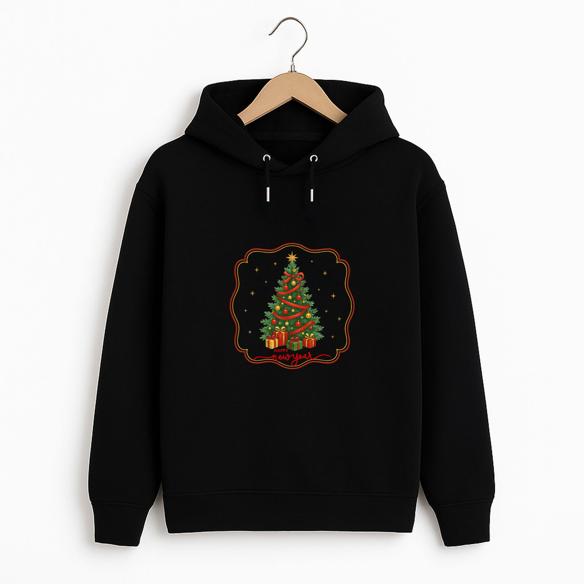 Süslenmiş çam ağacı, kırmızı kurdeleler, yılbaşı topları ve hediye kutularıyla tamamlanan bu Happy New Year sweatshirt, yılbaşının klasik ve zamansız ruhunu modern bir tasarımla birleştirir. Altın yıldız detayları ve çerçeveli kompozisyonu sayesinde hem şık hem de nostaljik bir görünüm sunar.