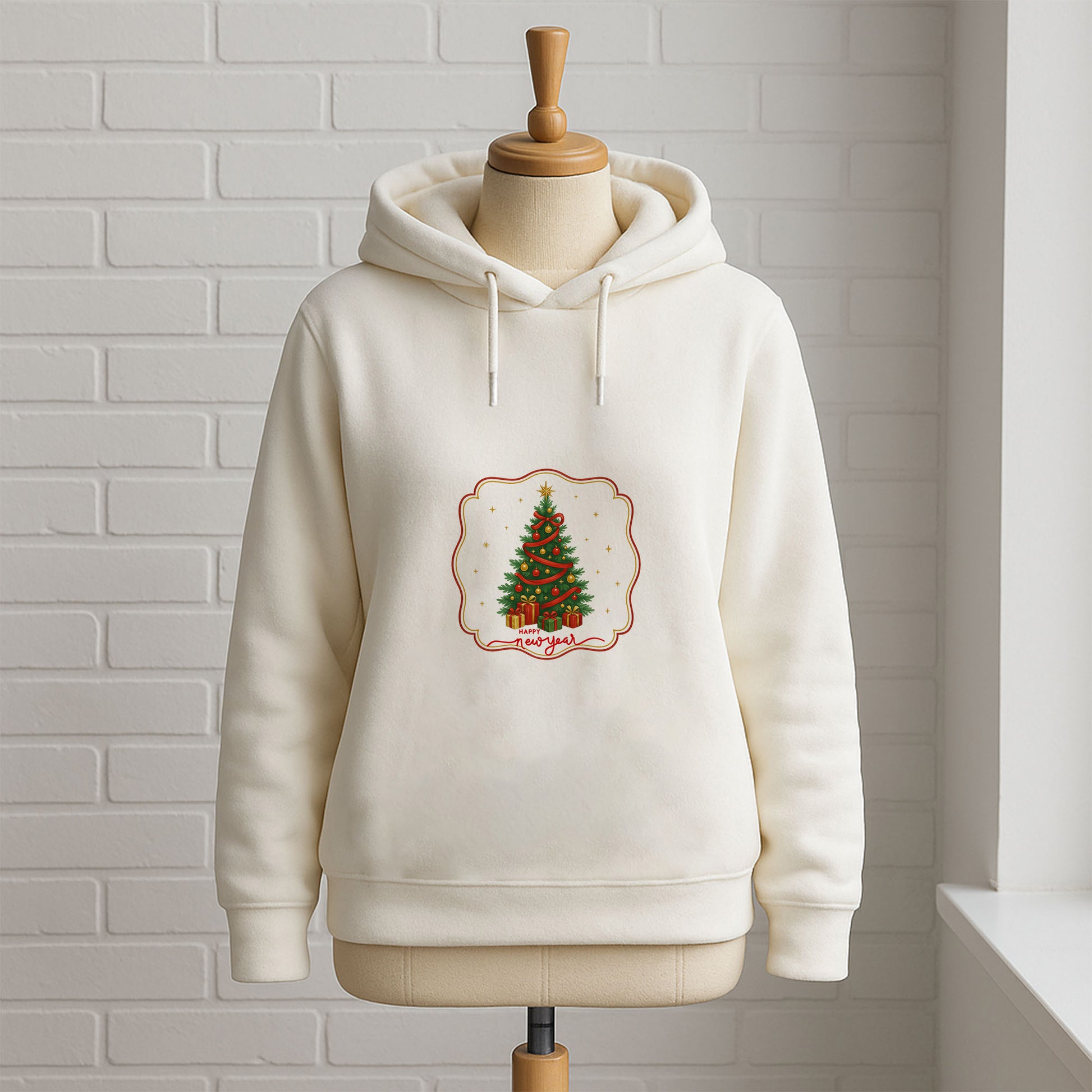 Süslenmiş çam ağacı ve Happy New Year yazılı klasik yılbaşı temalı sweatshirt.