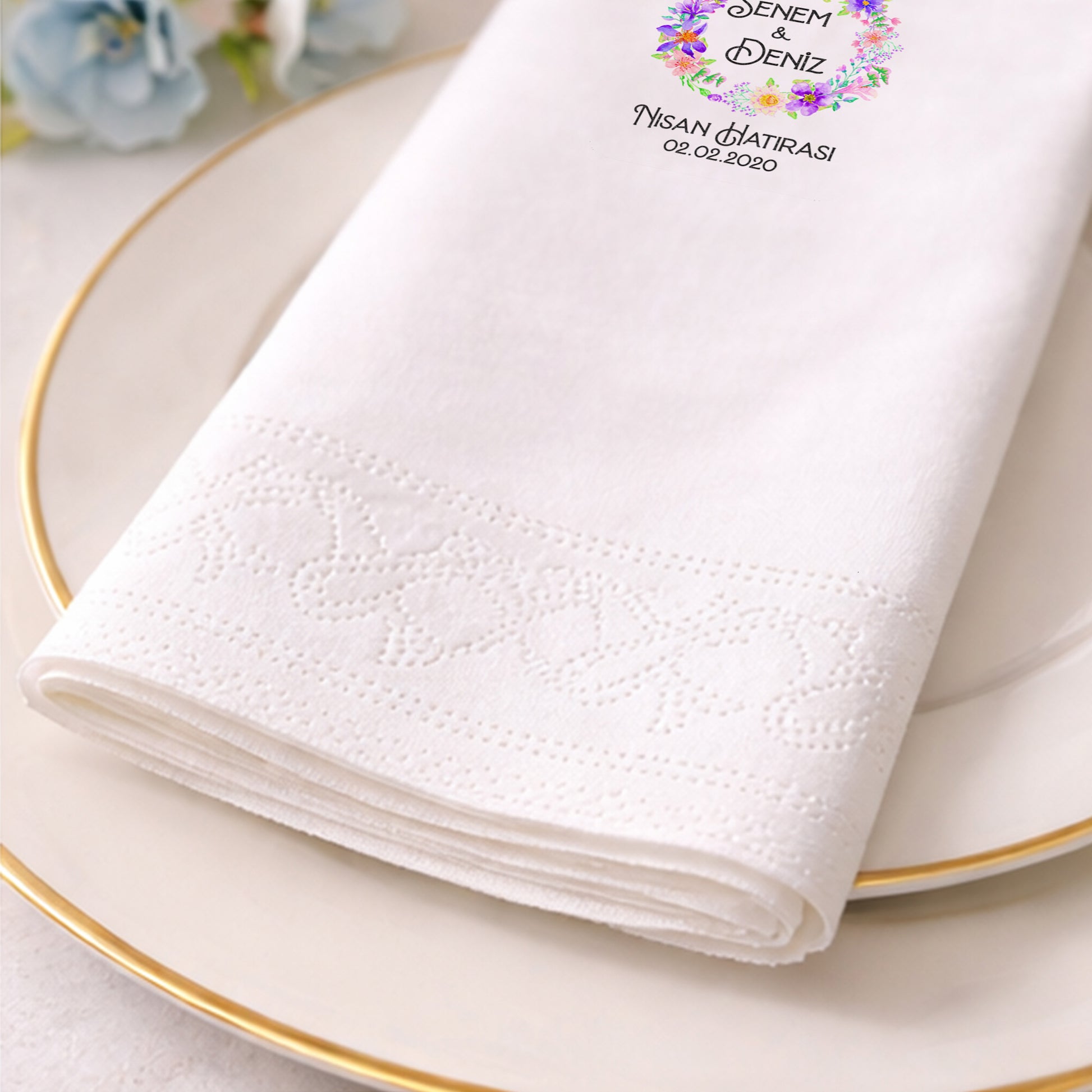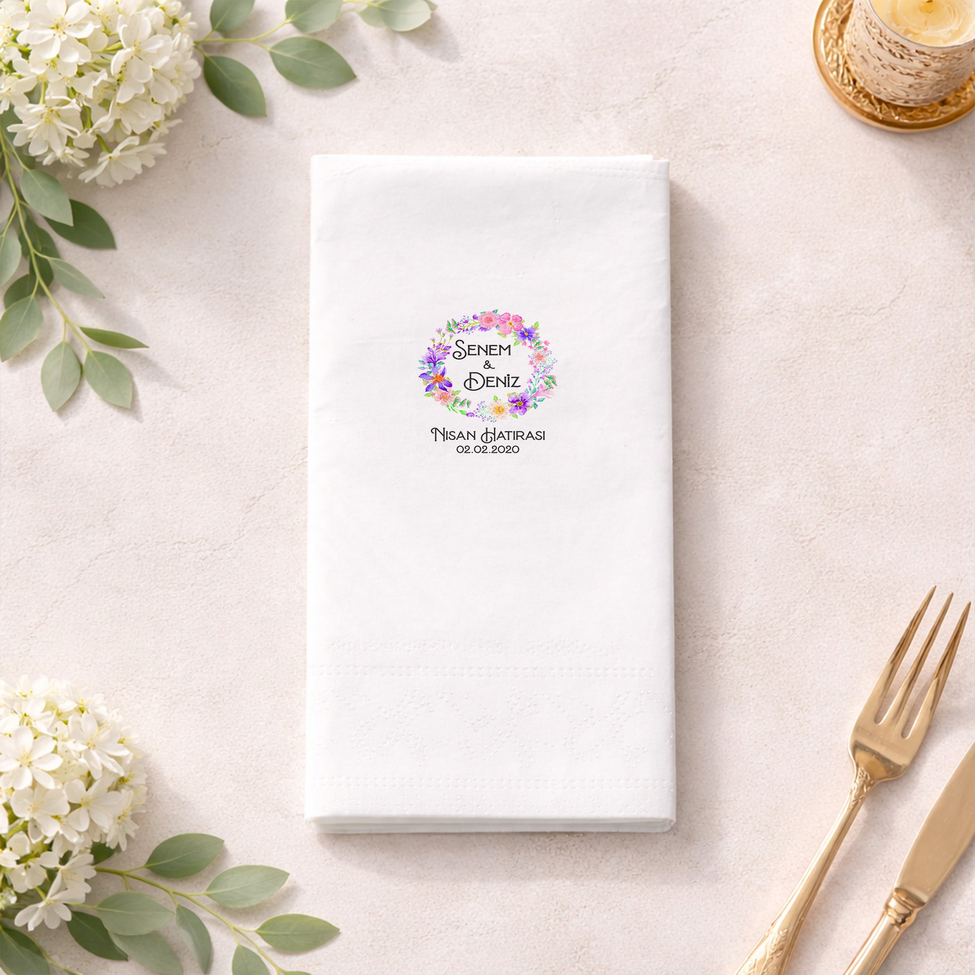 Çiçek çember formu ve sade tipografiyle hazırlanan bu baskılı peçete, nişan organizasyonları için romantik ama dengeli bir sunum sağlar. İsim ve tarih bilgisiyle kişiselleştirilebilen tasarım, özel gün peçetesi olarak estetik bir hatıra oluşturur. Organizasyon peçetesi kullanımında masa düzenine uyumlu ve zarif bir görünüm sunar. Nişan peçetesi olarak tercih edilebilir. Baskılı peçete yüzeyi sayesinde detaylar net ve temizdir. Zamansız ve profesyonel bir nişan konsepti arayan çiftler için ideal bir tercihtir.