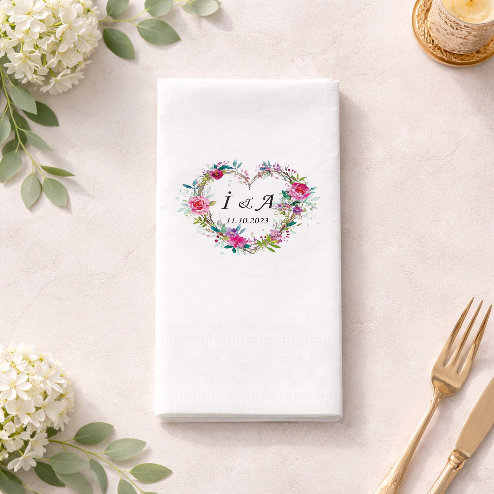 Çiçek Kalp Çerçeveli İsimli Nişan ve Düğün Baskılı Peçete