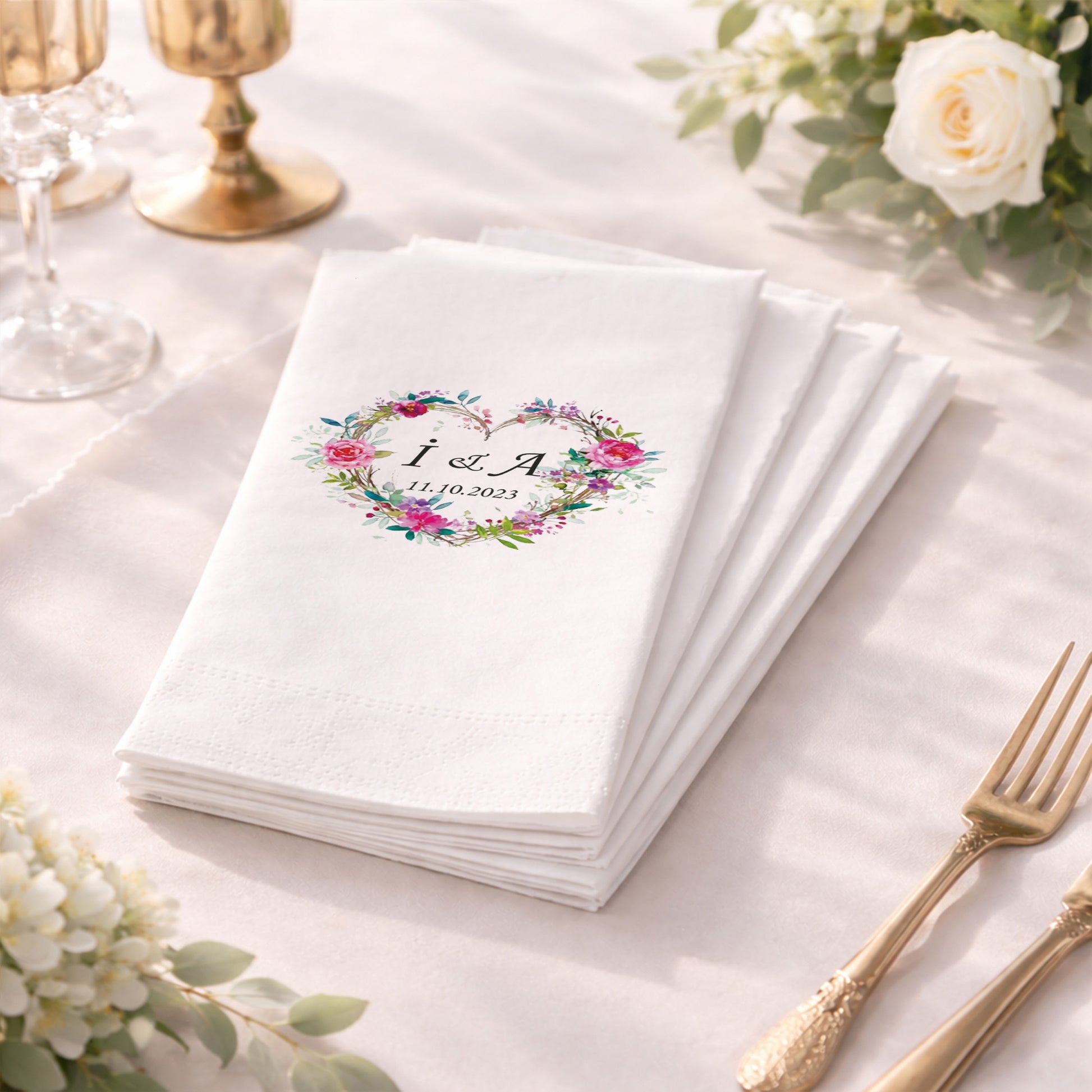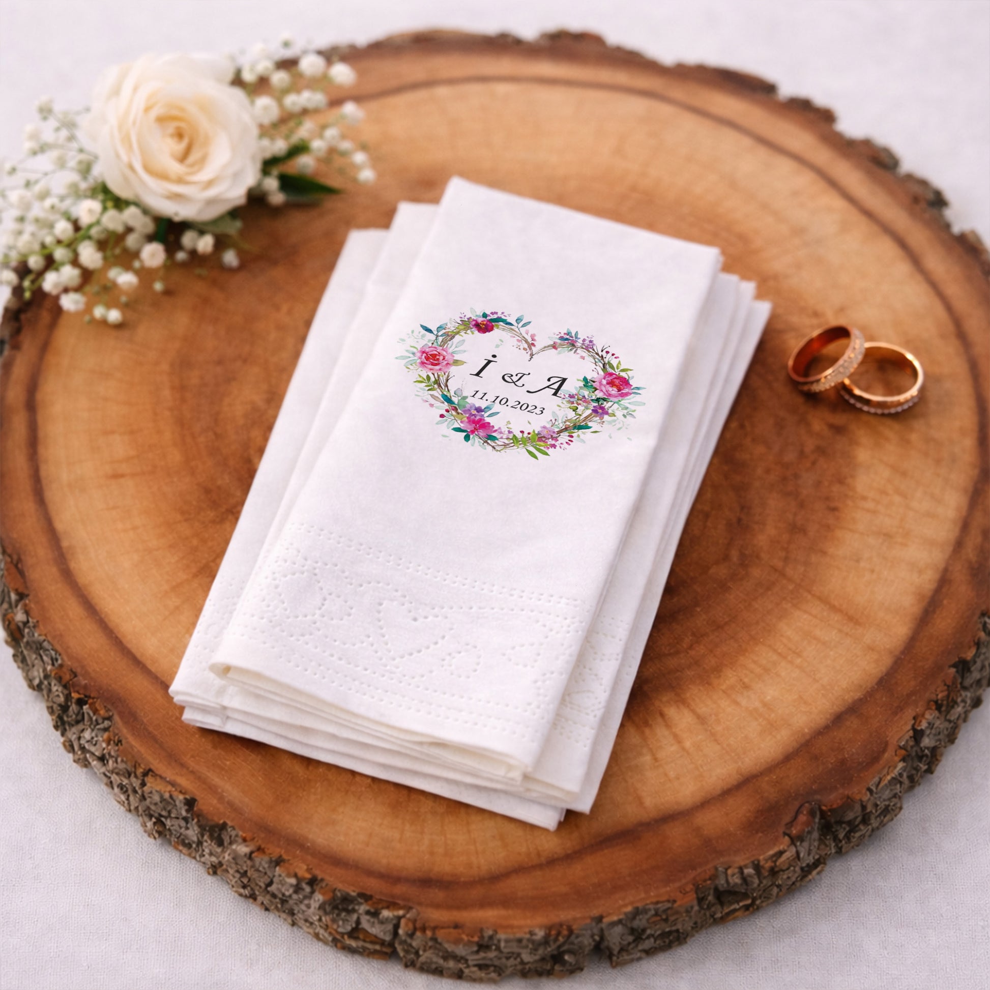 Çiçeklerden oluşan kalp çerçeveyle hazırlanan bu baskılı peçete, nişan ve düğün organizasyonları için romantik ve zarif bir görünüm sunar. İsim ve tarih detaylarıyla kişiselleştirilebilen tasarım, özel gün peçetesi olarak masalarda estetik bir bütünlük sağlar. Organizasyon peçetesi olarak hem klasik hem modern konseptlerle uyumludur. Nişan peçetesi ve düğün peçetesi olarak tercih edilebilir. Baskılı peçete kalitesi sayesinde çiçek detayları canlı ve dengelidir. Romantik, güven veren ve profesyonel bir sunum arayanlar için ideal bir üründür.