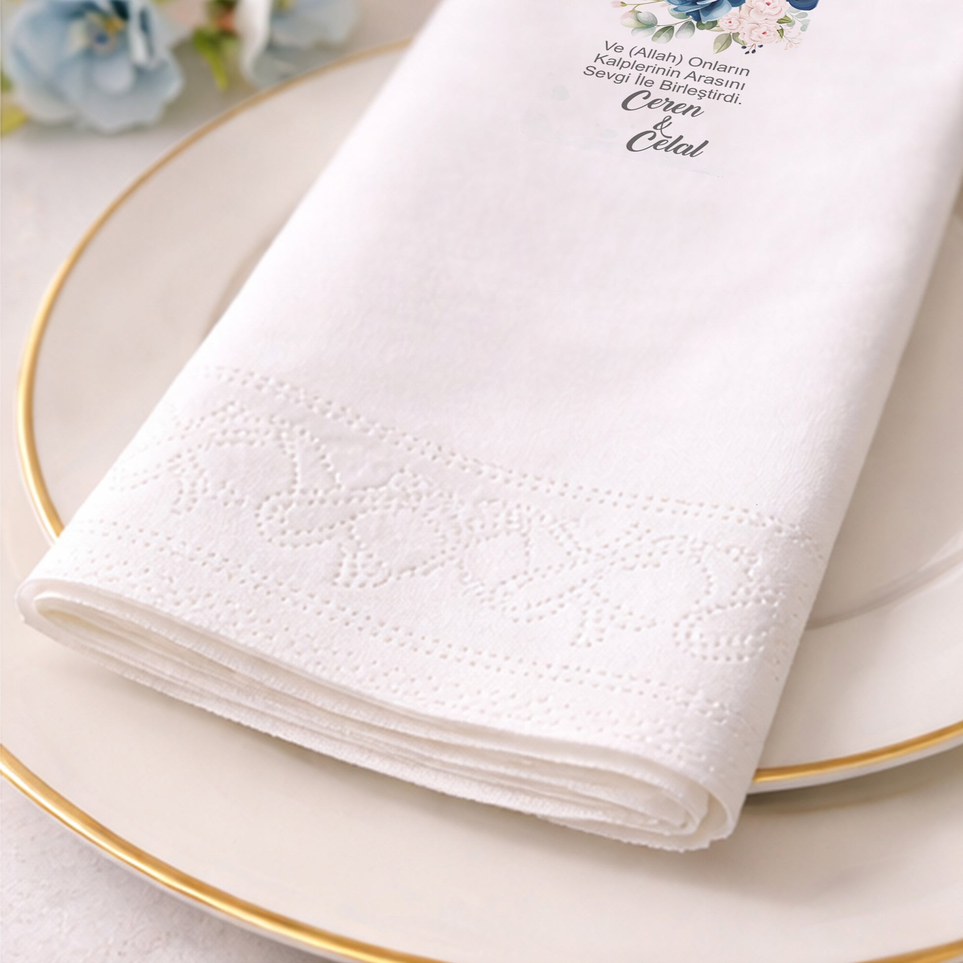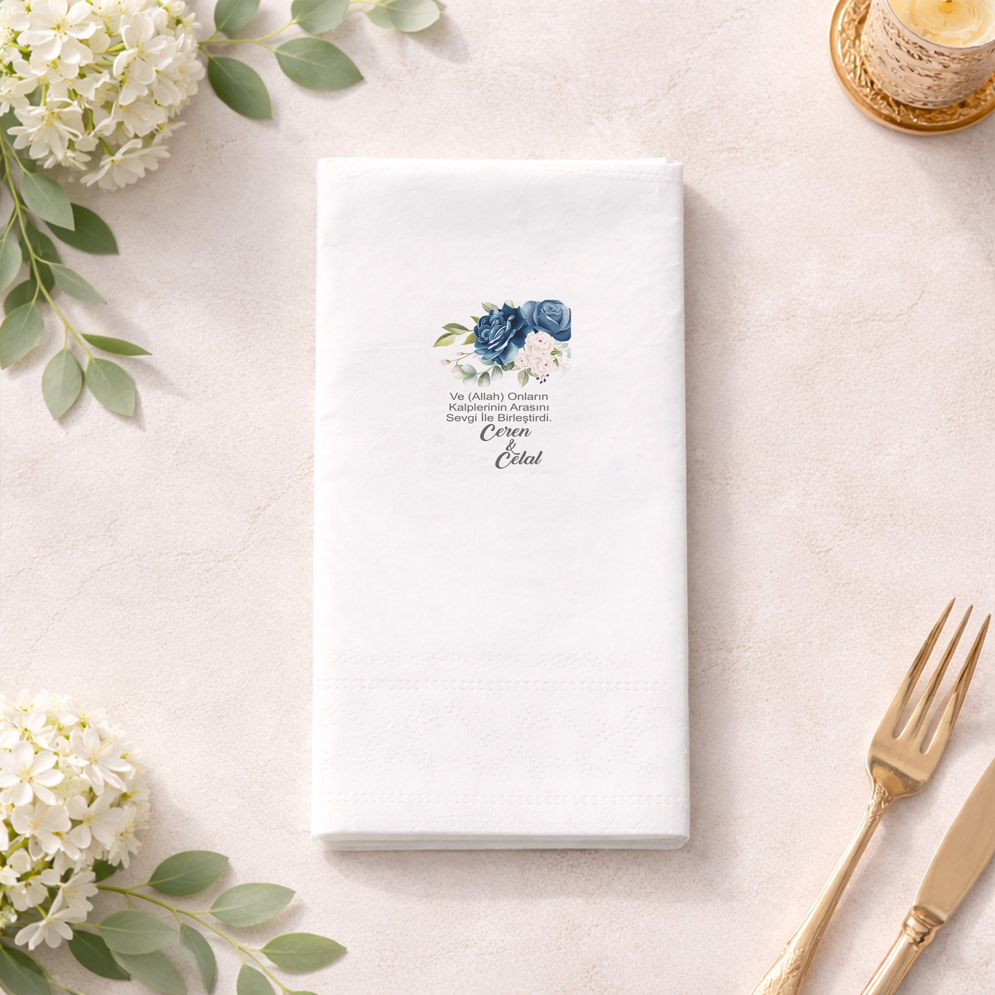 Geometrik çerçeve ve yumuşak tonlarda çiçek detaylarıyla hazırlanan bu baskılı peçete, söz ve nişan organizasyonları için romantik bir sunum sağlar. İsim ve tarih bilgisiyle kişiselleştirilen tasarım, özel gün peçetesi olarak masalara zarif bir dokunuş katar. Organizasyon peçetesi olarak düzenli ve estetik bir görünüm sunar. Nişan peçetesi ve söz peçetesi kullanımına uygundur. Baskılı peçete kalitesi, desenlerin netliğini korur. Zarif ve güven veren bir tasarım arayan çiftler için ideal bir seçenektir.