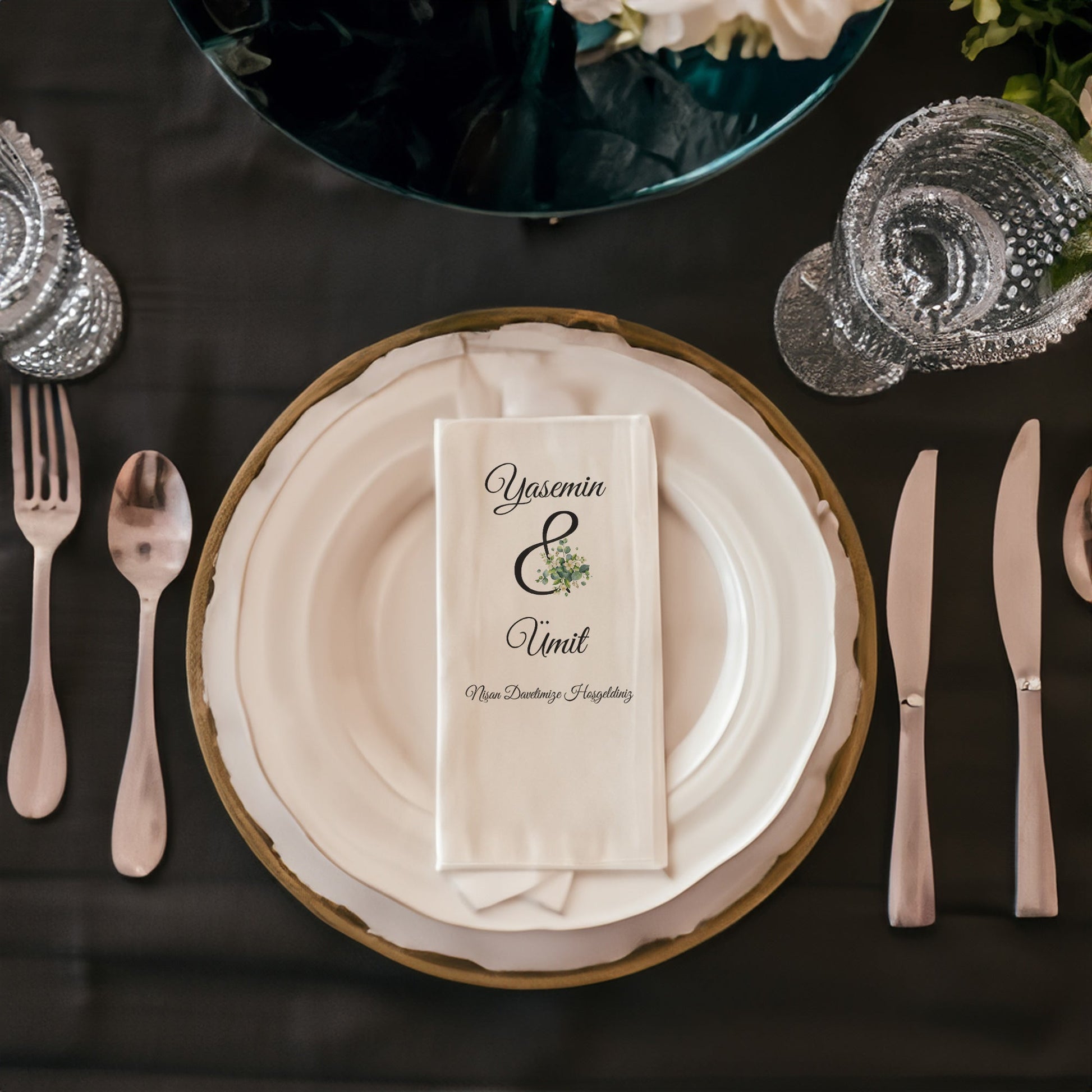 Özel günlerinizi unutulmaz kılacak zarif bir dokunuş: Çiçekli Sonsuzluk İşaretli Düğün, Nişan, Söz ve Kına Peçetesi Seti!