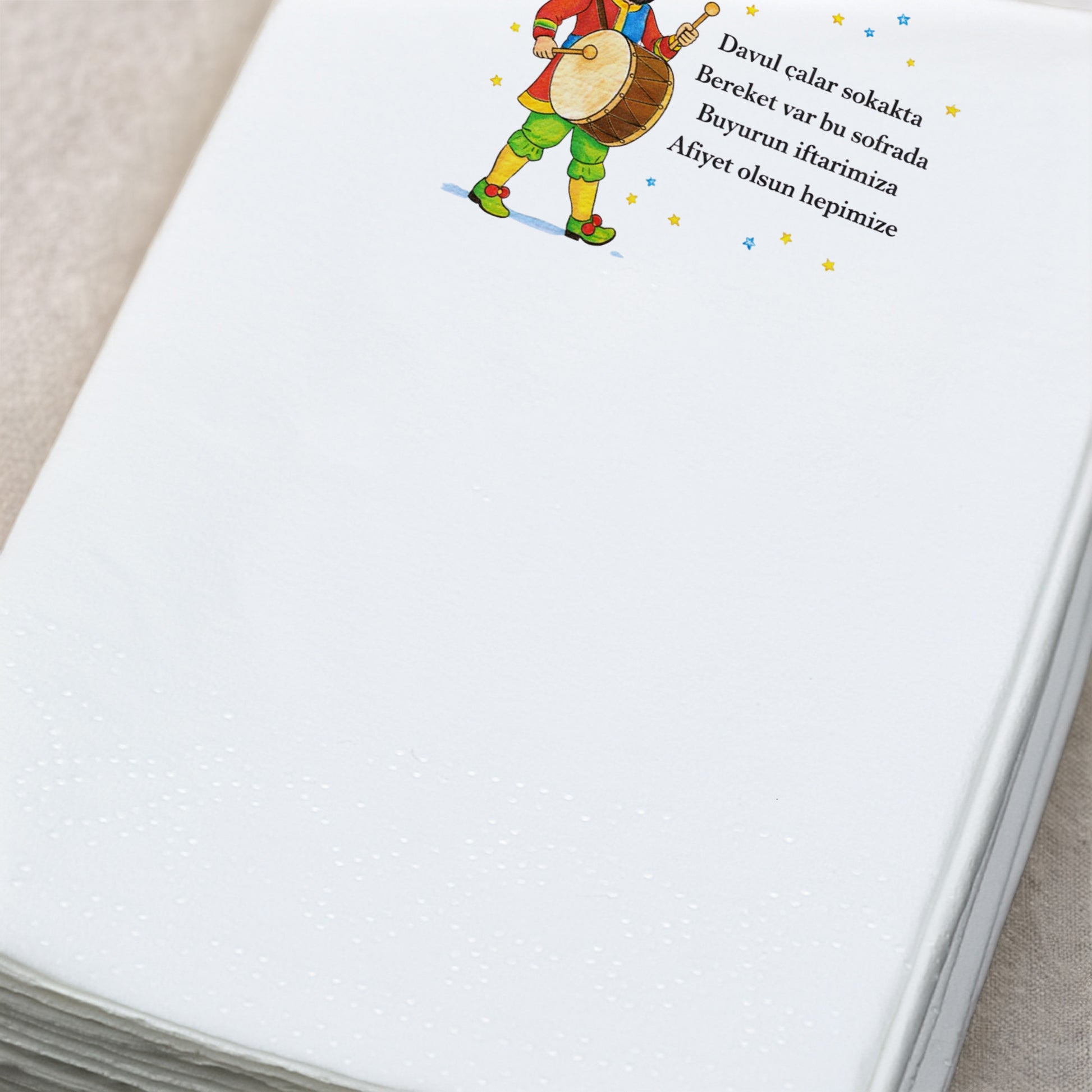 Ramazan gecelerinin vazgeçilmez simgesi davulcu, bu özel tasarım peçetede bereket ve dua ile buluşuyor.