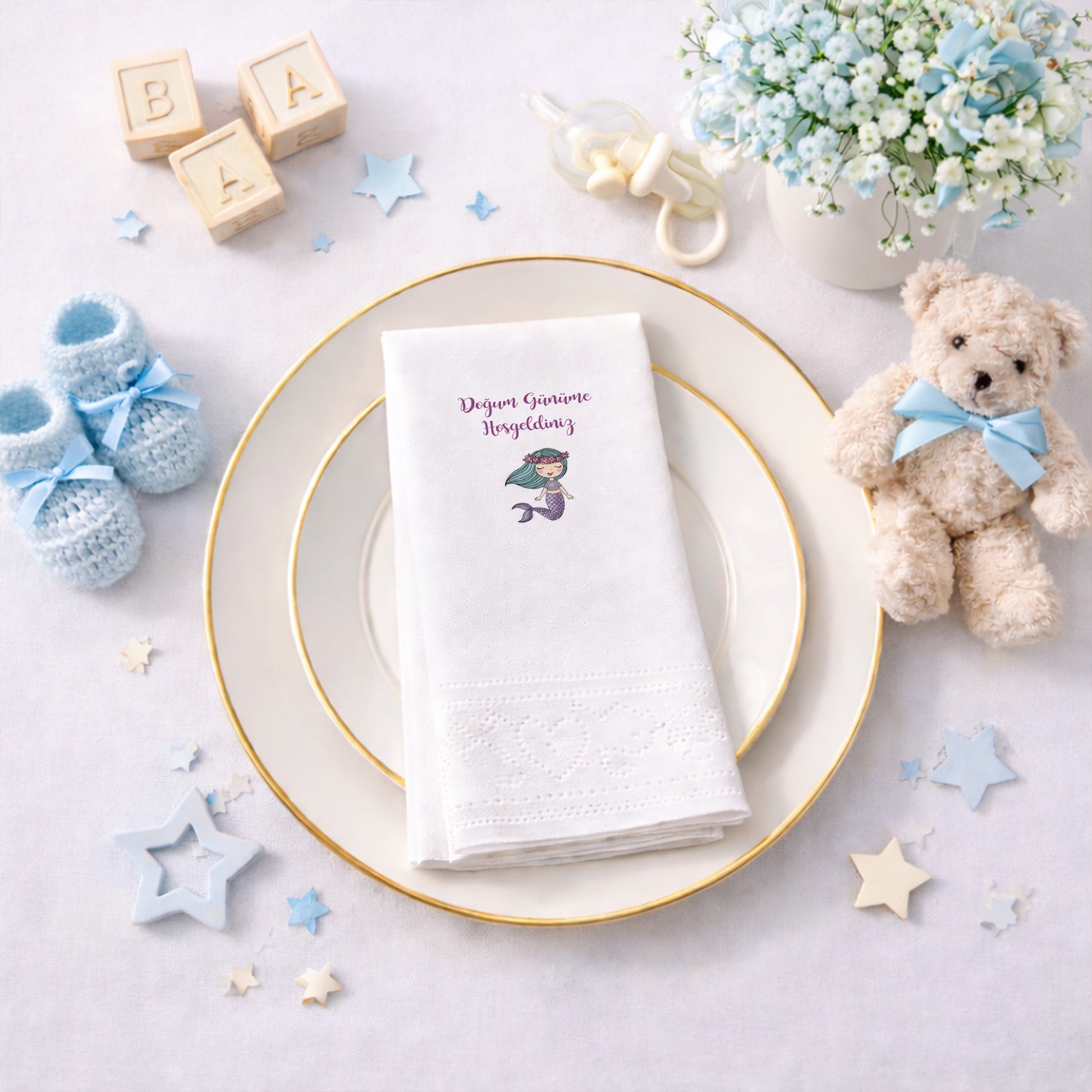 Hayallerindeki su altı dünyasını kutlamalarına taşımak isteyen çocuklar için tasarlanan bu peçete, sevimli bir deniz kızı figürüyle canlandırılmıştır. Pastel gri zemin üzerine mor ve lila tonlarıyla işlenen "Doğum Günüme Hoş Geldiniz" yazısı, zarif bir karşılama mesajı içerir. Deniz kızı temalı partilerin vazgeçilmezi olan bu ürün, masanıza mistik ve modern bir hava katar. Yumuşak dokulu, cilde dost yapısı ve canlı renkleriyle hem ebeveynlerin hem de çocukların beğenisini toplar. Özel günlerde sofra düzeninde fark yaratmak isteyenler için ideal olan bu model, kaliteli baskısıyla uzun süre formunu korur. Küçük prenseslerin doğum günü kutlamalarını bir peri masalına dönüştüren bu tasarım, sunumlarınıza şık bir imza atar.