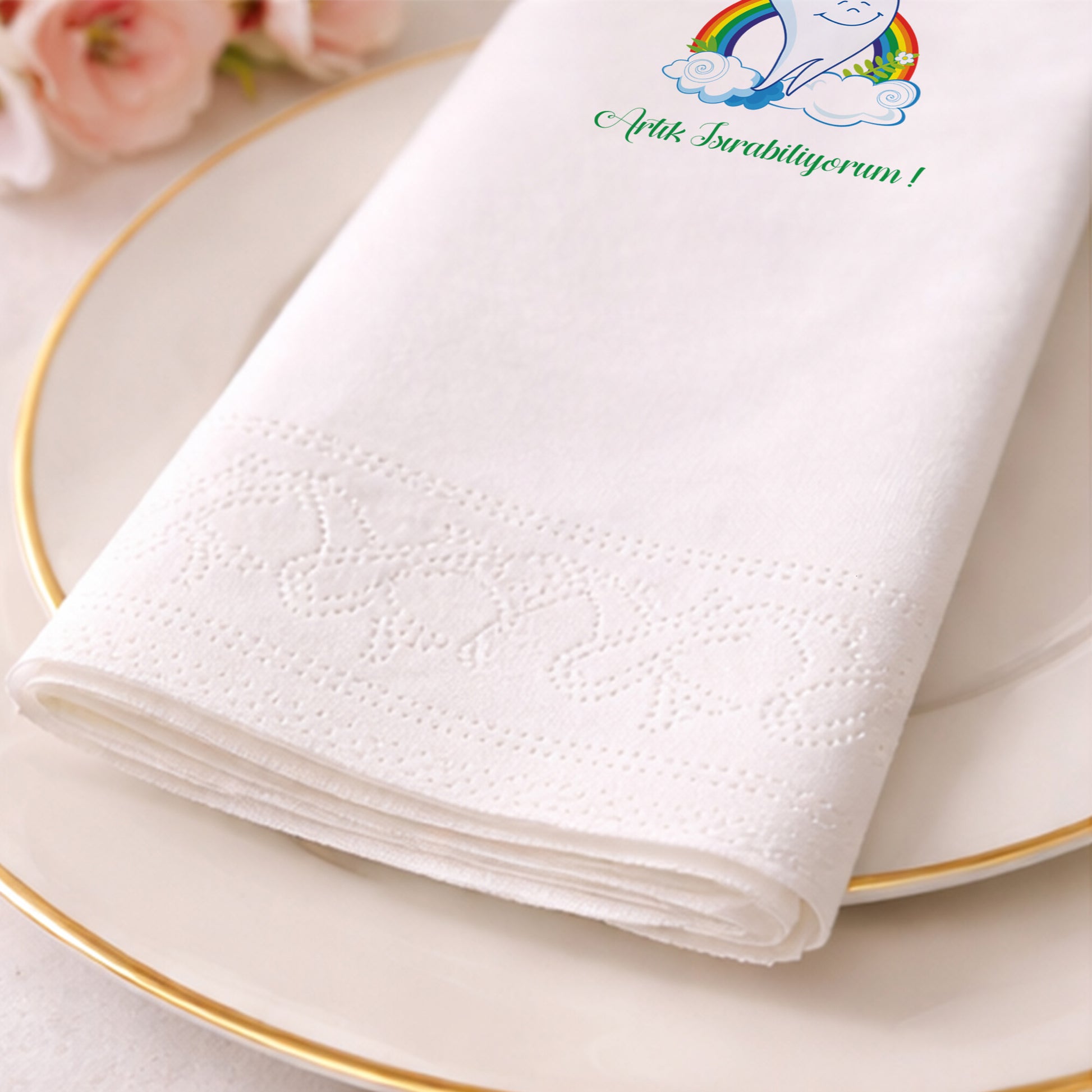 Tasarım, peçetenin ön yüzünde tam merkezde olacak şekilde yüksek çözünürlüklü baskı ile uygulanır. Dilersen özel konumlandırma taleplerini de iletebilirsin.