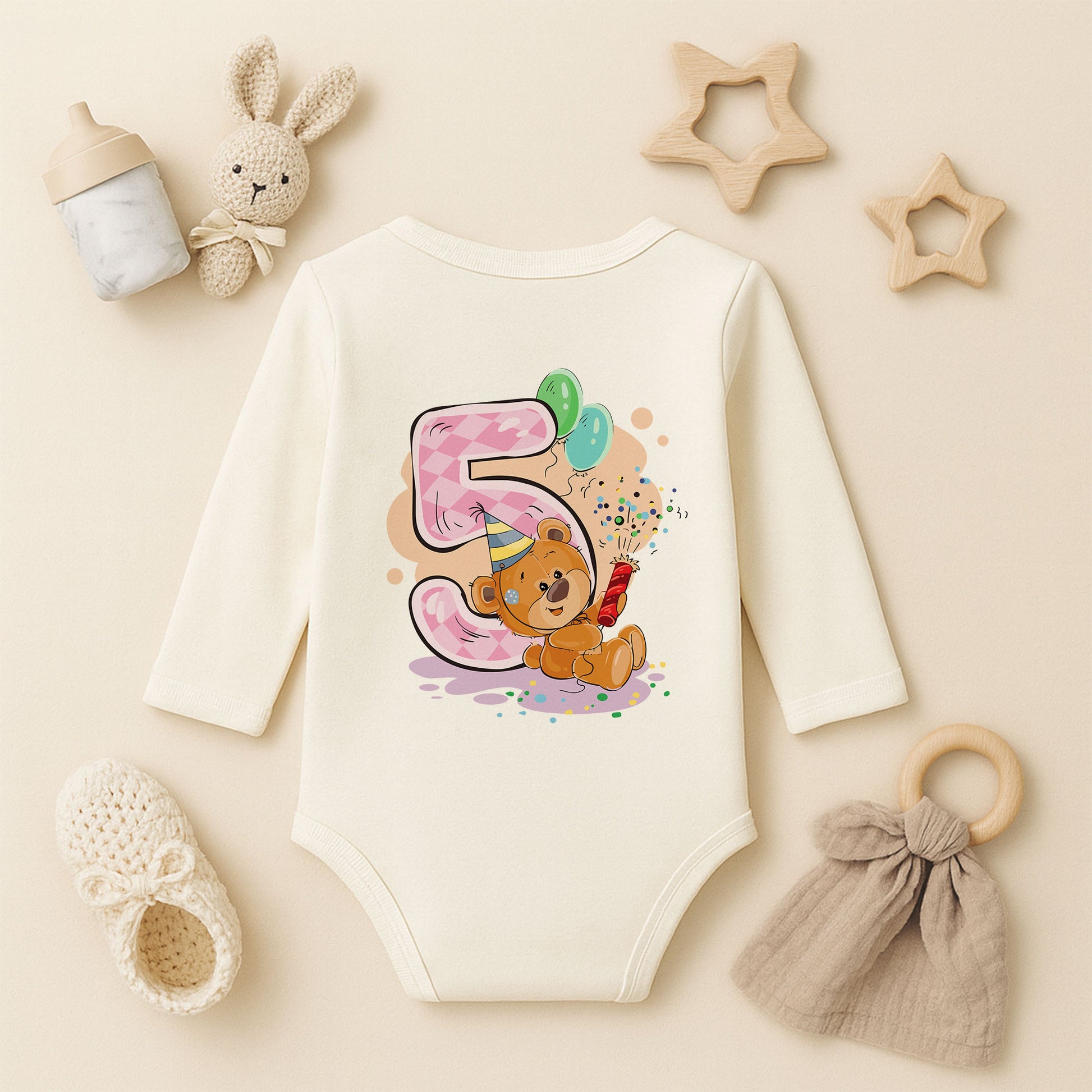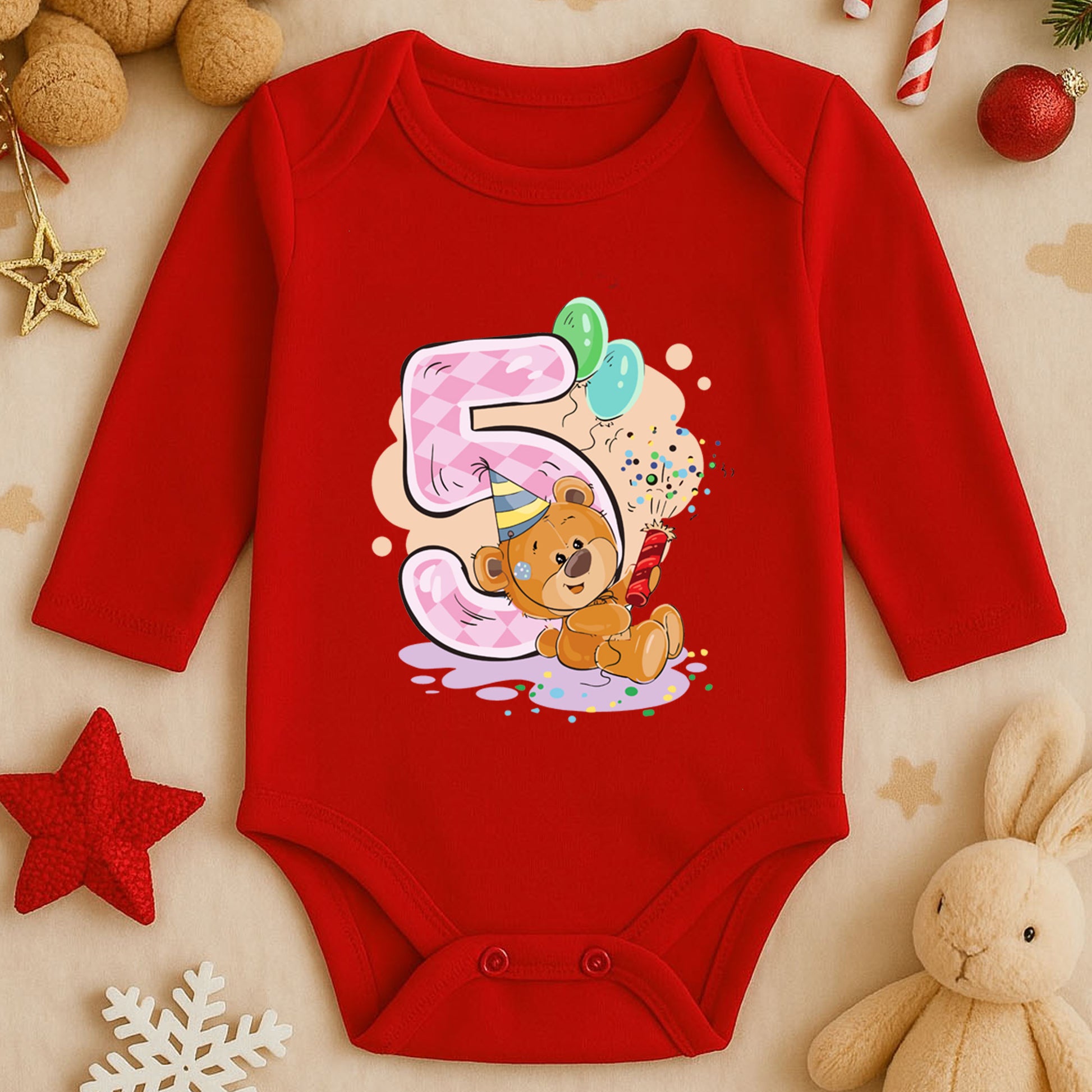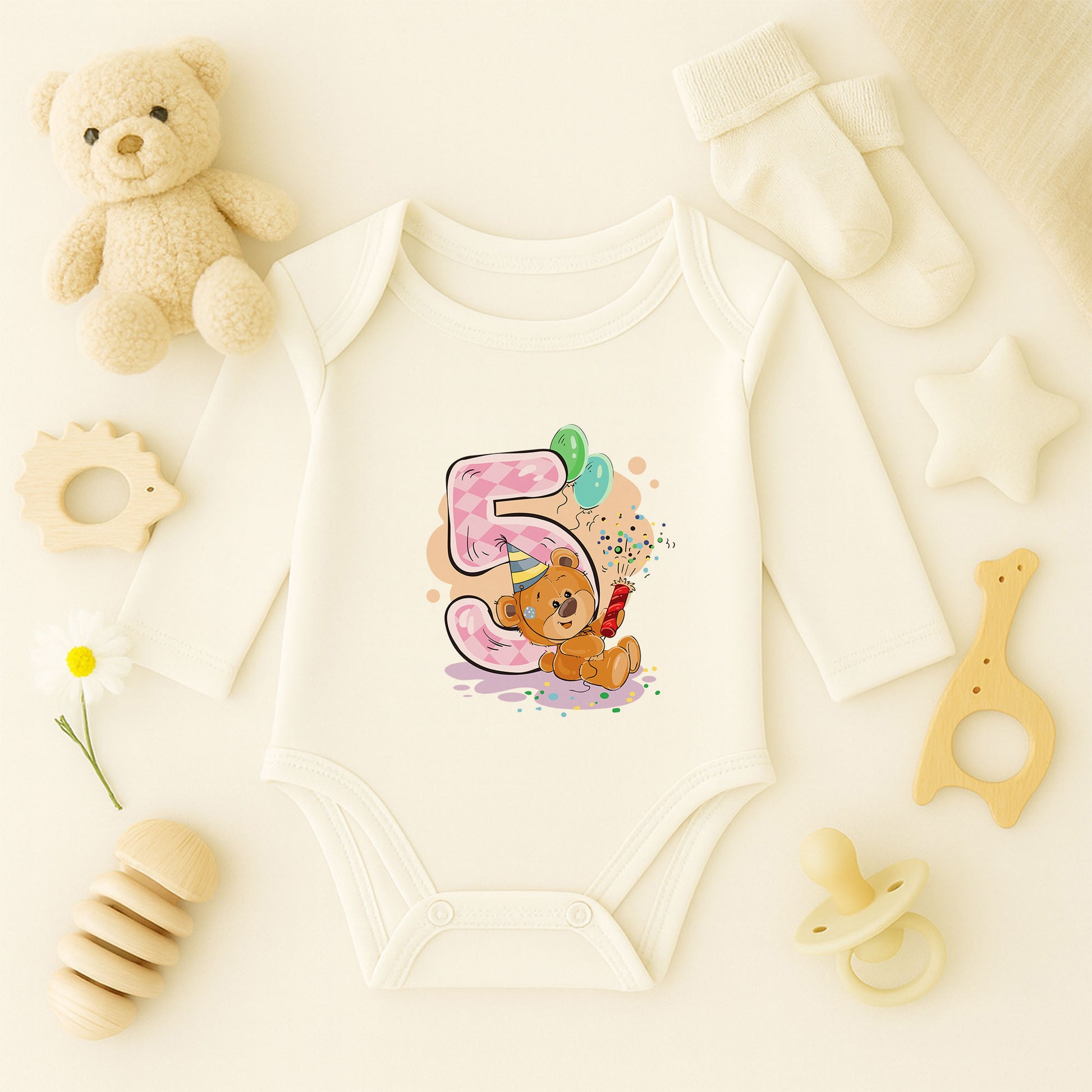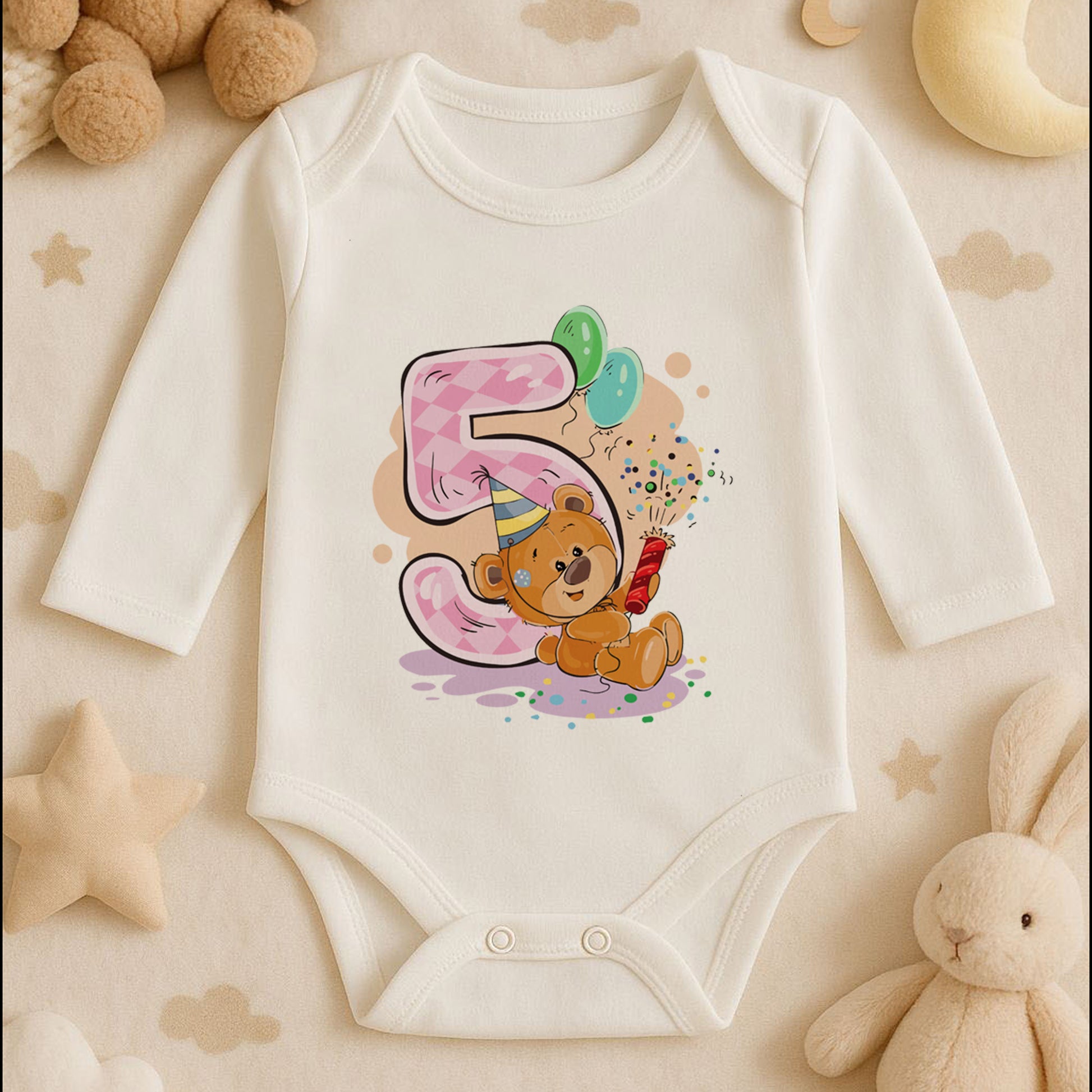 Kişiye Özel Doğum Günü Bebek Zıbını – 5 Yaş Ayıcık Tasarım | 1–36 Ay