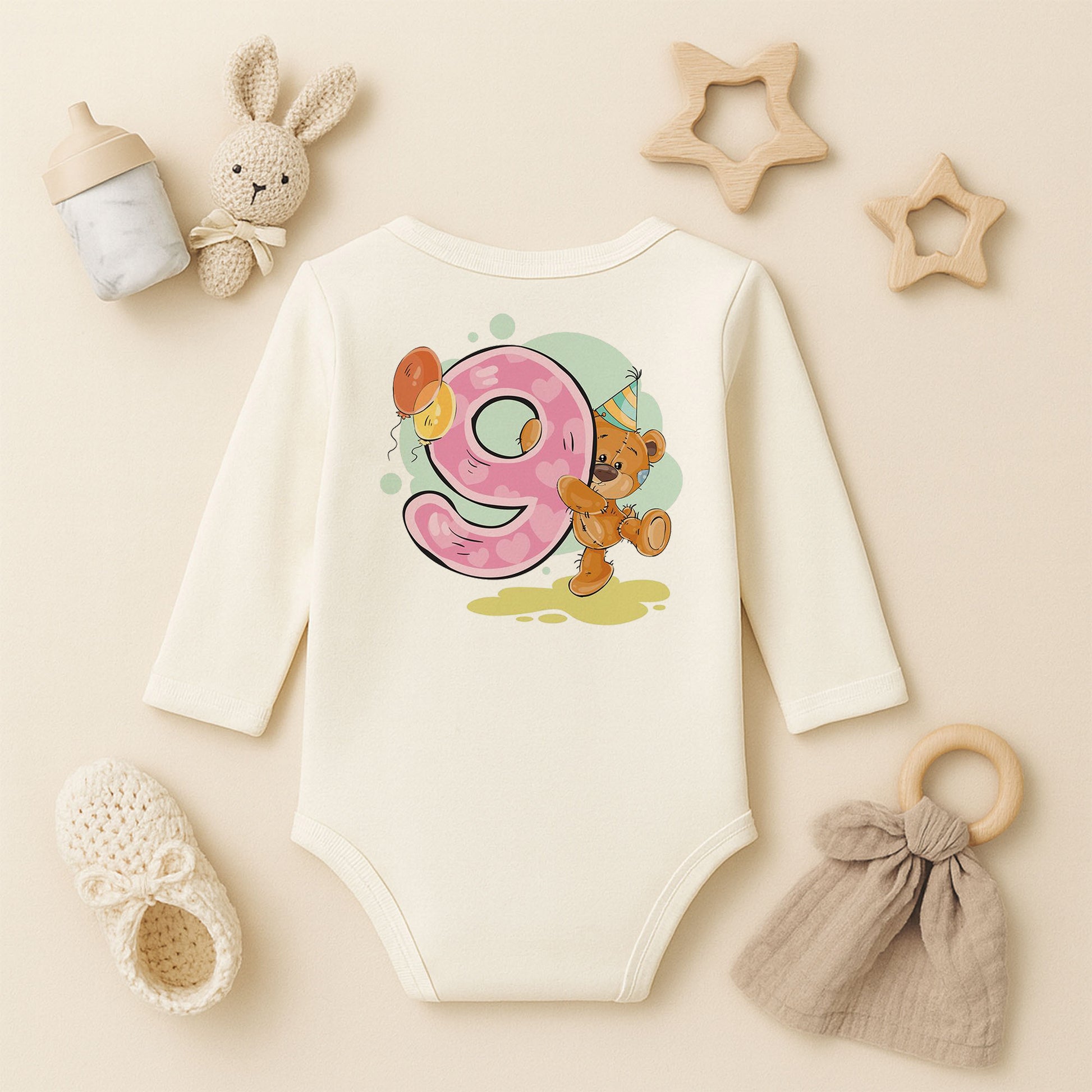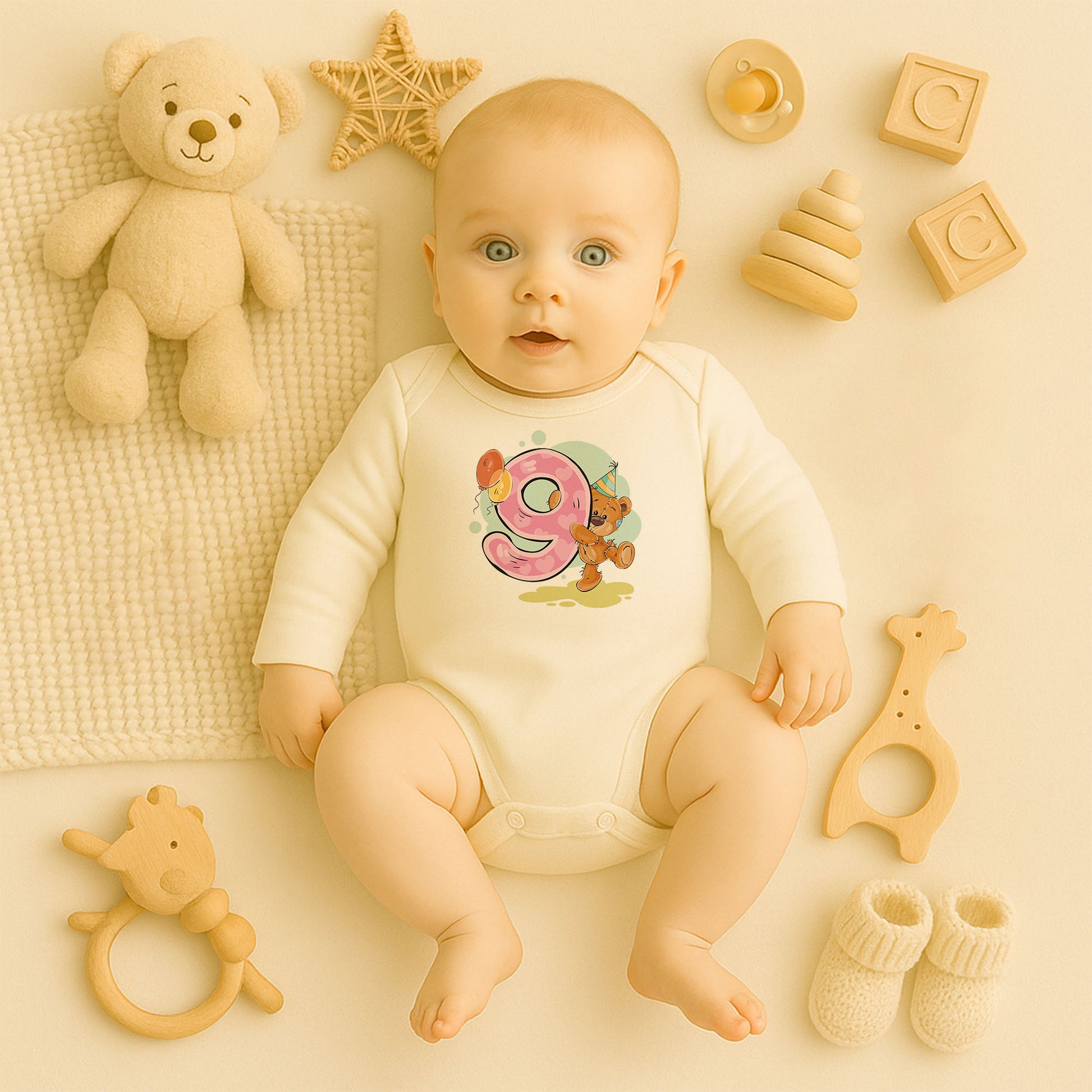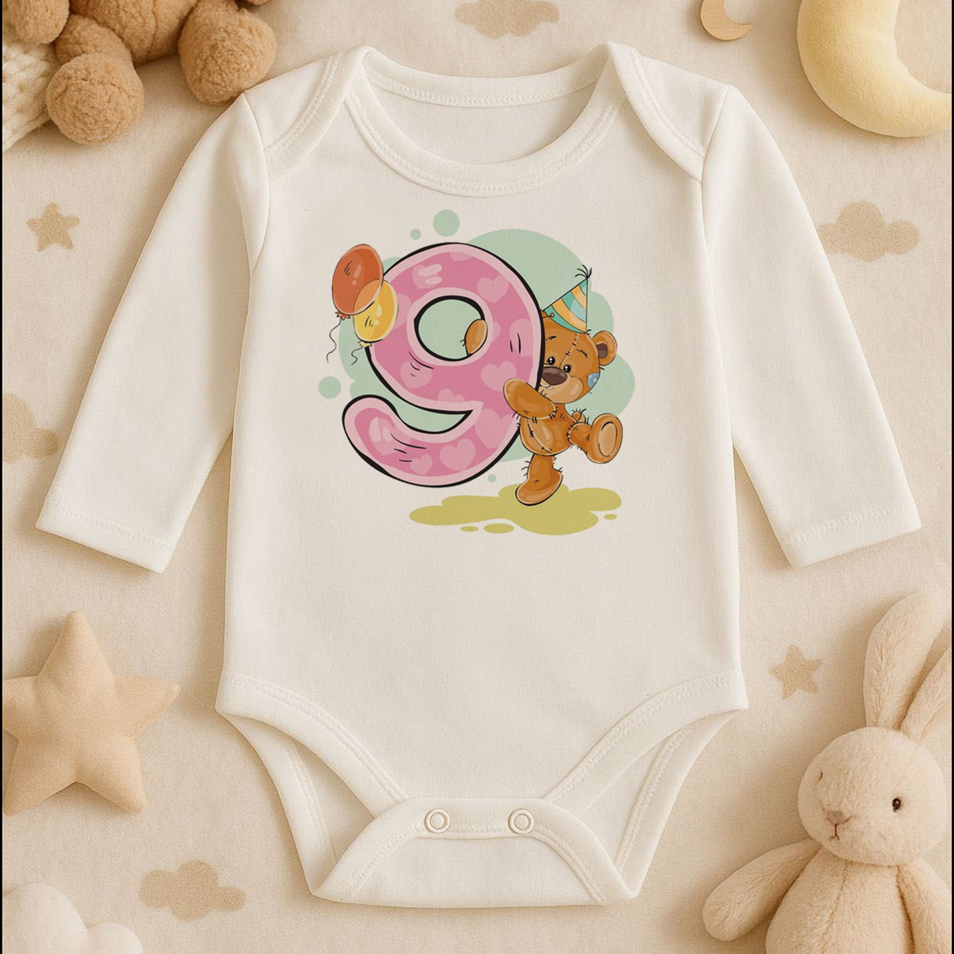 Kişiye Özel Doğum Günü Bebek Zıbını – 9 Yaş Ayıcık Tasarım | 1–36 Ay