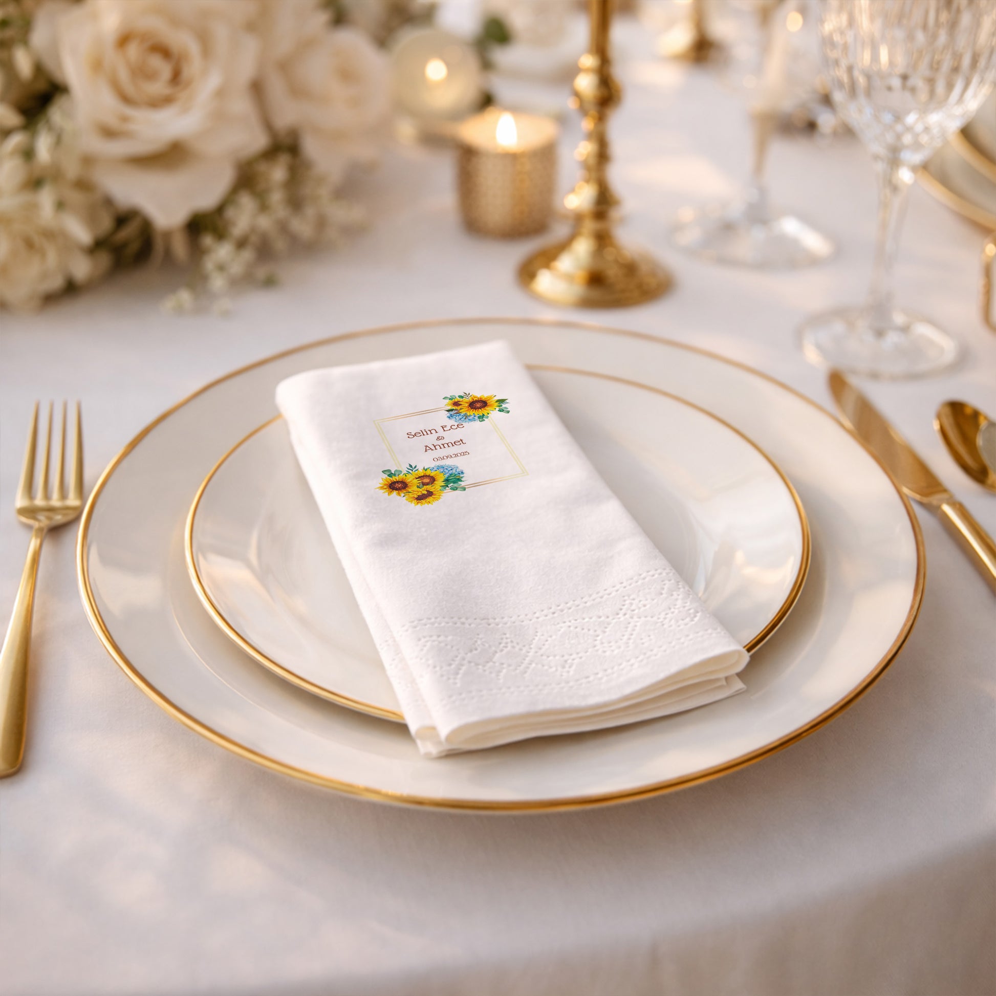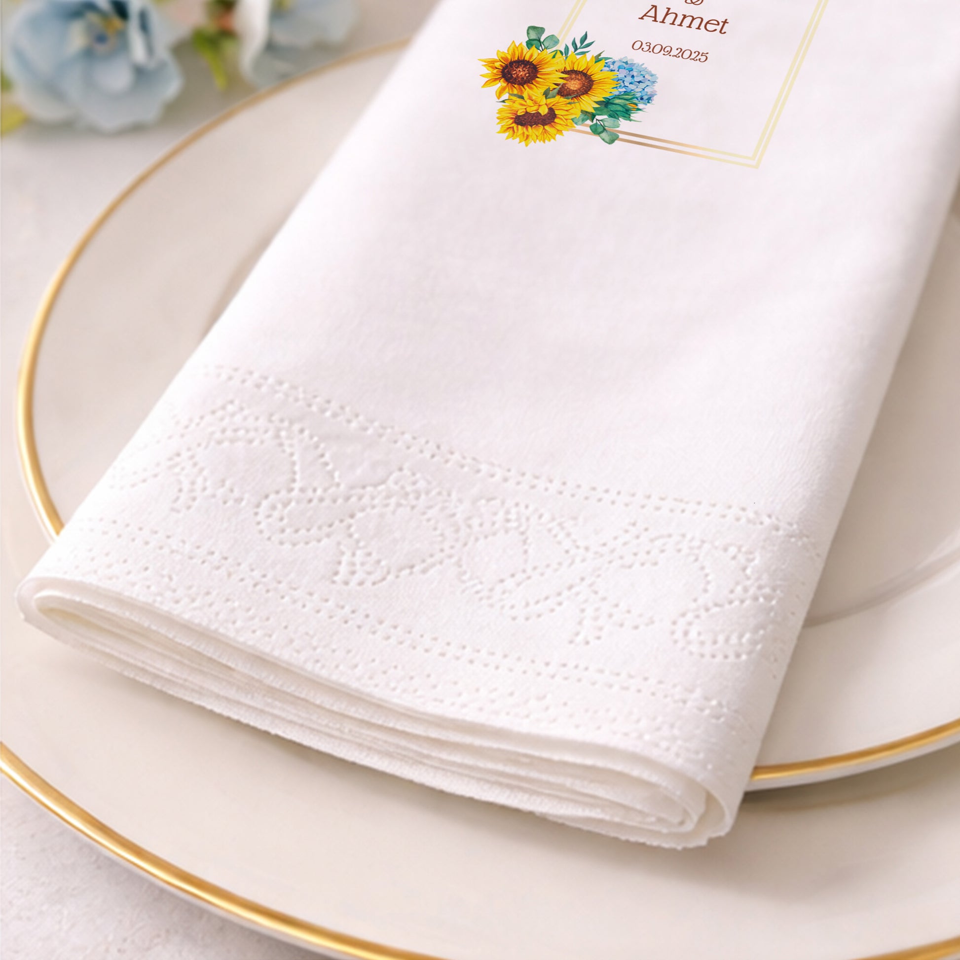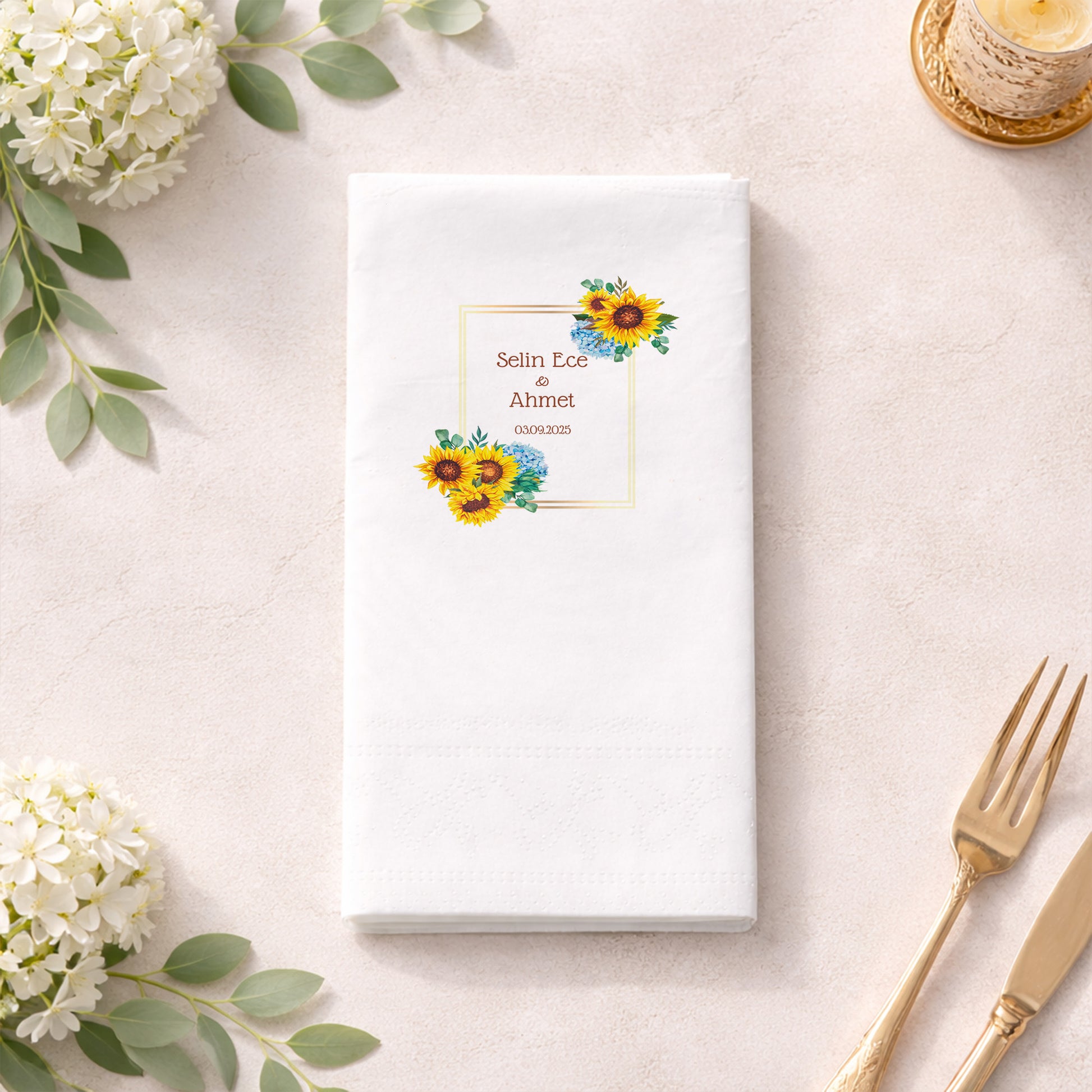 Düğün, nişan ve kına gibi hayatınızın en özel günlerinde kullanılan detaylar, davetinizin ruhunu yansıtır. Çiçek temalı ve isimli olarak hazırlanan bu baskılı peçete, organizasyonlarınıza sıcak, samimi ve romantik bir hava katar. Ayçiçeği ve zarif çiçek illüstrasyonlarıyla tasarlanan bu ürün, doğallığı seven çiftler için özel olarak hazırlanmış şık bir özel gün peçetesidir.