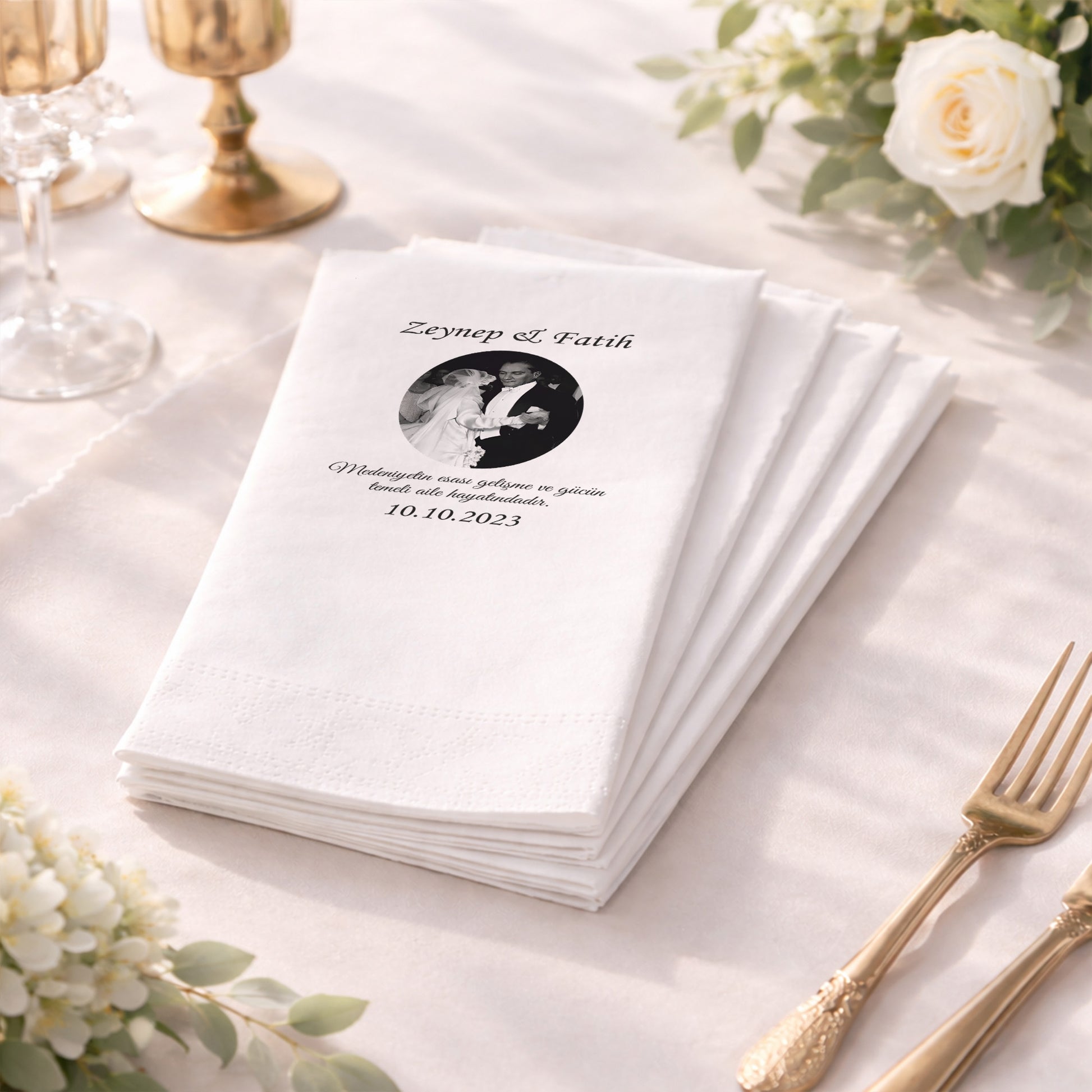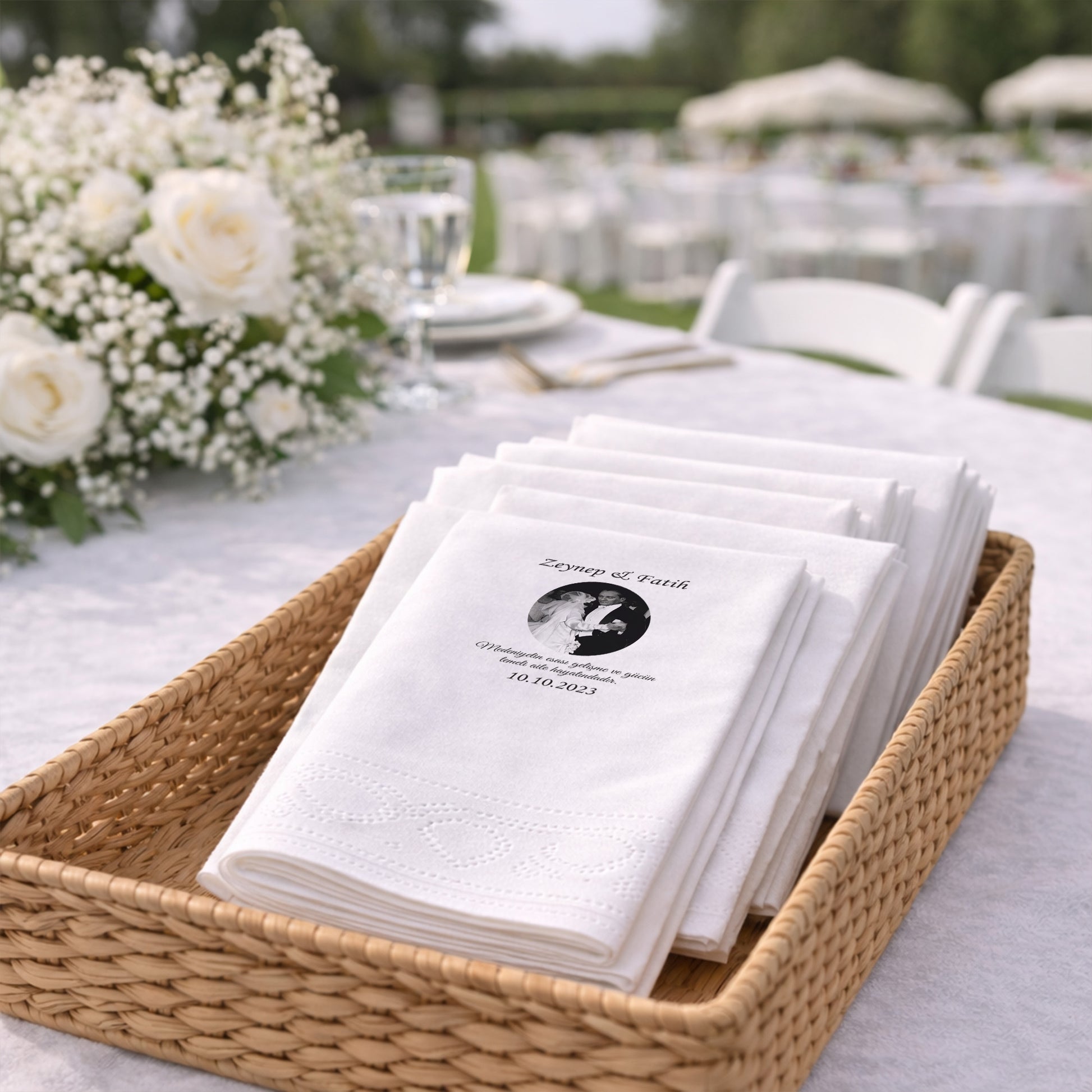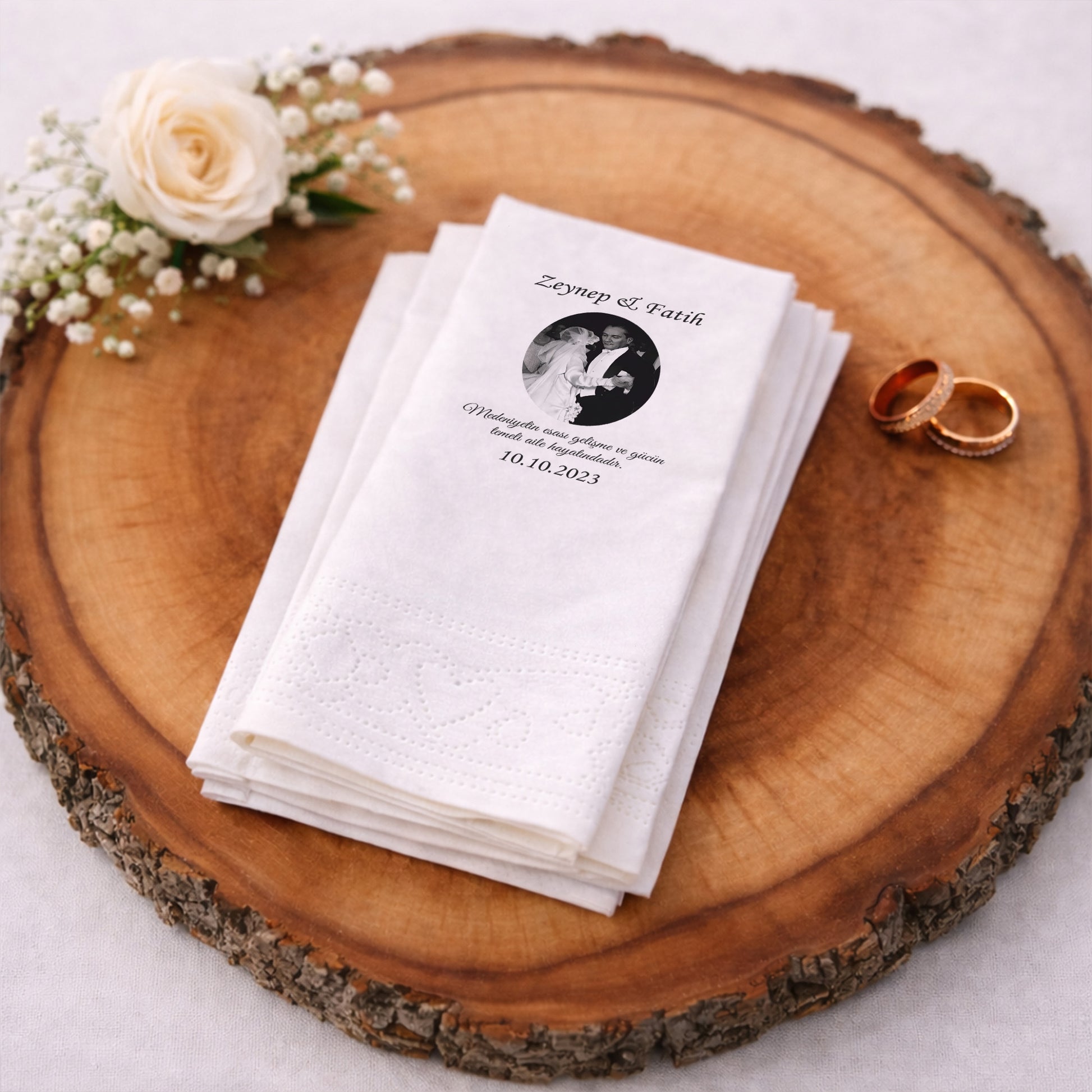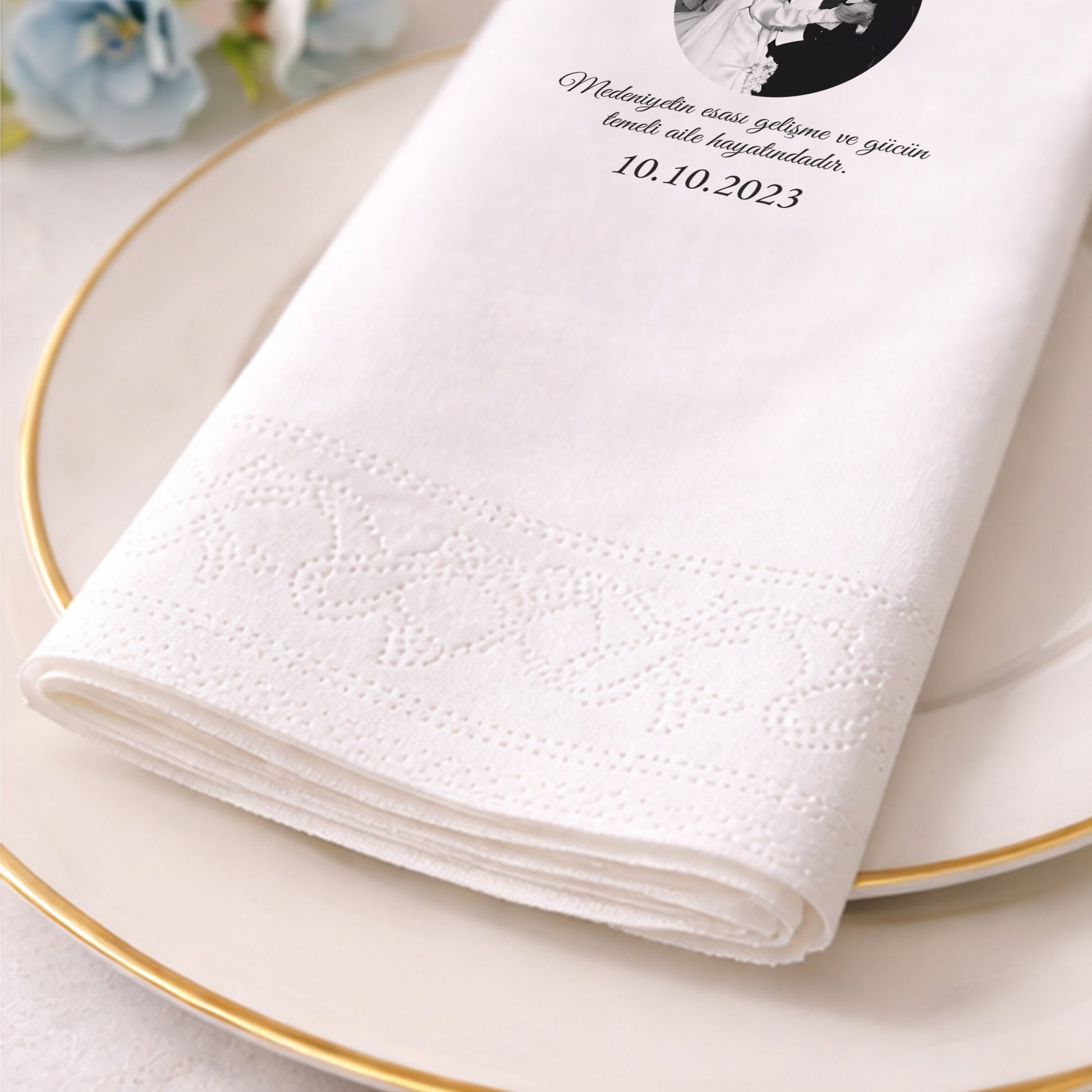 Düğün peçetesi olarak kullanıldığında, gelin ve damadın fotoğrafı, isimleri ve tarih bilgisi ile davetlilere unutulmaz bir masa deneyimi sunar. Nikah sonrası yemekler, salon düğünleri, kır düğünleri ve özel davet masalarında konsepti güçlendirir. Fotoğraflı tasarımı sayesinde düğününüzden kalıcı bir hatıra olarak da saklanabilir.