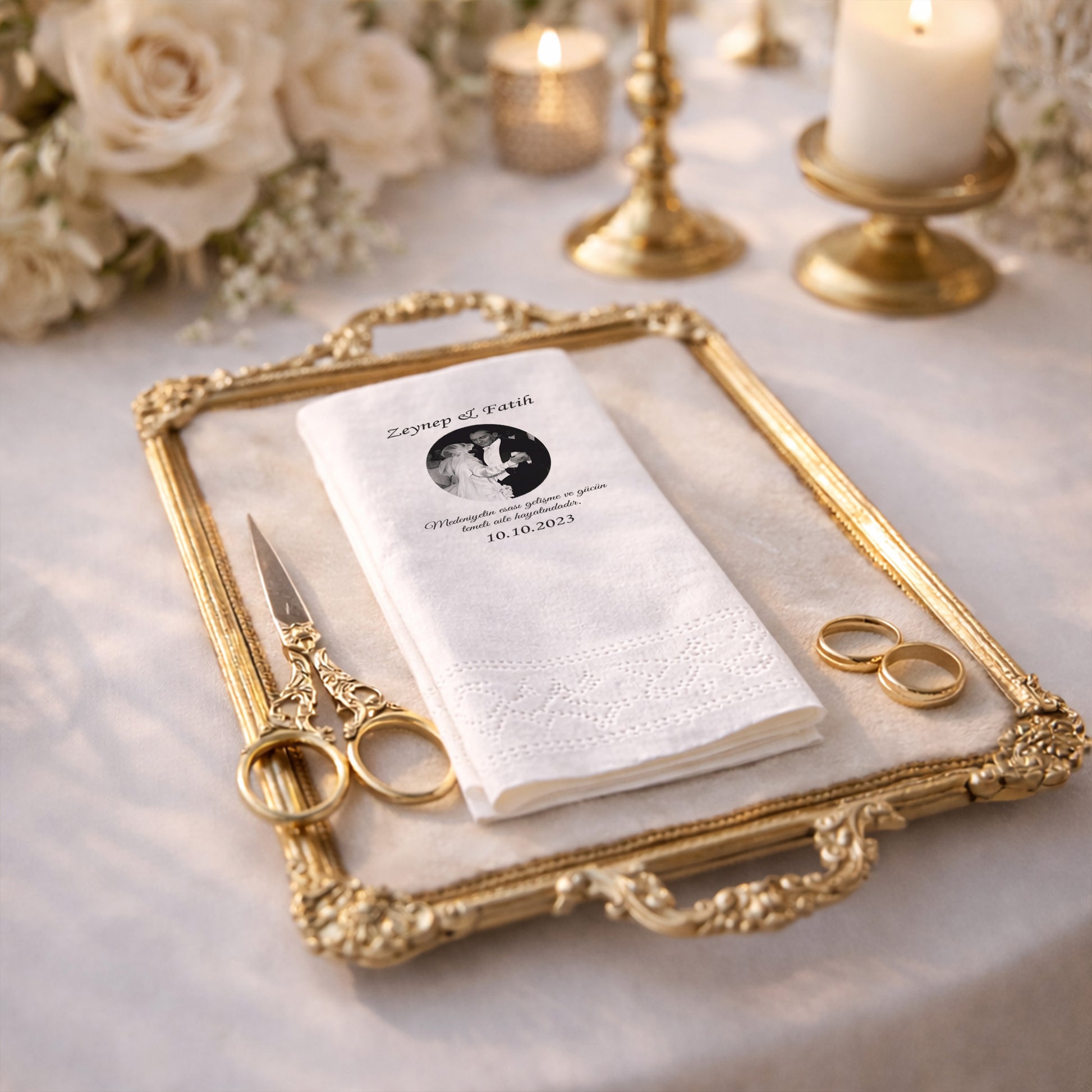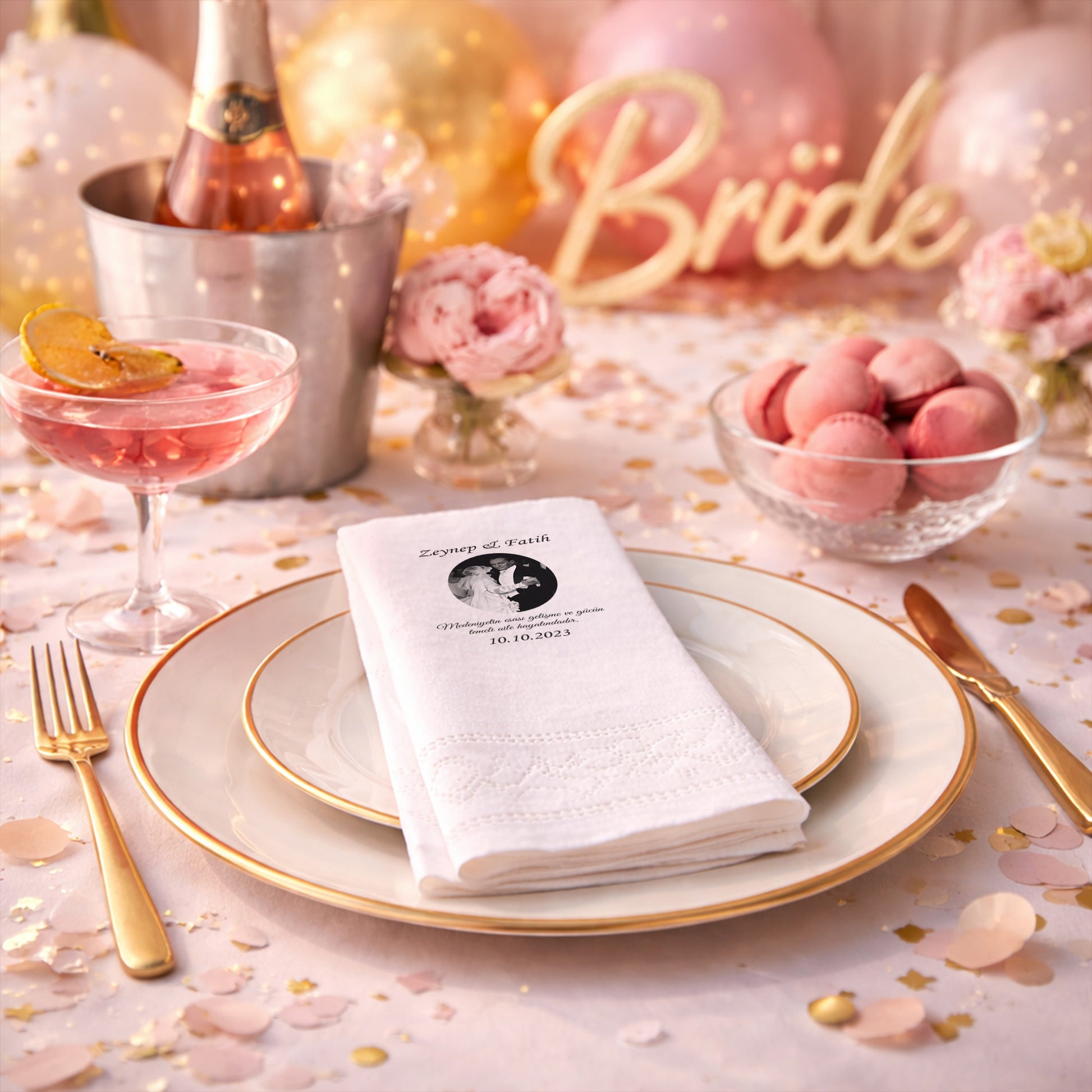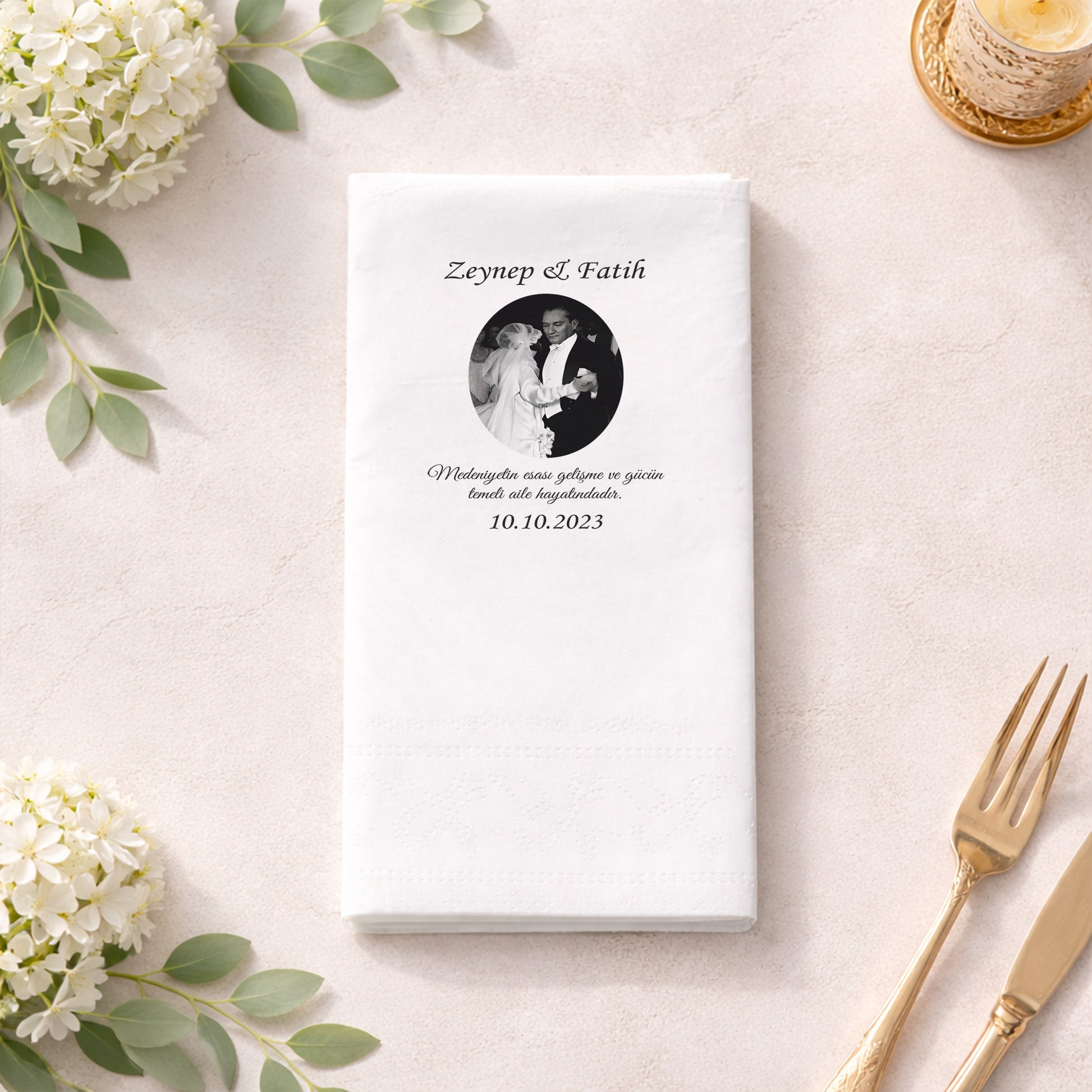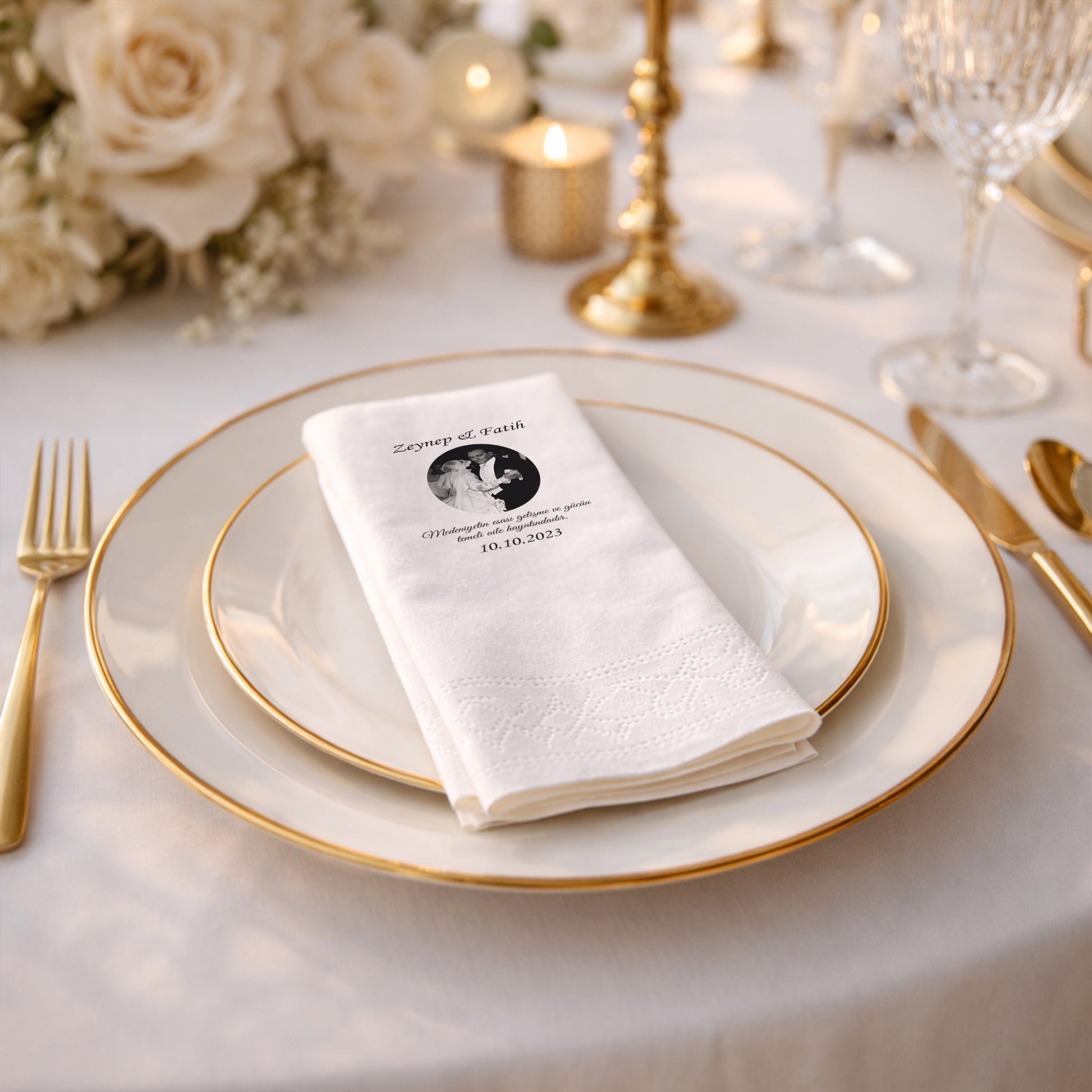 Düğün peçetesi olarak kullanıldığında, gelin ve damadın fotoğrafı, isimleri ve tarih bilgisi ile davetlilere unutulmaz bir masa deneyimi sunar. Nikah sonrası yemekler, salon düğünleri, kır düğünleri ve özel davet masalarında konsepti güçlendirir. Fotoğraflı tasarımı sayesinde düğününüzden kalıcı bir hatıra olarak da saklanabilir.