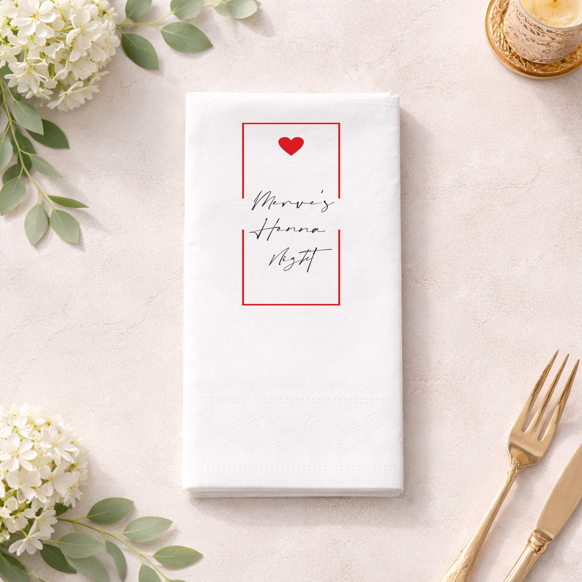 Peçeteler kaliteli, yumuşak dokulu ve emici yapıdadır. Kırmızı çerçeve, yazı ve kalp detayı net, temiz ve akma yapmayan baskı tekniğiyle uygulanır. Baskılar solmaz, organizasyon süresince formunu korur ve masa üzerinde modern bir görünüm sunar. Hem görsel hem de kullanım açısından güven veren bir baskılı peçete deneyimi sağlar.