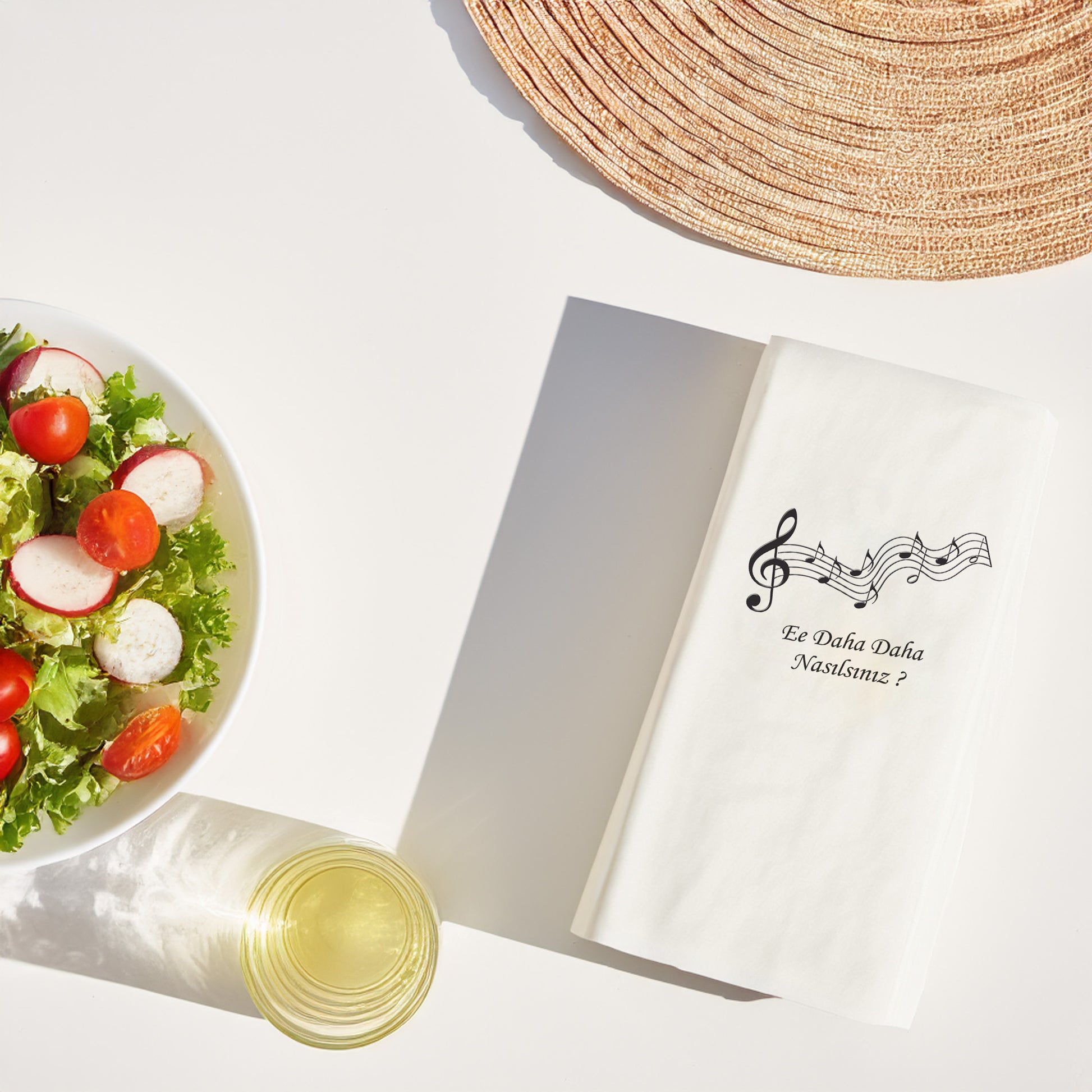 Tasarım, peçetenin ön yüzünde tam merkezde olacak şekilde yüksek çözünürlüklü baskı ile uygulanır. Dilersen özel konumlandırma taleplerini de iletebilirsin.