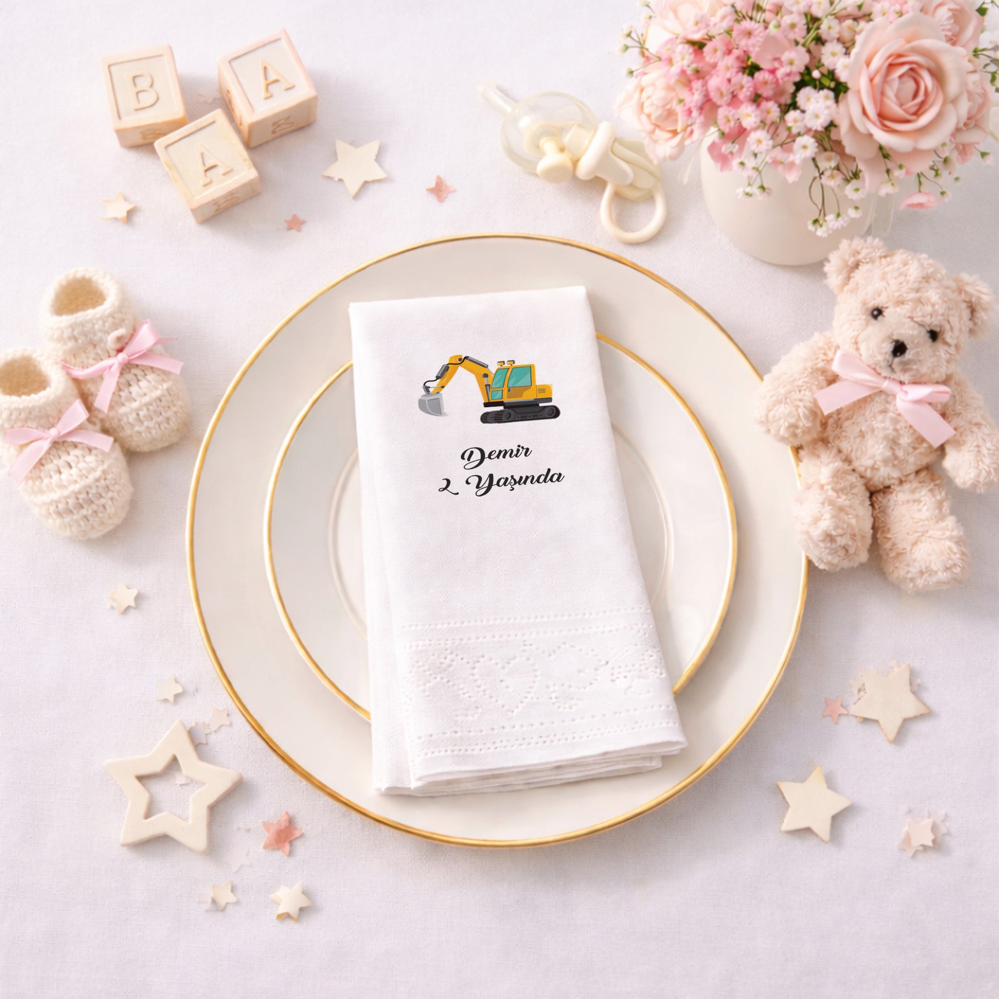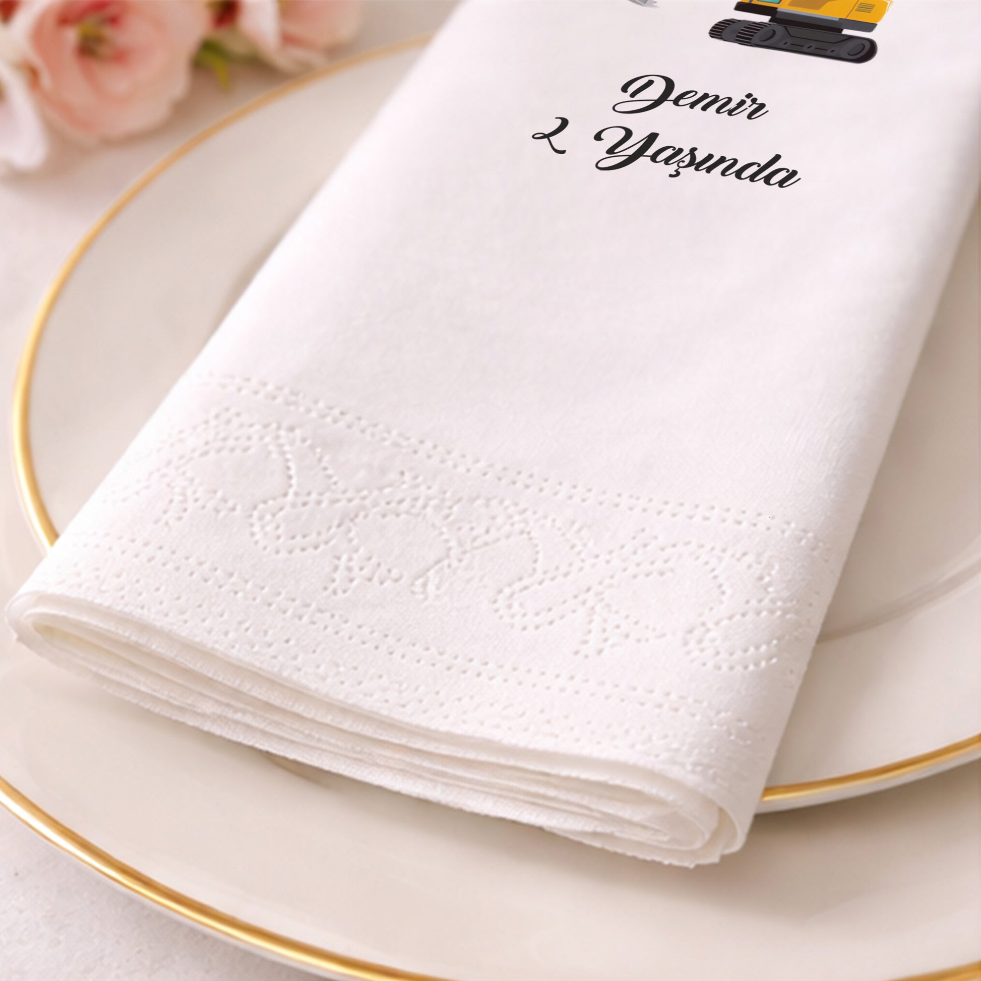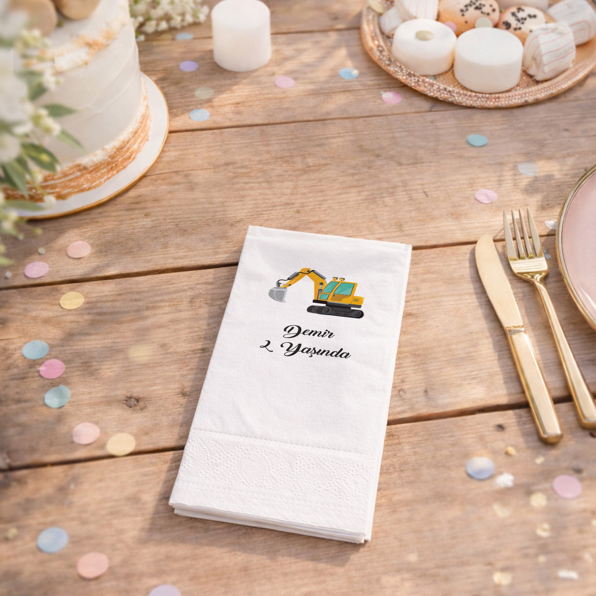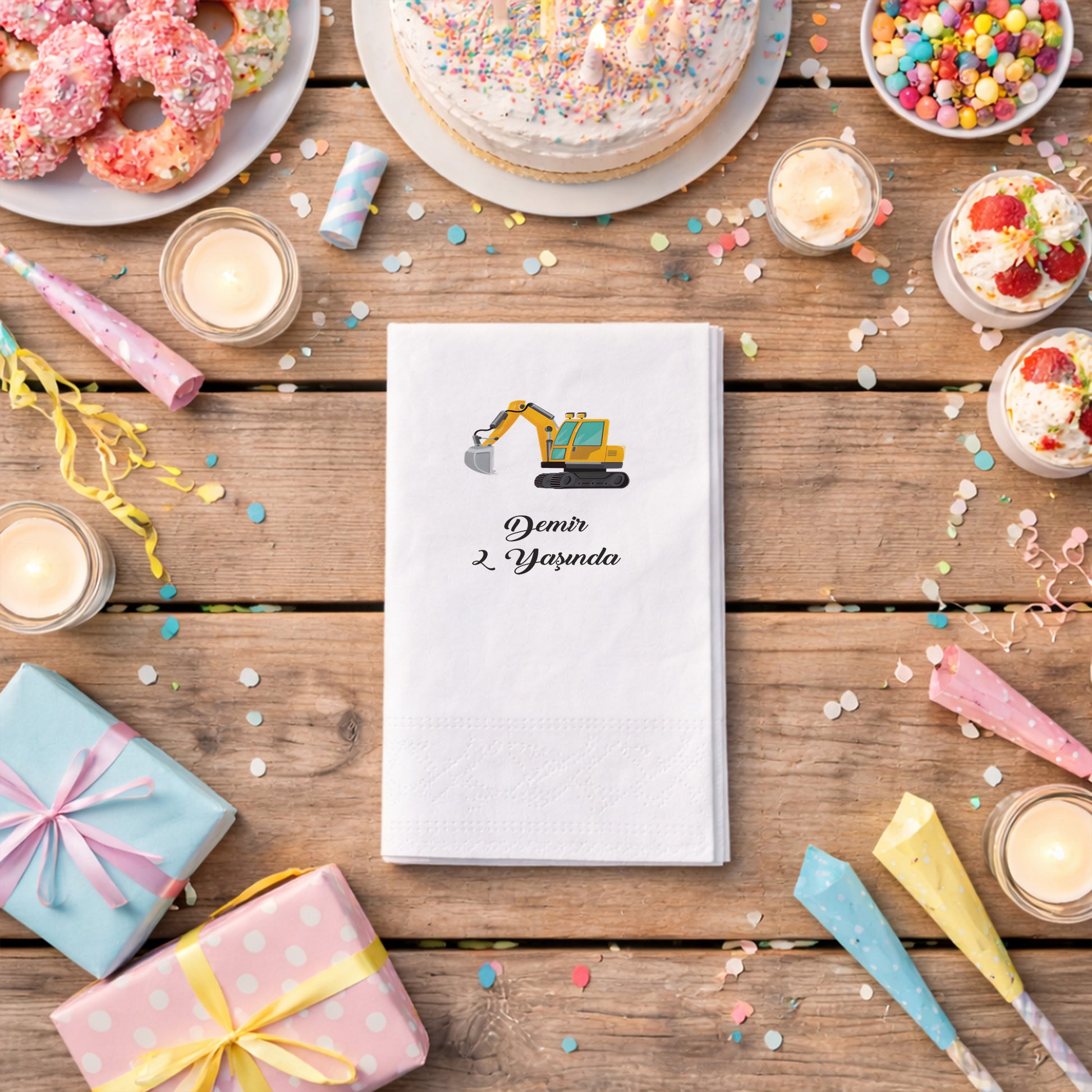 Ekskavatör illüstrasyonu ile tasarlanan bu peçete, inşaat araçlarını seven çocuklar için eğlenceli bir masa detayı sunar. Kişiye özel isim ve yaş bilgisi eklenerek hazırlanan tasarım, doğum günü organizasyonunu daha anlamlı hale getirir. Yumuşak dokulu, çift katlı yapısı sayesinde kullanımı rahattır. Gıda temasına uygun baskı ile üretilmiştir. Pasta ve ikram sunumlarında konsepti güçlendirir. Evde yapılan kutlamalardan temalı organizasyonlara kadar geniş bir kullanım alanına sahiptir. Erkek çocuk doğum günleri için enerjik ve uyumlu bir masa görünümü oluşturur.
